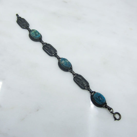 Egyptian Revival Faïence Scarab and Cartouche Bracelet Silver c. 1970's
