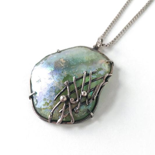 Vintage Studio Iridescent Enamel Sea Glass Pendant Sterling c. 1990
