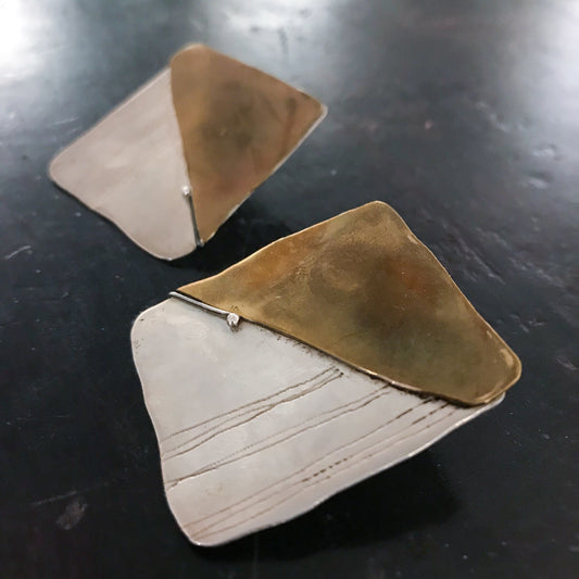 Post-Modern Large Earrings Sterling, Brass and 14k c. 1990