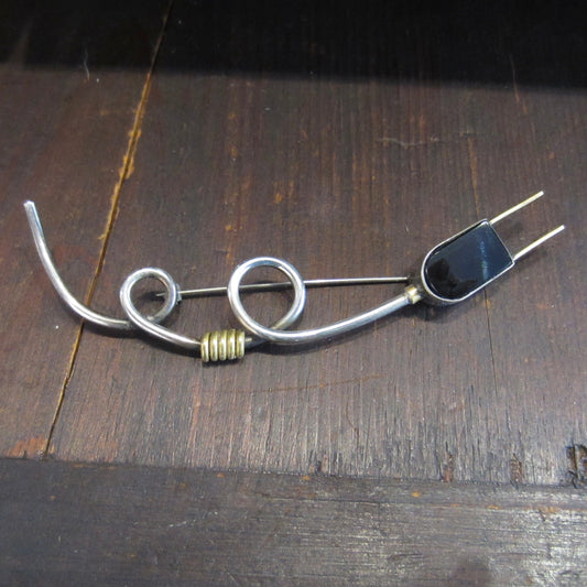 SOLD--Post Modern Mexican Onyx Plug Brooch Sterling and Brass c. 1980