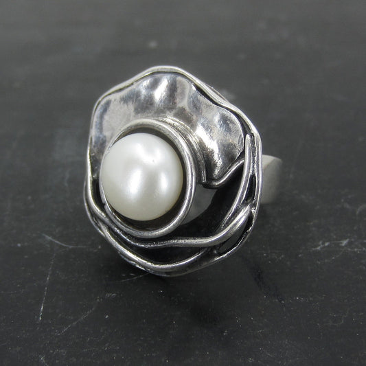 SOLD--Modernist Pearl Ring Sterling Silver c. 1970