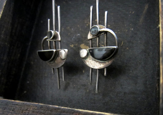 SOLD--Modernist Onyx Drop Earrings Sterling c. 1960