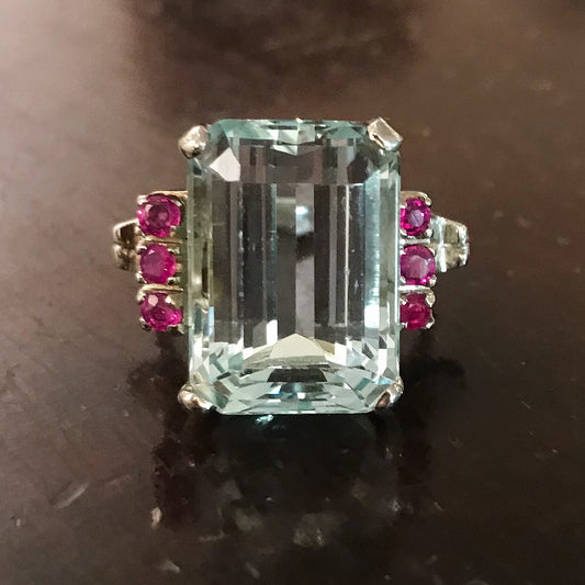 SOLD--Retro Aquamarine and Ruby Ring 14k c. 1940
