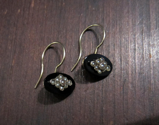 SOLD--Tiny Victorian Pearl and Onyx Earrings 14k c. 1880
