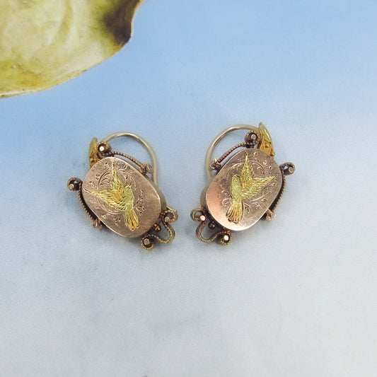 SOLD--Victorian Engraved Bird Earrings 14k c. 1880