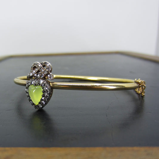 SOLD--Victorian Chrysoprase and Rose Cut Diamond Heart with Love Knot Bracelet Silver/14k c. 1890
