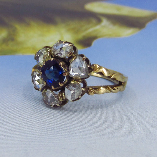 SOLD--Victorian Sapphire and Rose Cut Diamond Cluster Ring 14k, Russian c. 1880