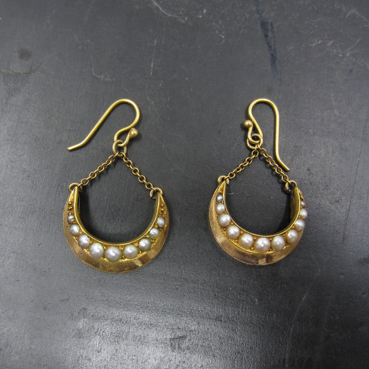 SOLD--Victorian Pearl Crescent Earrings 14k c. 1880
