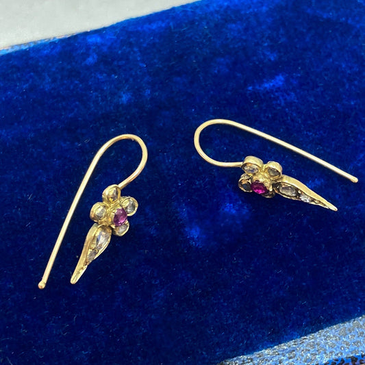 SOLD--Victorian Tiny Rose Cut Diamond and Pink Sapphire Earrings 14k c. 1840