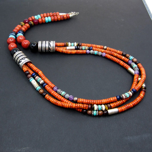 SOLD Vintage Navajo Sponge Coral Three Strand Necklace Sterling, Tommy Singer