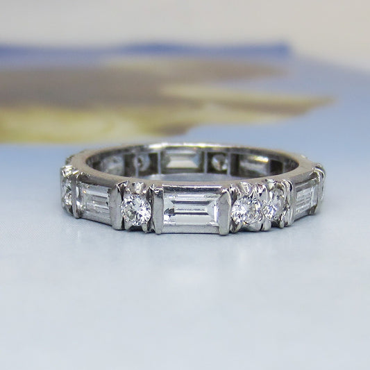 SOLD- Vintage Baguette and Round Diamond Eternity Band Platinum, Size 8.25