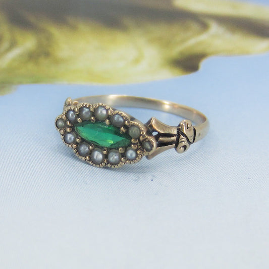 SOLD Victorian Green Glass and Seed Pearl Ring 14k c. 1880