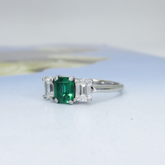 SOLD Vintage Mid-Century Emerald and Diamond Ring 18k/Plat c. 1950