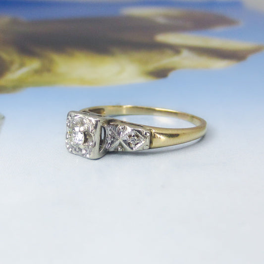 SOLD-Retro Round Brilliant Cut .12ct Diamond Engagement Ring 14k c. 1940