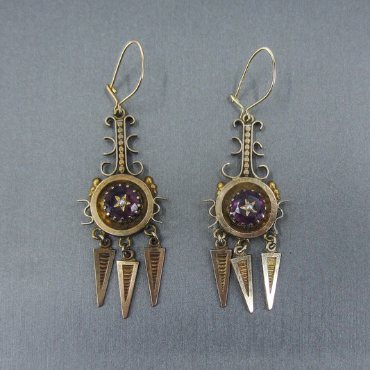 SOLD-Victorian Etruscan Revival Amethyst and Pearl Earrings 12k c. 1880