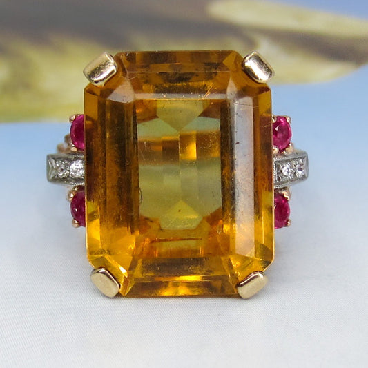 SOLD-Retro Citrine, Ruby and Diamond Cocktail Ring 14k c. 1940