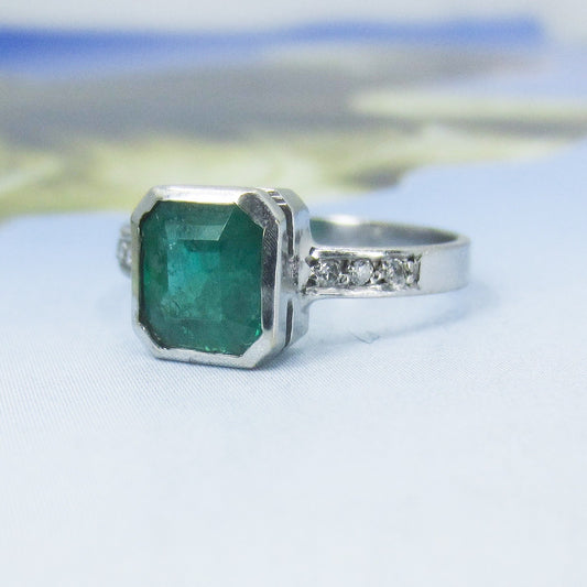 SOLD-Vintage Bezel Set Emerald and Diamond Ring 18k c. 1990