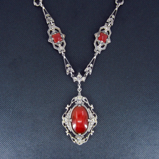 SOLD--Art Deco Carnelian and Marcasite Necklace Sterling c. 1930