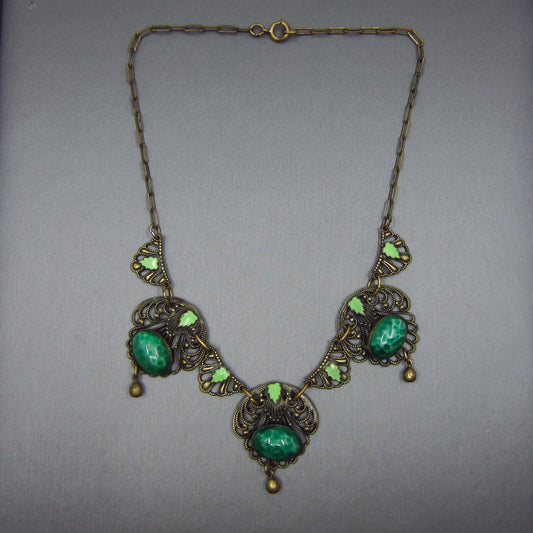 SOLD--Art Deco Czech Enamel and Art Glass Necklace Brass c. 1930