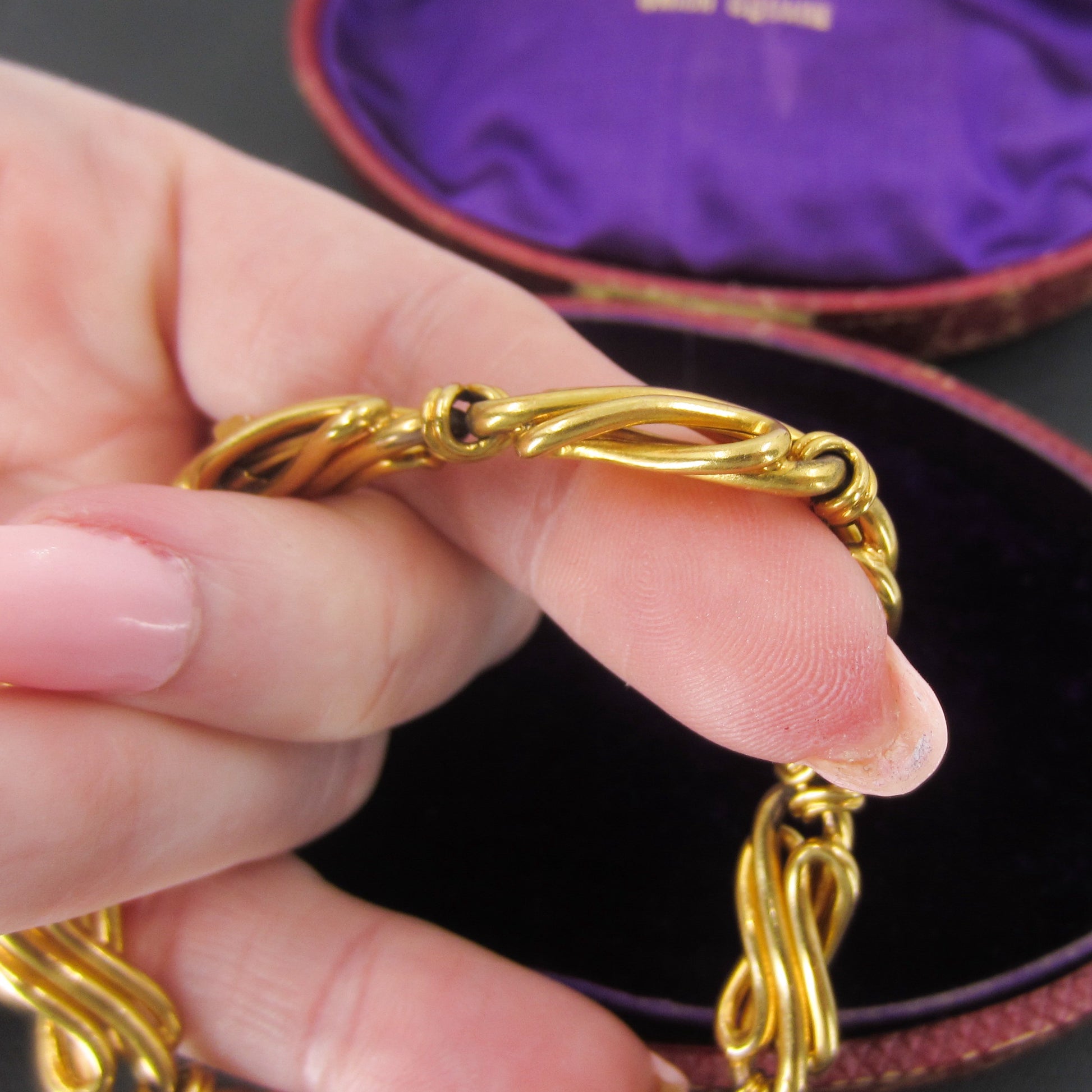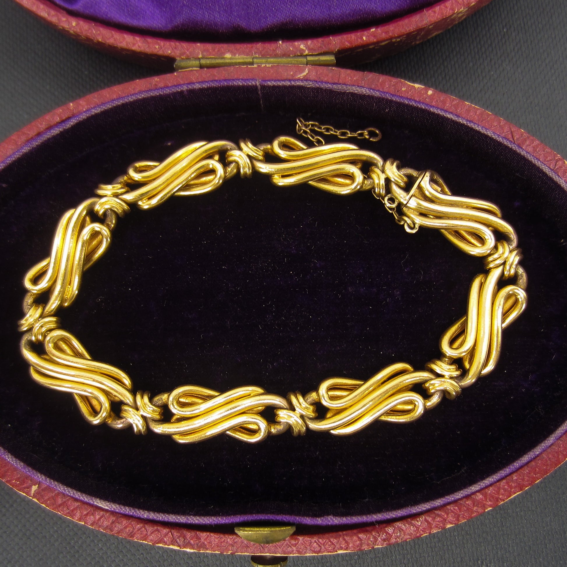 A gorgeous antique French bracelet in 18k yellow gold with a fancy love knot style twist link circa 1900.