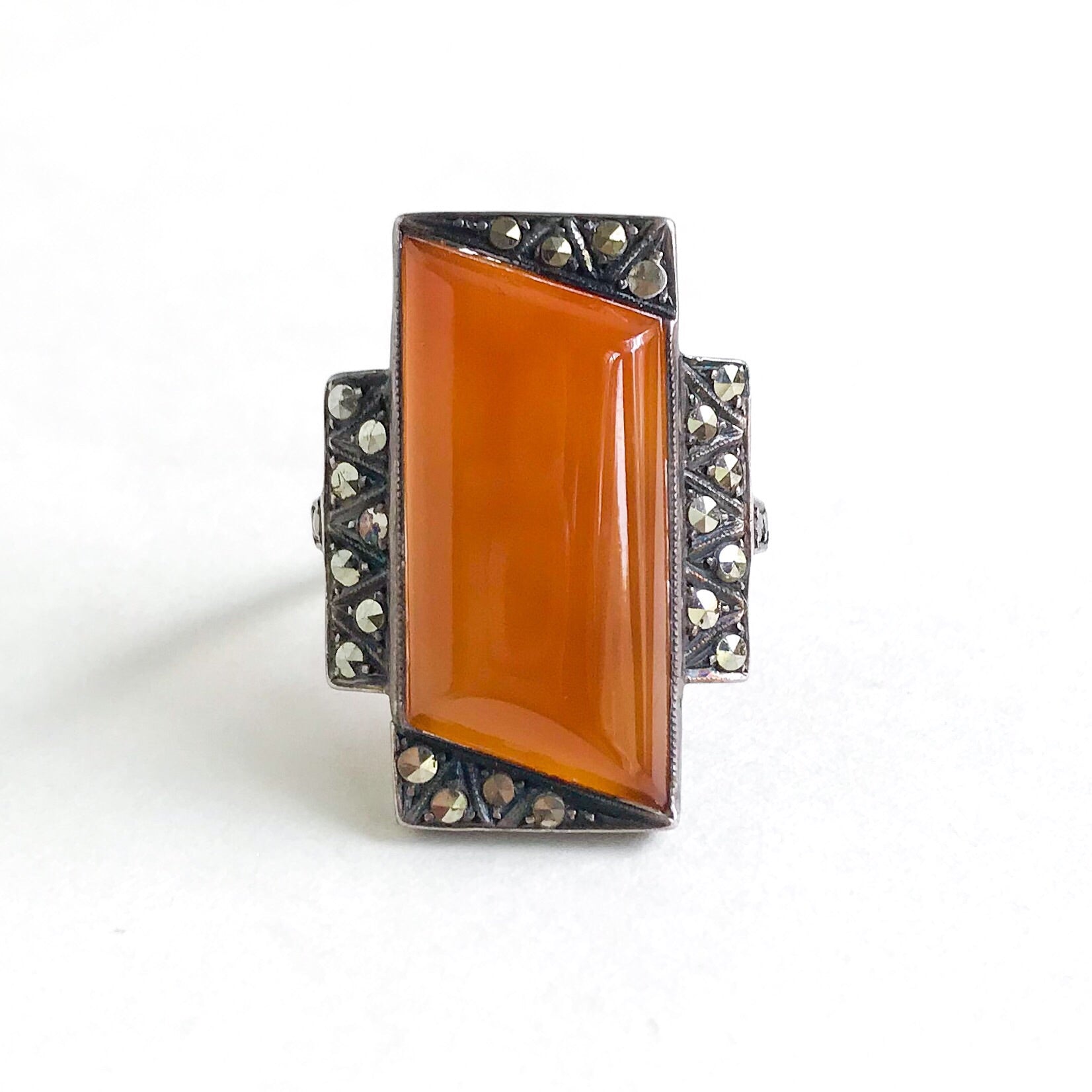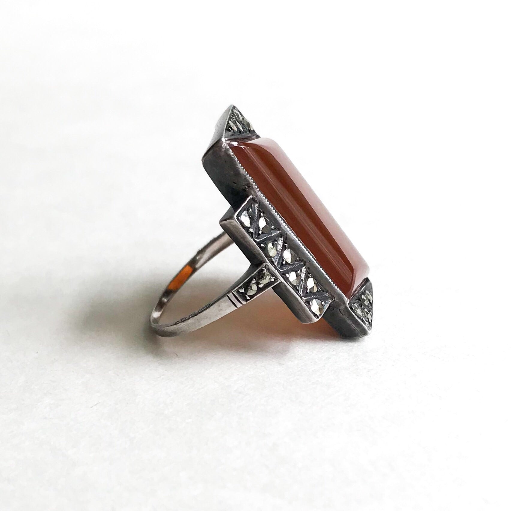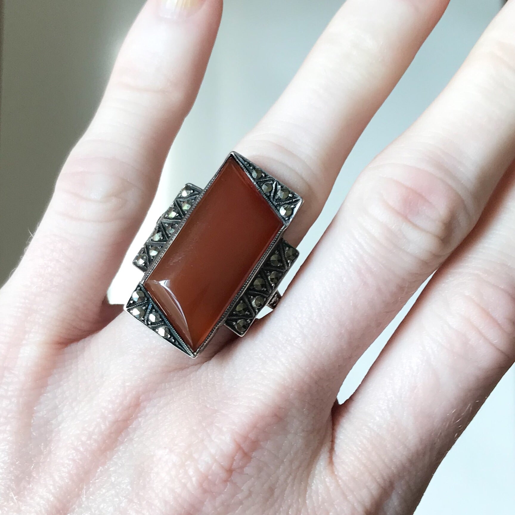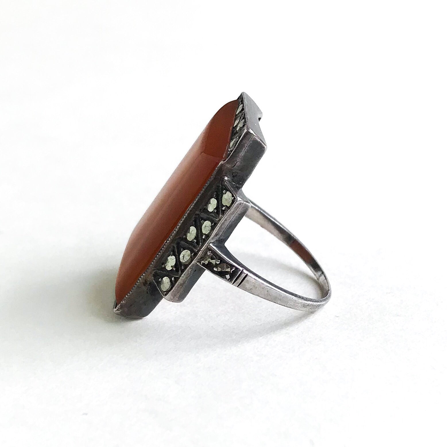 Art Deco Long Carnelian and Marcasite Ring Sterling c. 1930