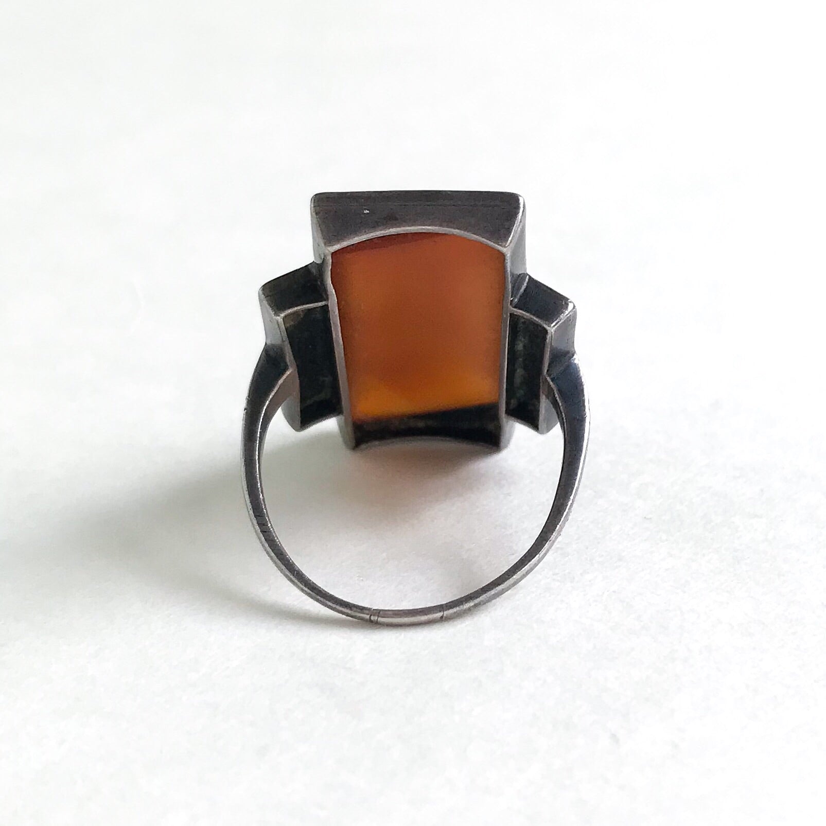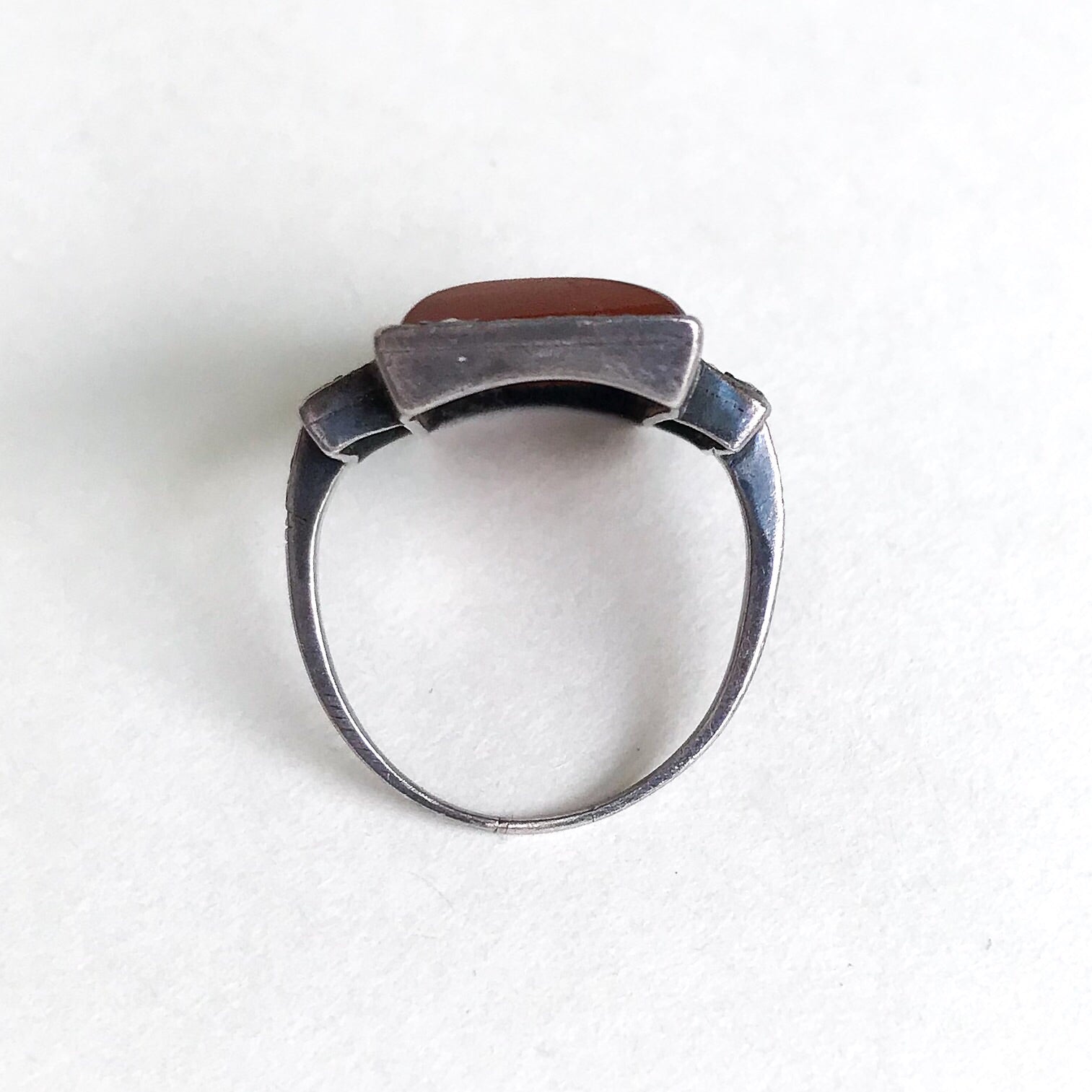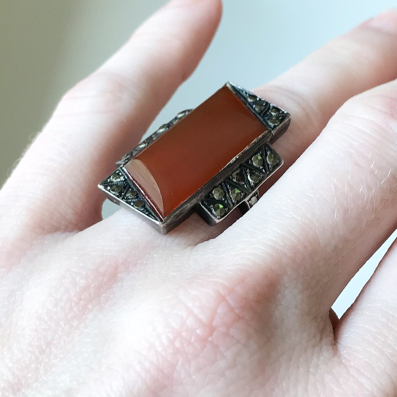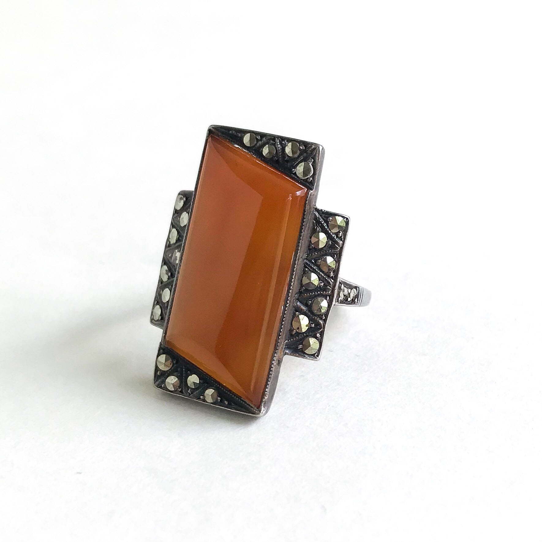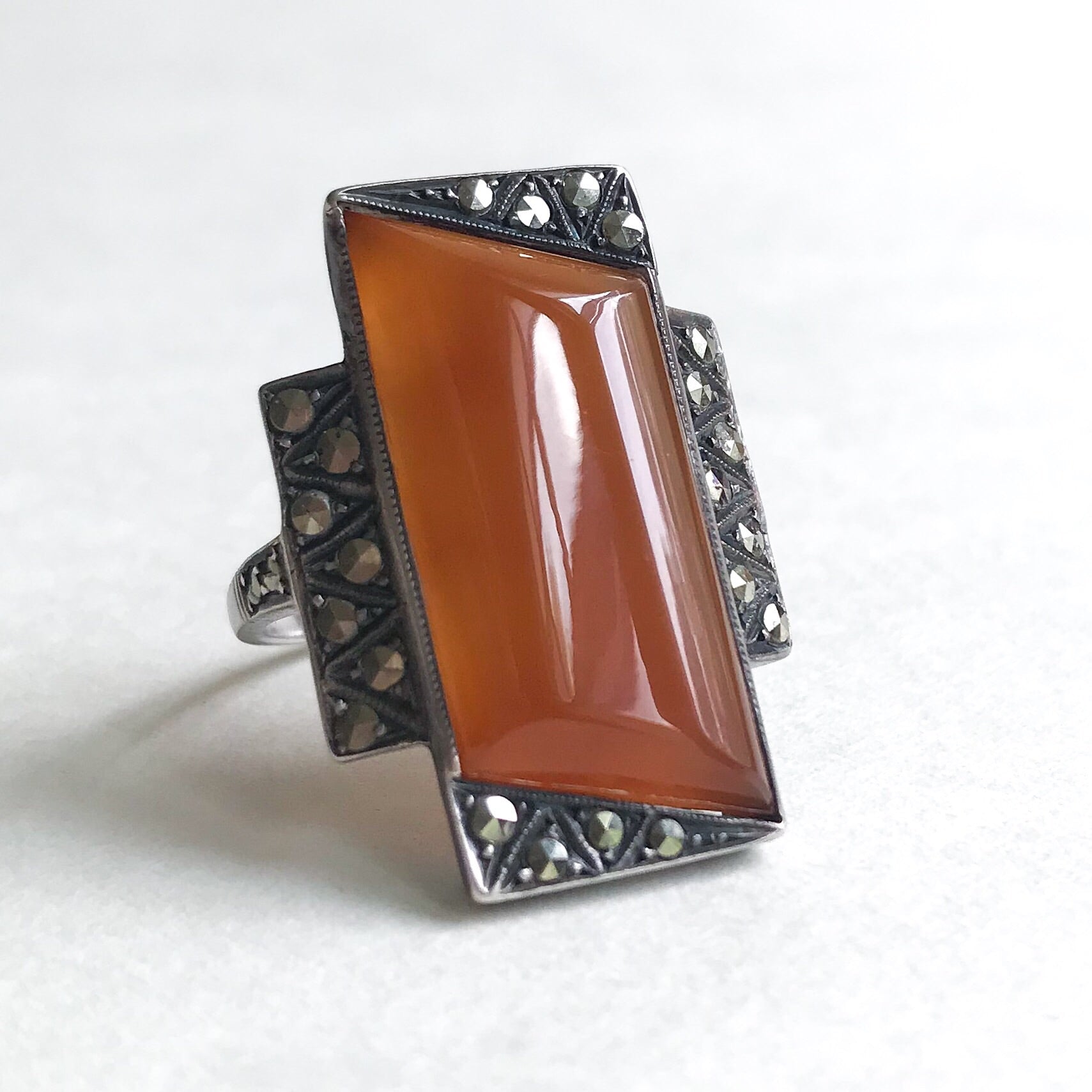 Art Deco Long Carnelian and Marcasite Ring Sterling c. 1930