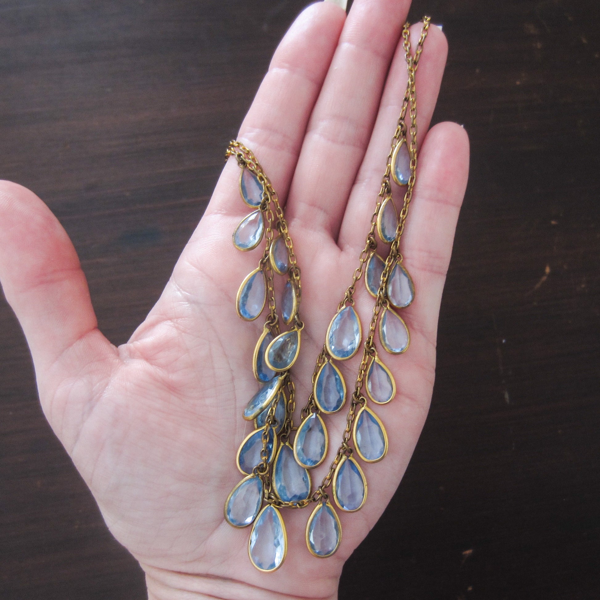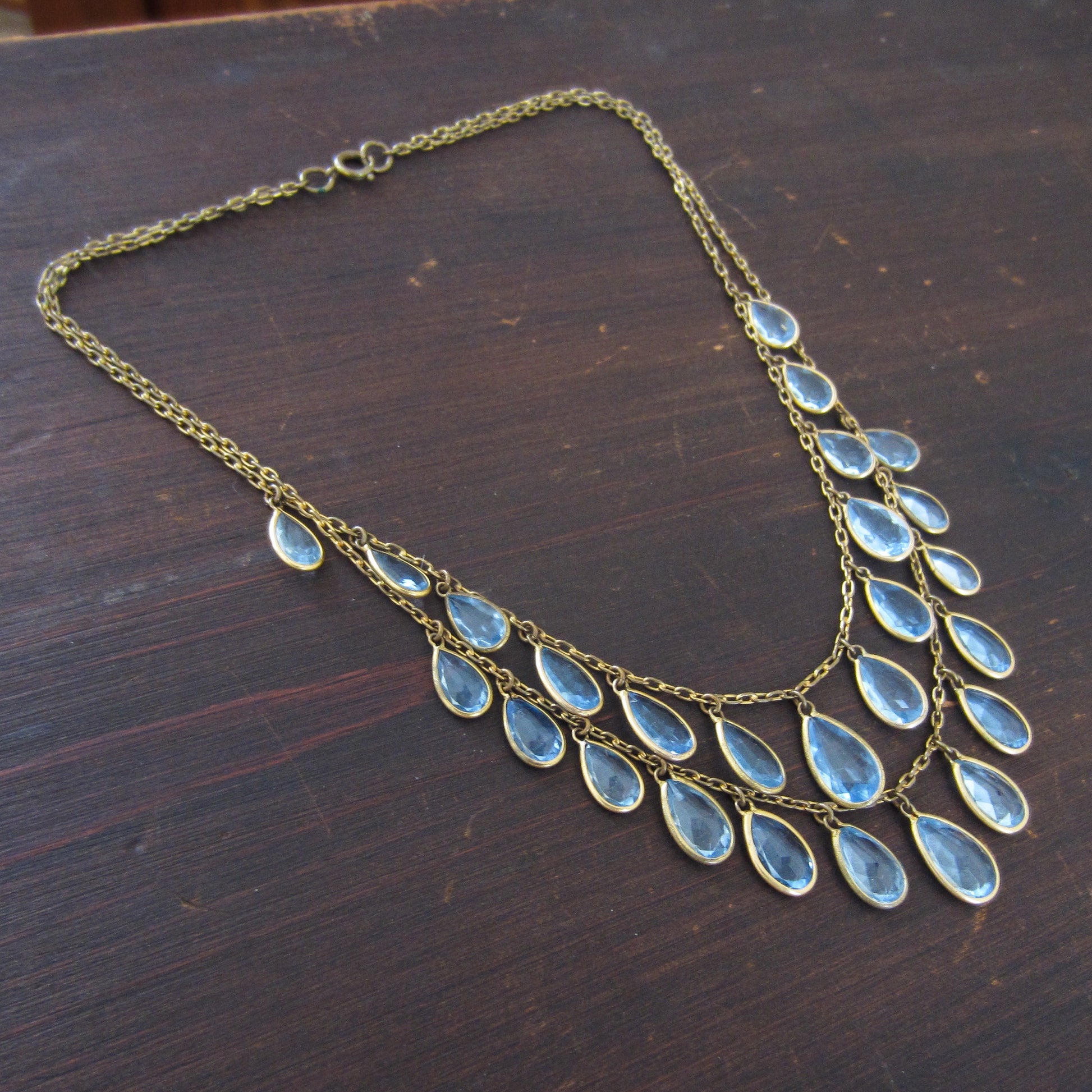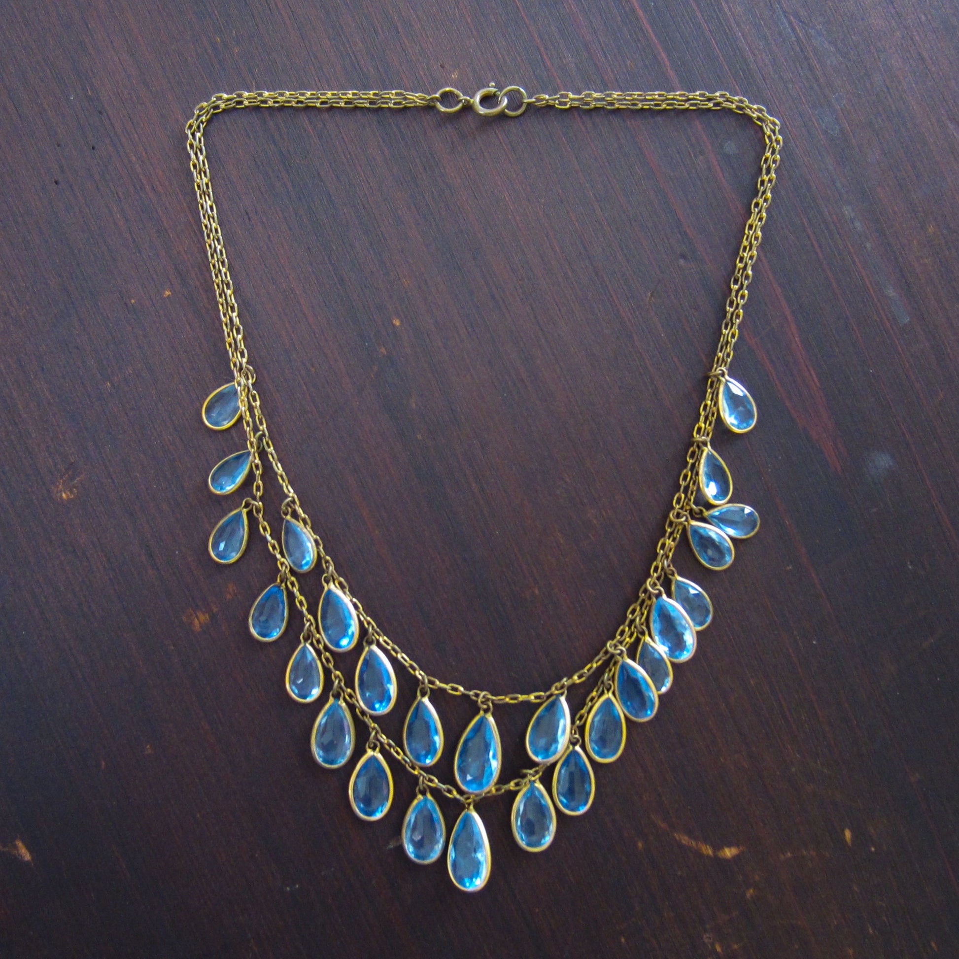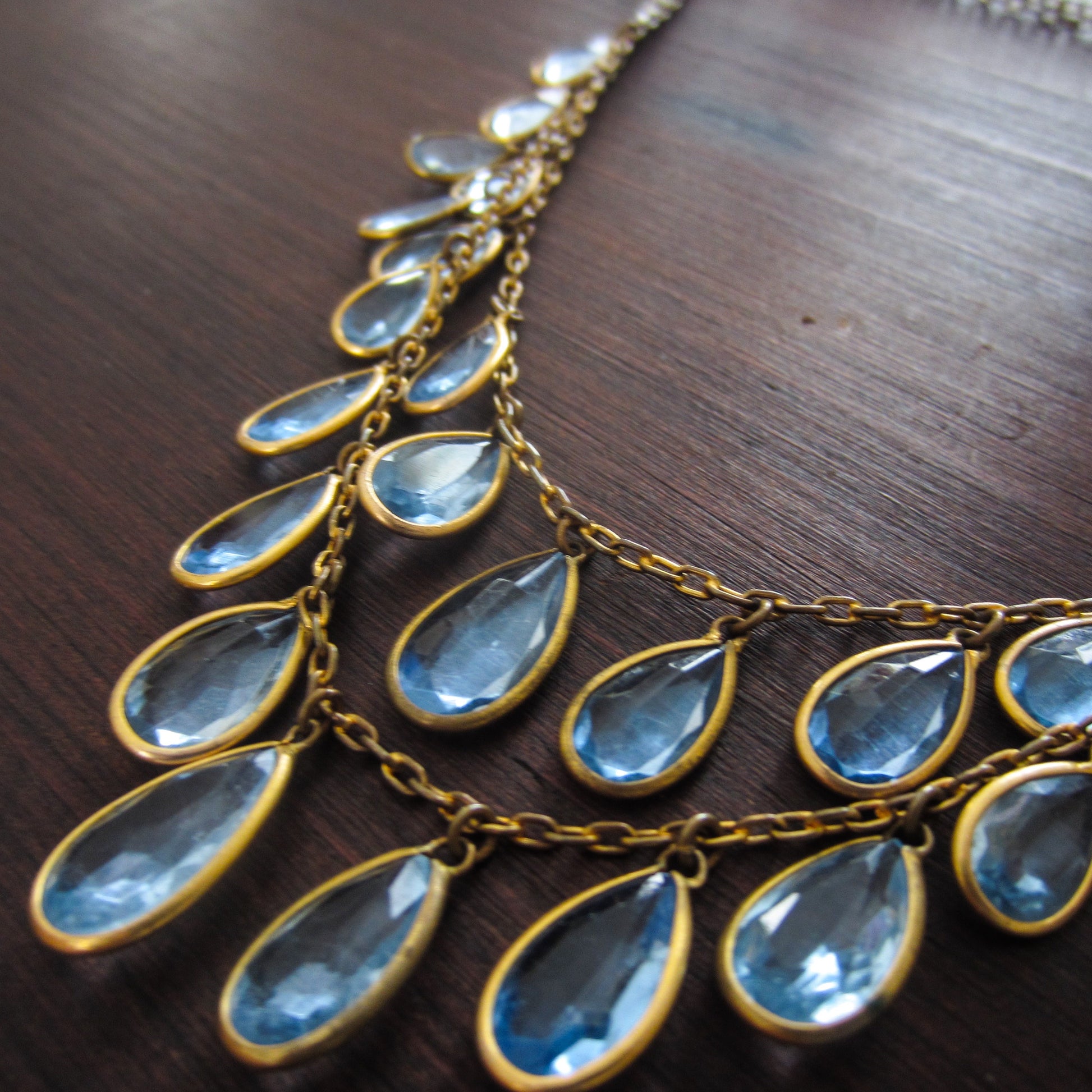 This is such a pretty and quite dramatic Art Deco necklace, that would make a FABULOUS wedding necklace, made circa 1930 with aquamarine blue paste teardrops set in gilt brass bezels. I love that there are two rows of paste drops, it just brings the piece up to the next level and adds lovely, light color. Beautiful!