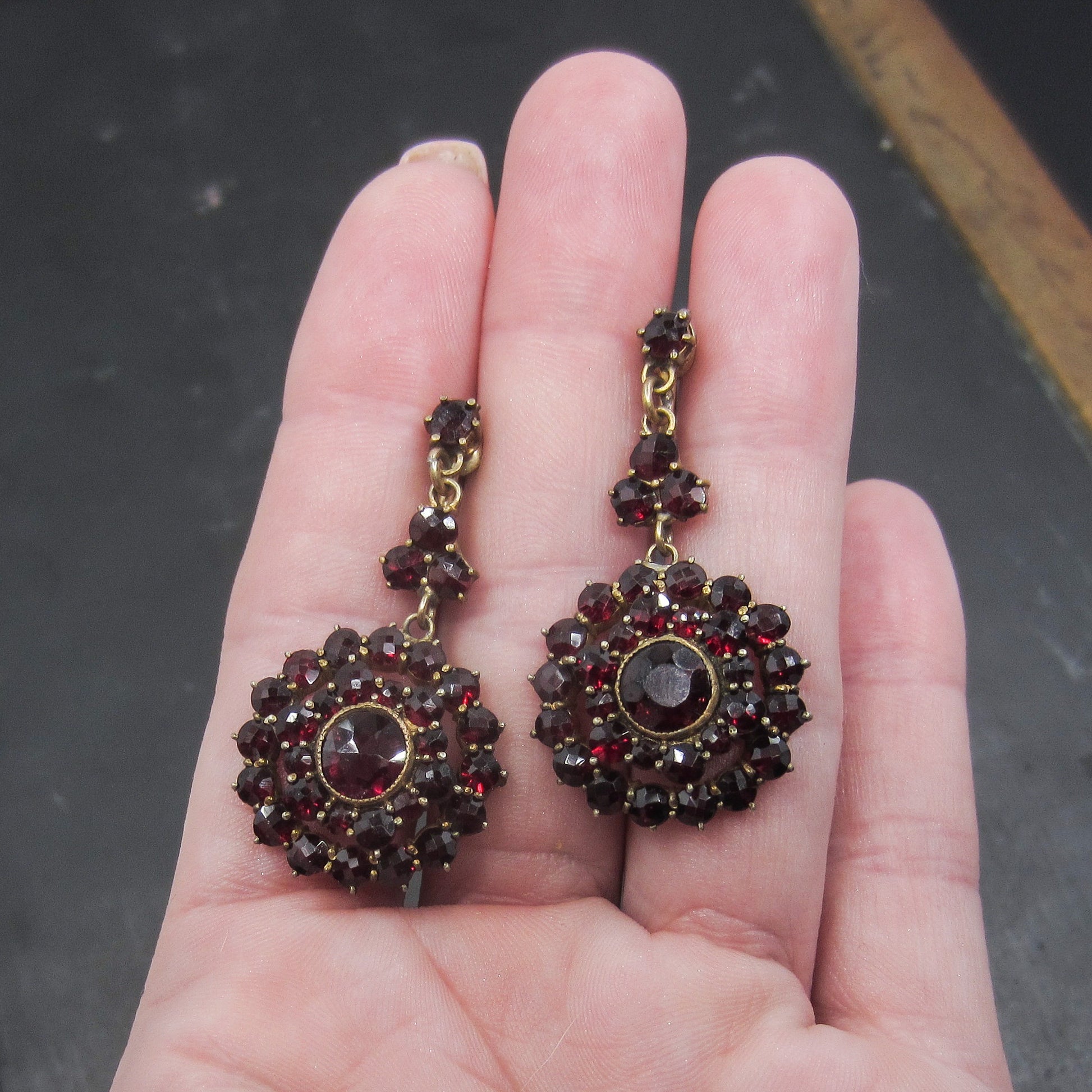 SOLD-Art Deco Bohemian Garnet Cluster Earrings Gilt Brass c. 1930
