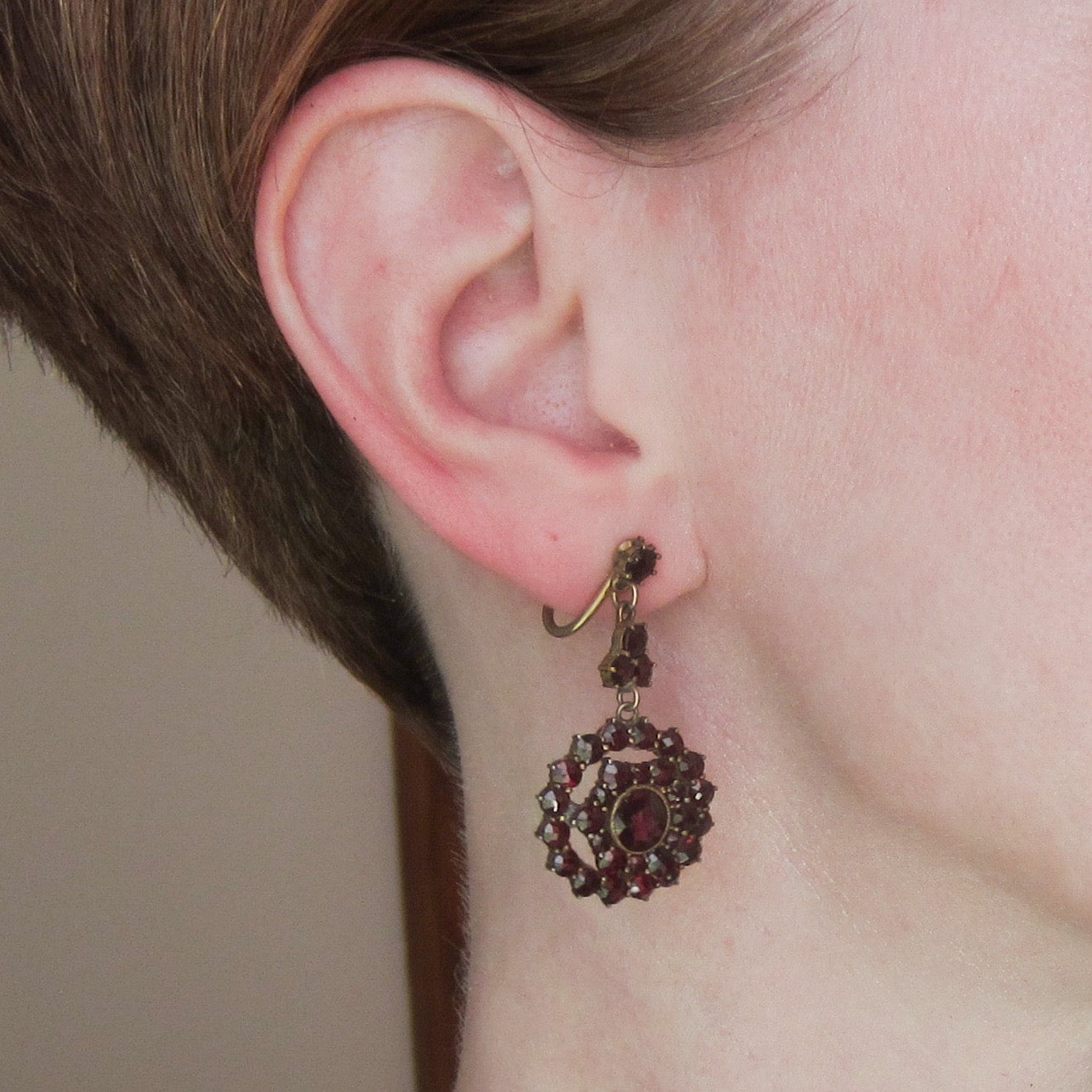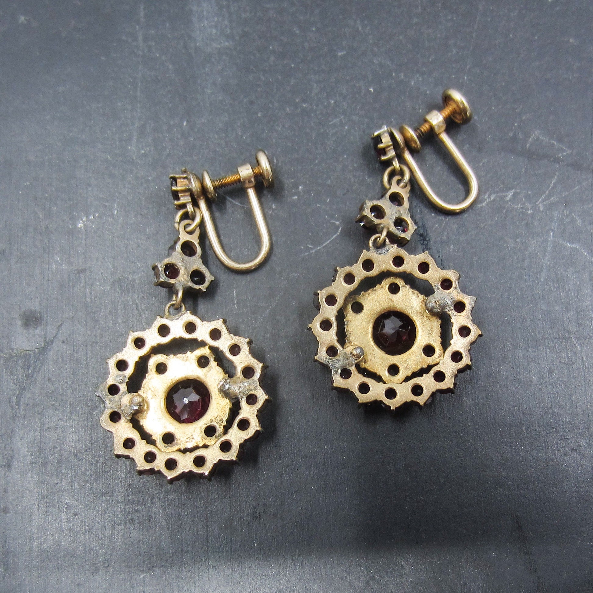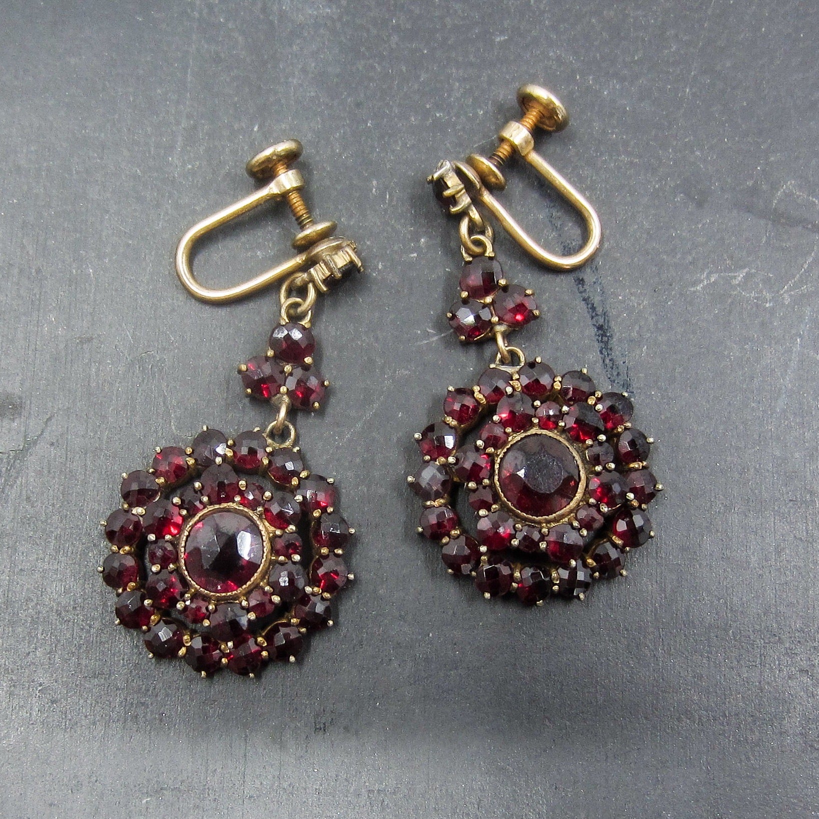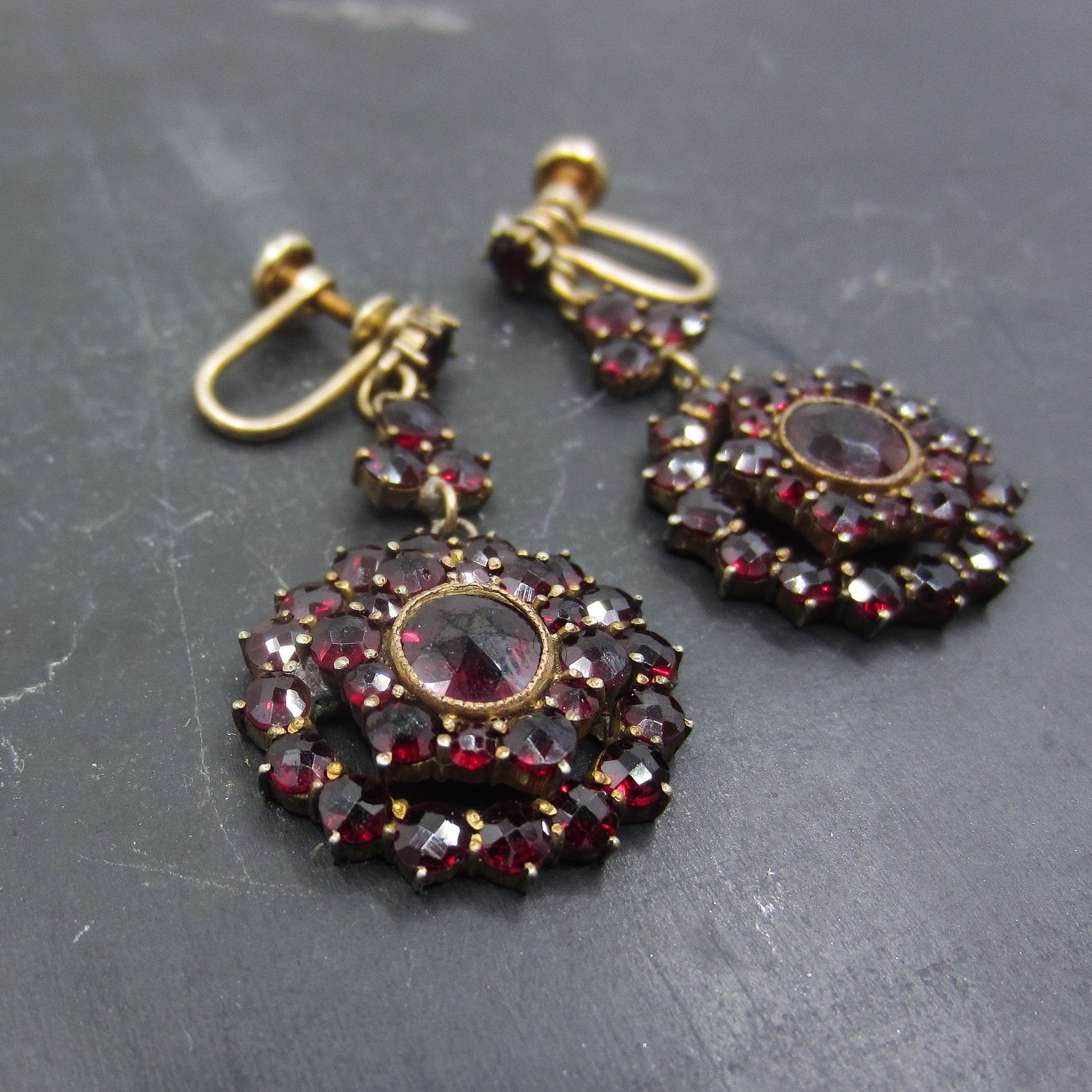 A beautiful pair of bohemian garnet drop earrings, set in gilt brass and dating to the 1930's. Don't let the screw backings dissuade you, we can convert these to post or French wire for an additional cost!