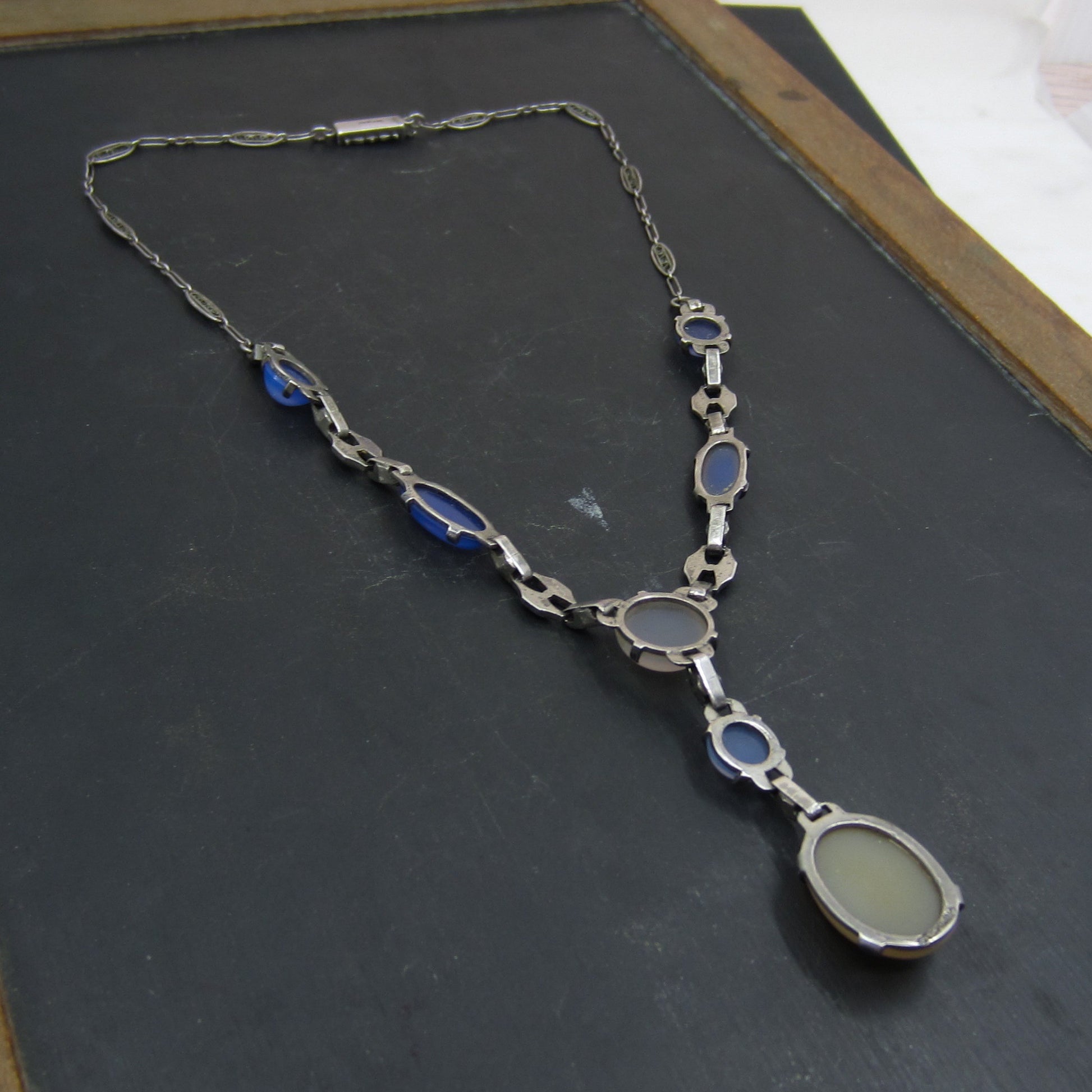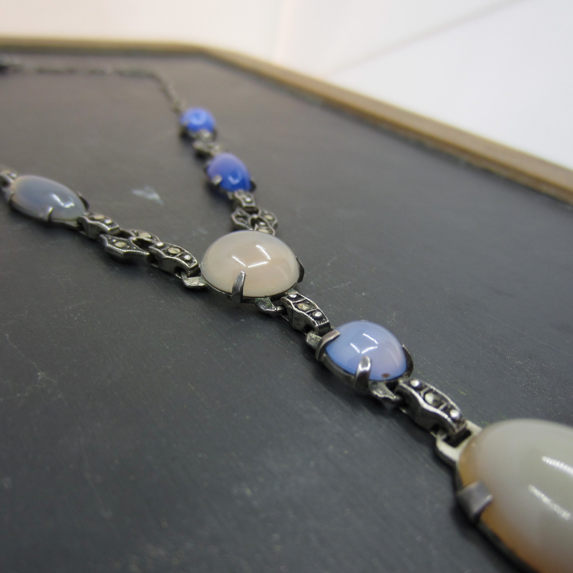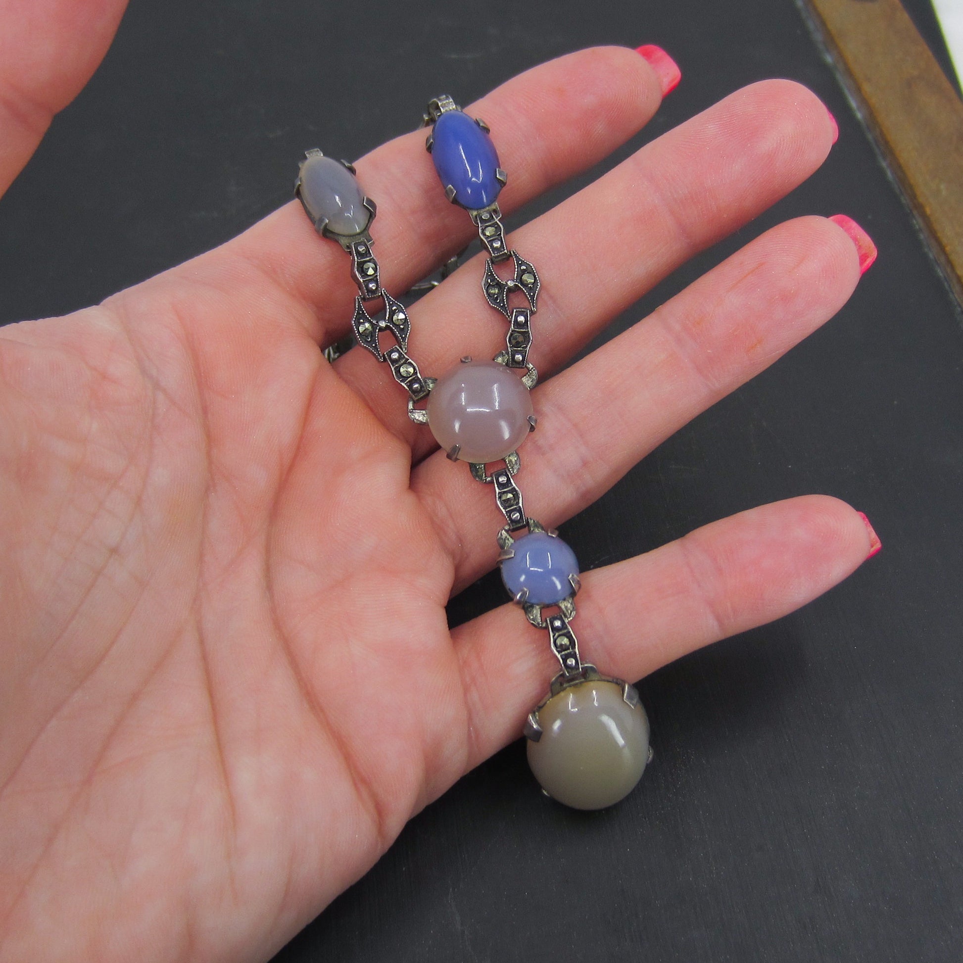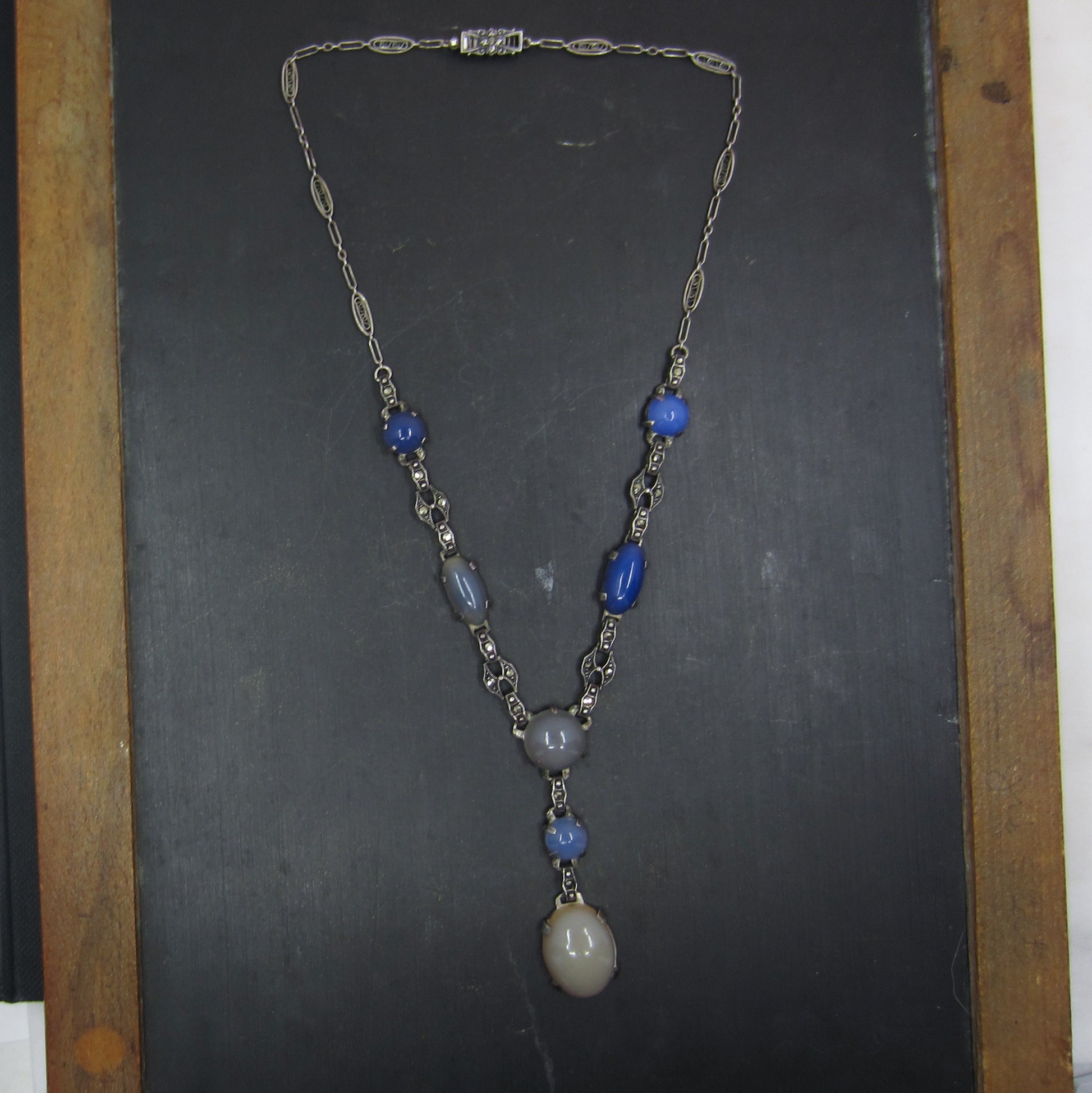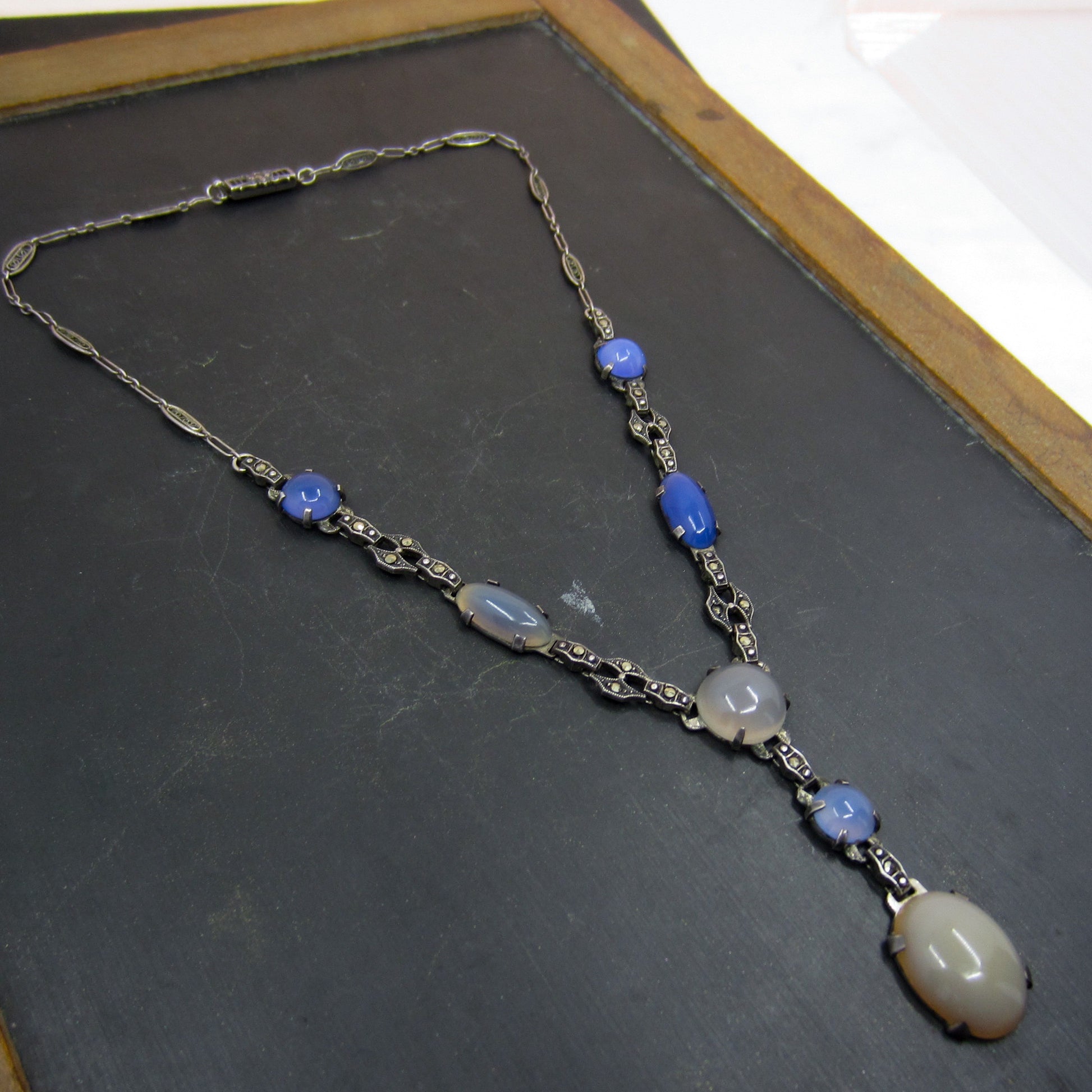 SOLD-Art Déco Chalcedony and Marcasite Drop Necklace Sterling c. 1920