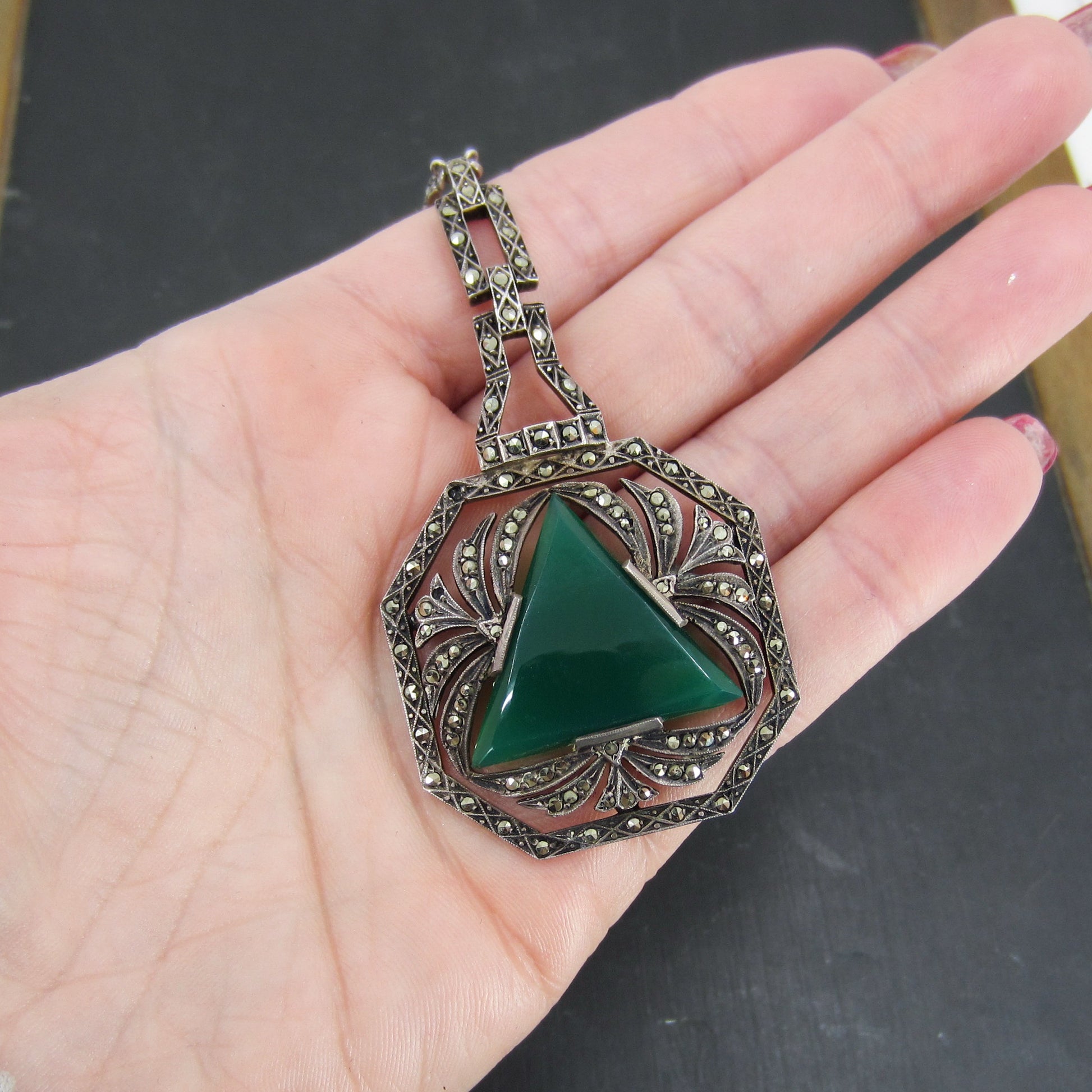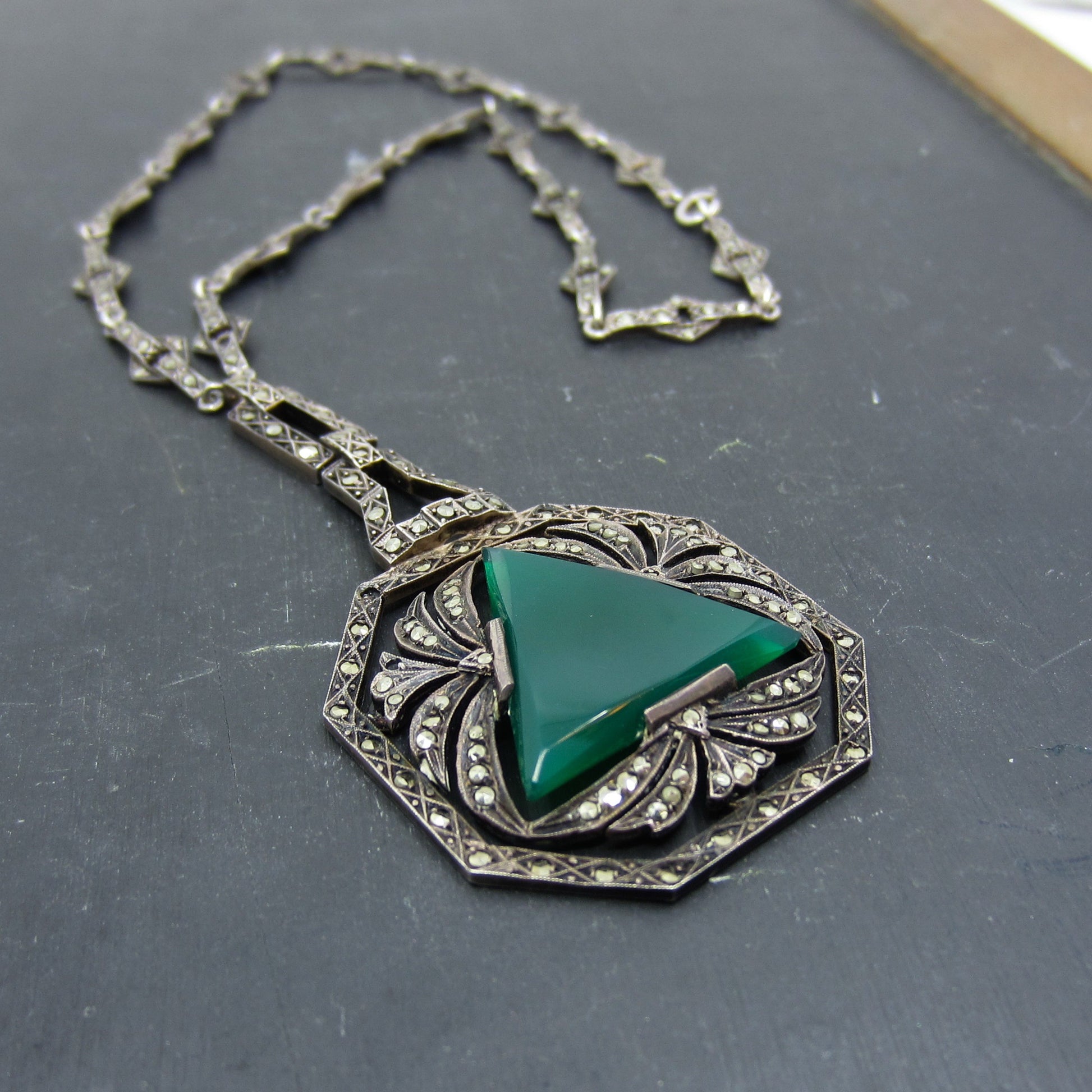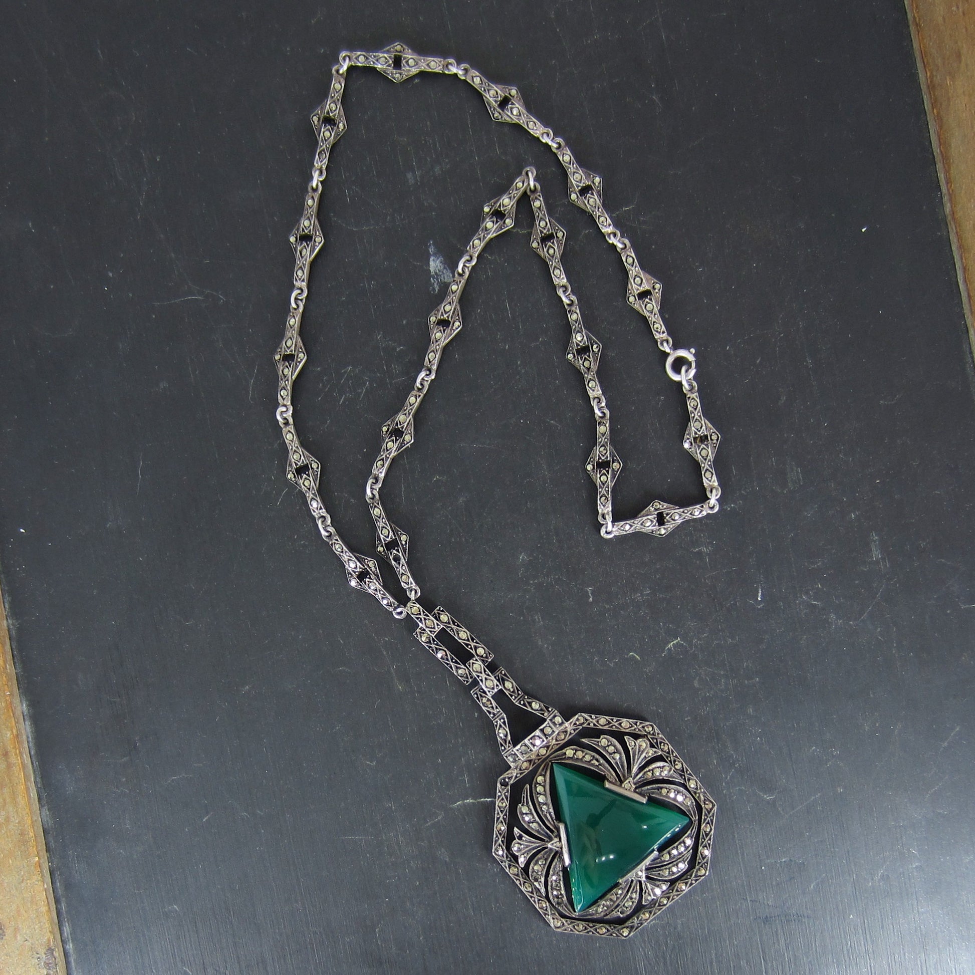 An exquisite Art Deco necklace set with a triangular cut green chalcedony and sparkling marcasites in sterling silver. Made in Germany circa 1920.