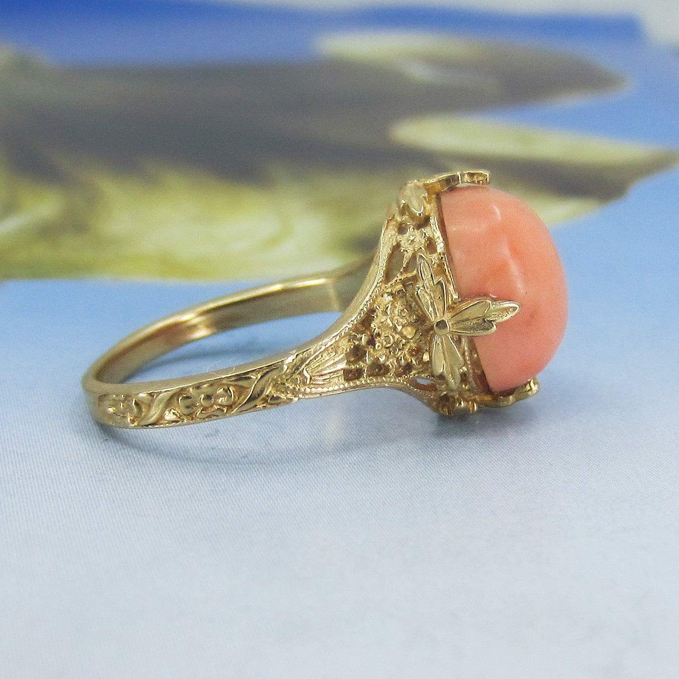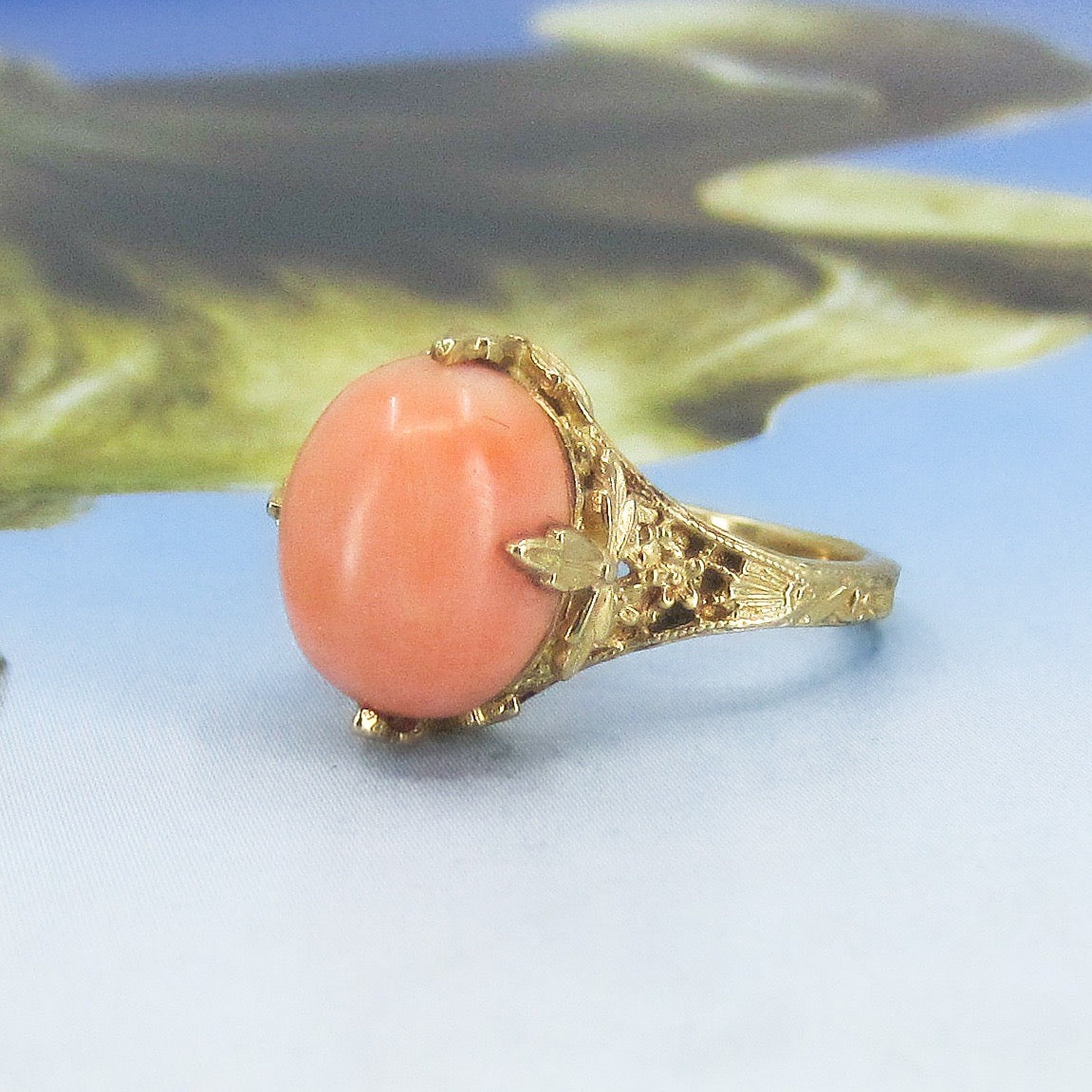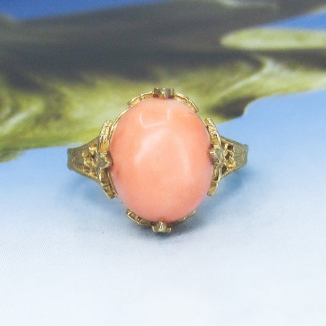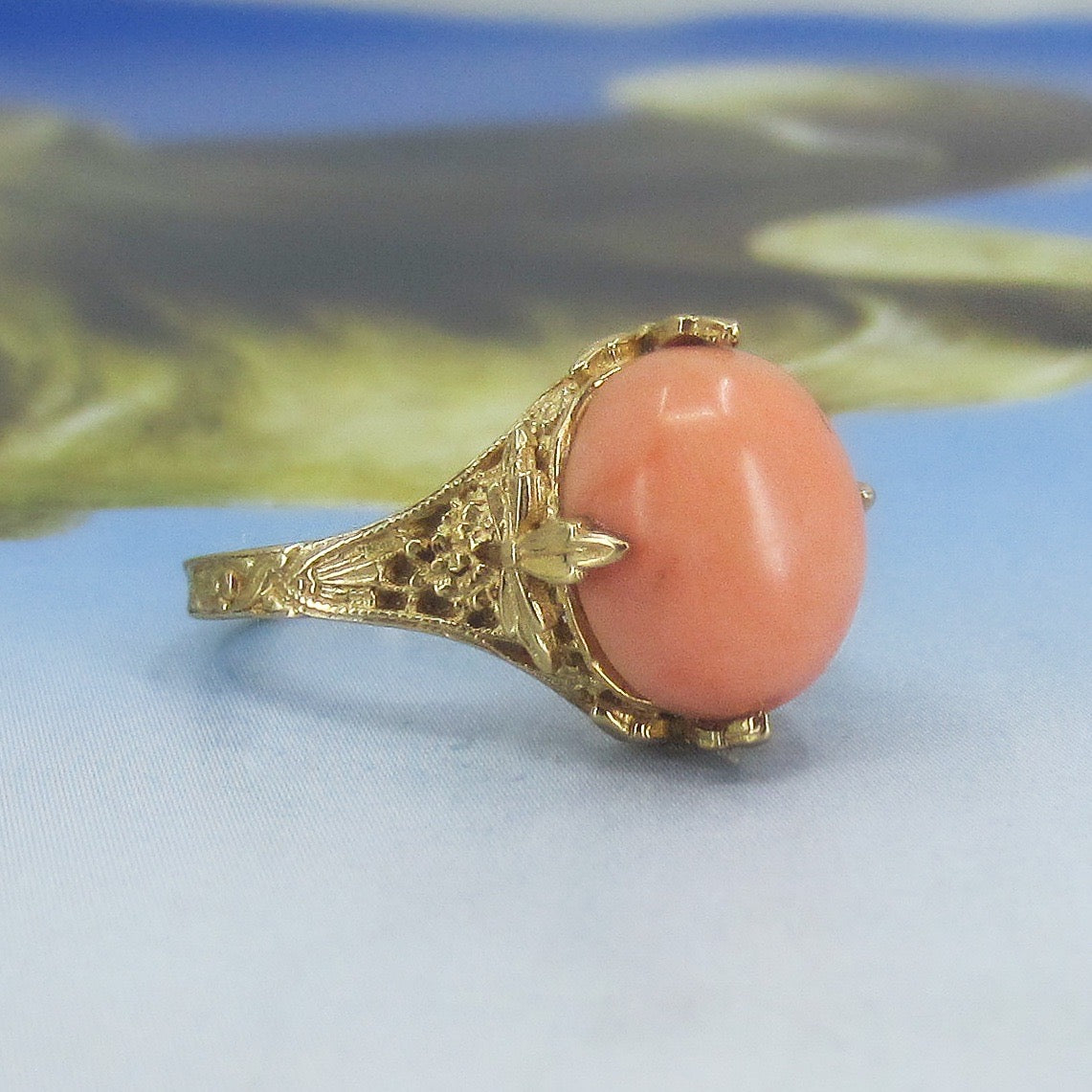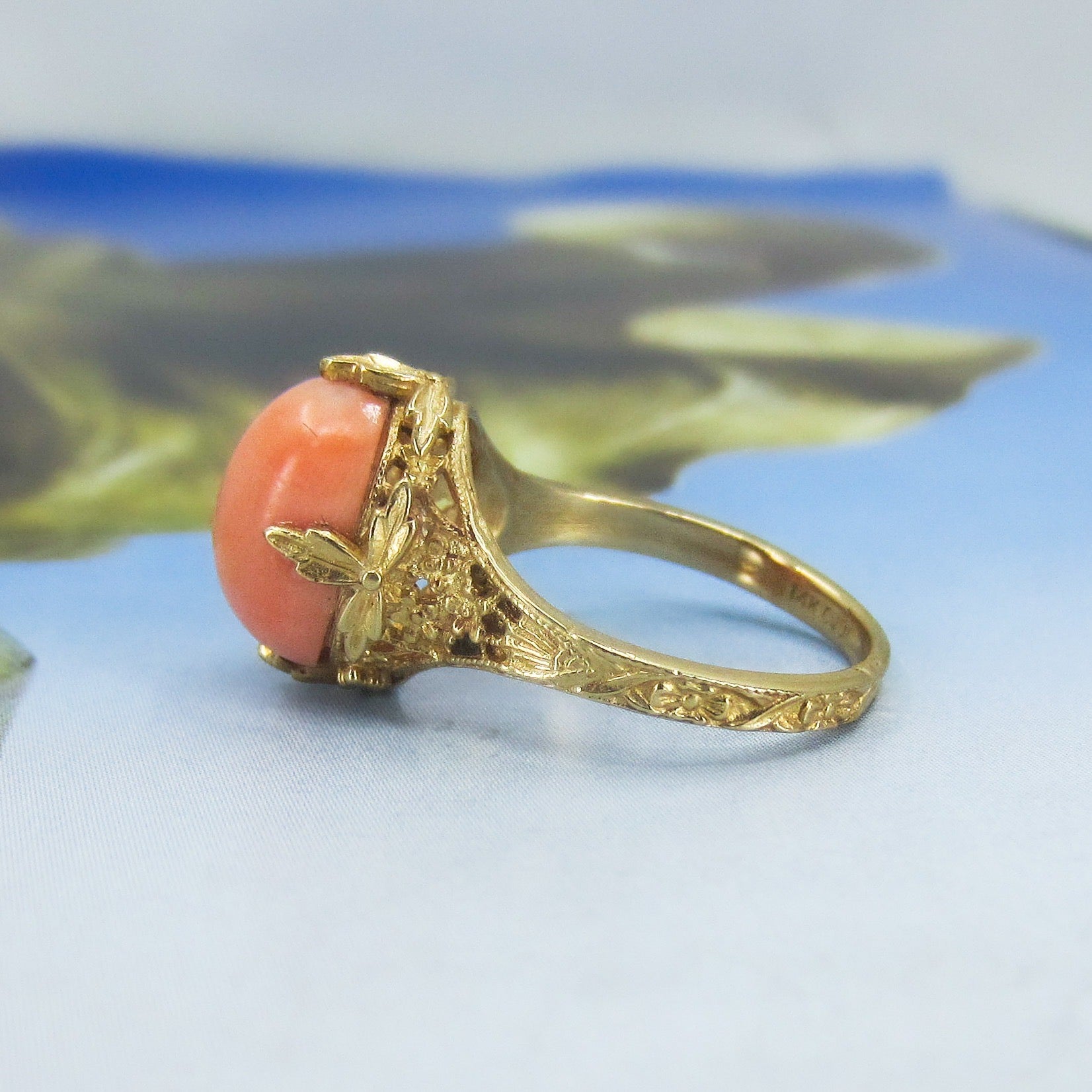 SOLD-Art Deco Coral Filigree Ring 14k c. 1930
