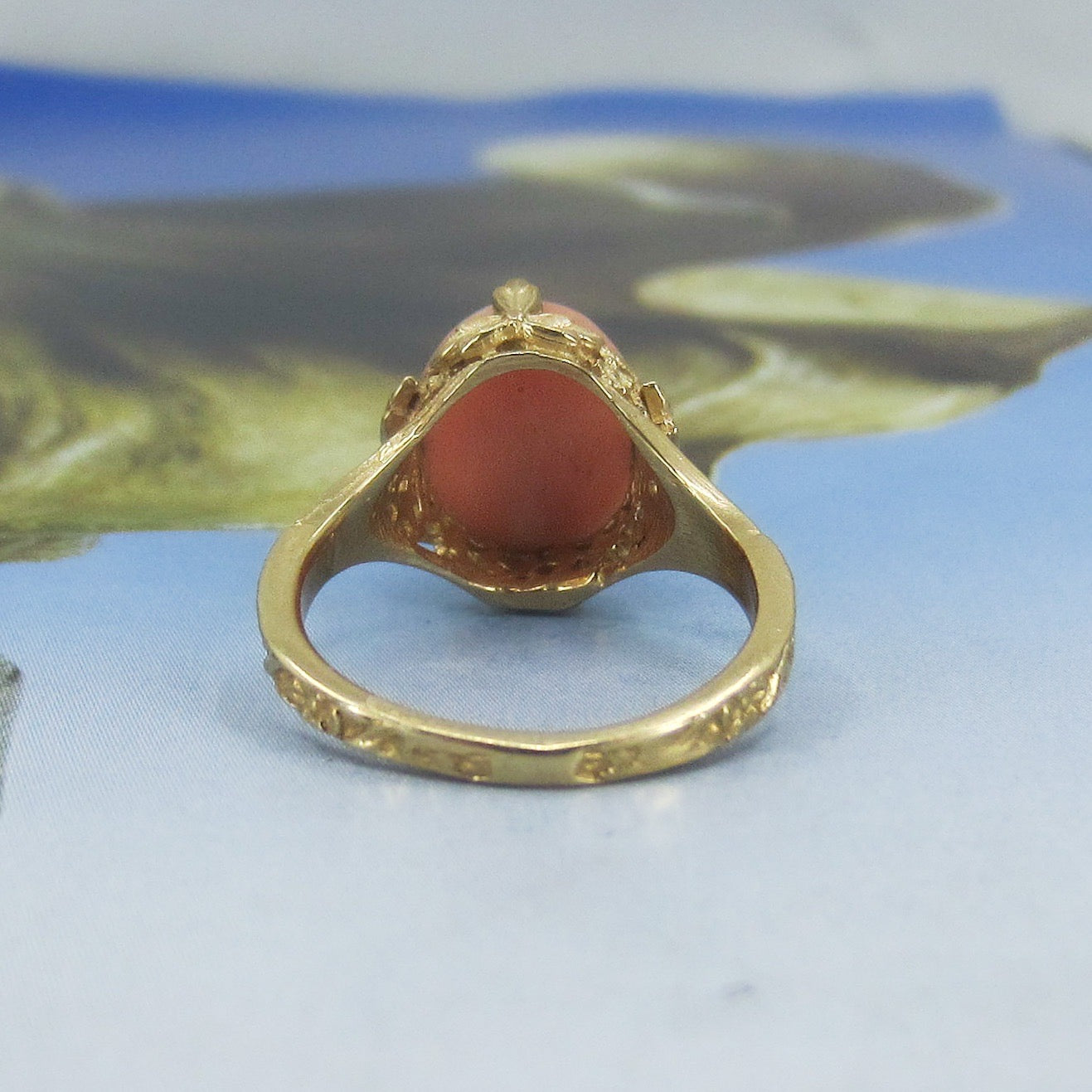 This beautiful ring was made in the 1930's and features a light salmon colored natural coral cabochon set in the most wonderful 14k yellow gold filigree mounting. The combination of the color of the coral, the yellow gold and the lacy filigree makes this ring extra romantic and so feminine. I also love the crown-like setting of the coral, where the prongs are designed as little leaves! It's a fairy tale piece and so, so pretty.