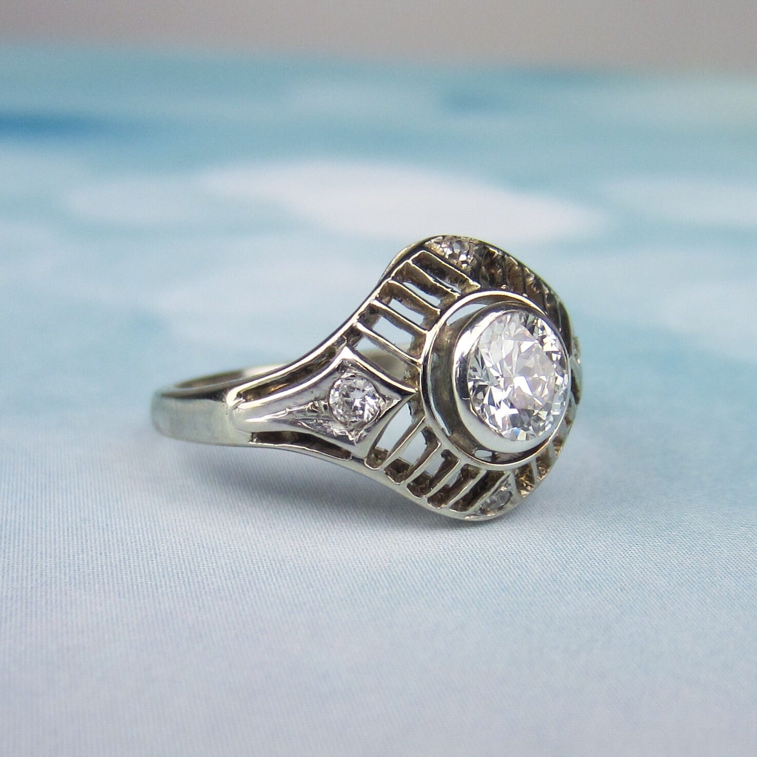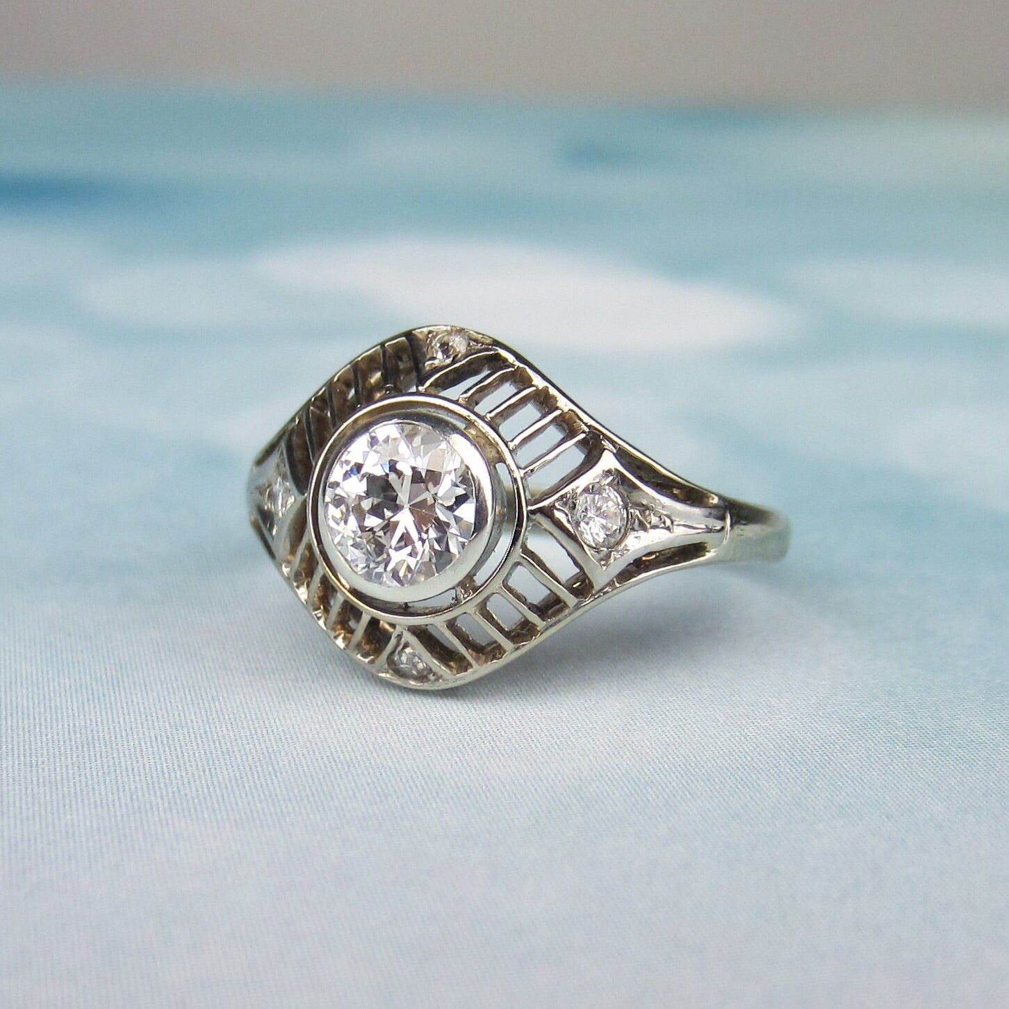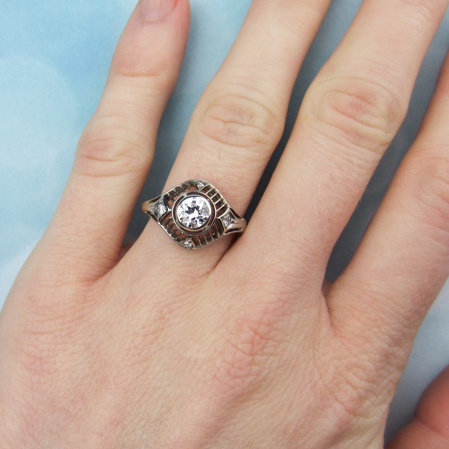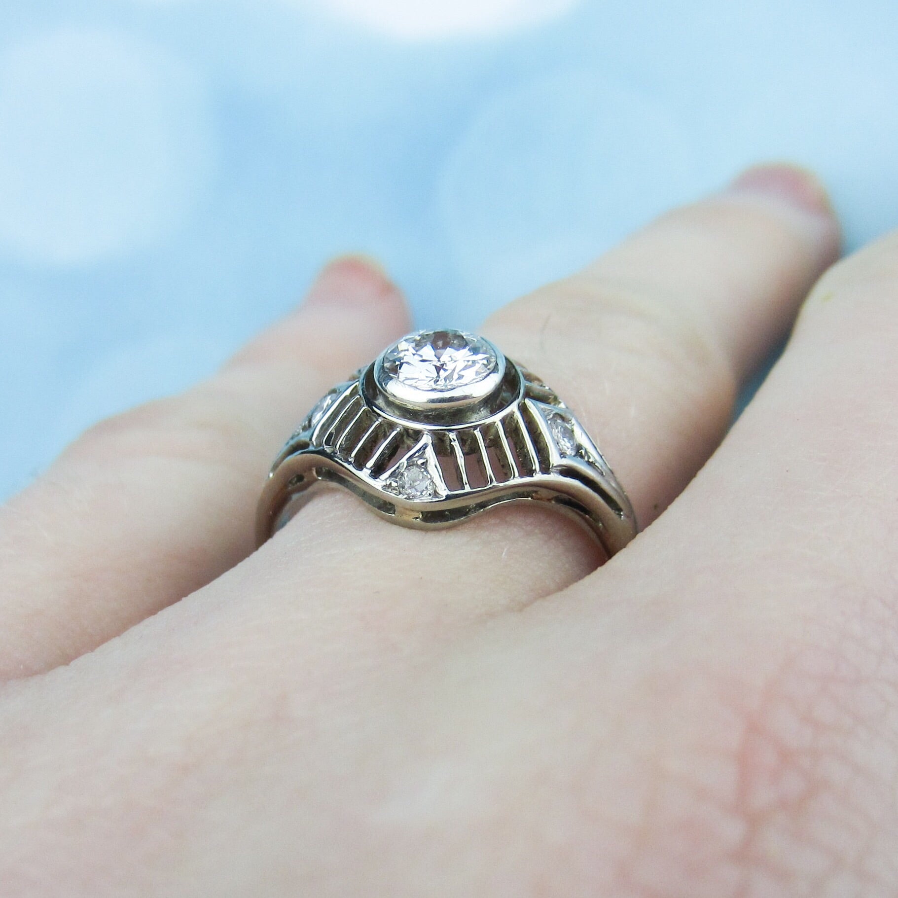 In the center of this ring we have a bezel set Old European Cut diamond weighing approximately .60ct with G-H Color and SI2 Clarity, surrounded by striped filigree set with four additional diamonds weighing approximately .15ctw. As you can see in the photos, it has a GREAT look on the hand. This ring is interesting, sparkly and in wonderful condition so it is ready to be an engagement ring once more!