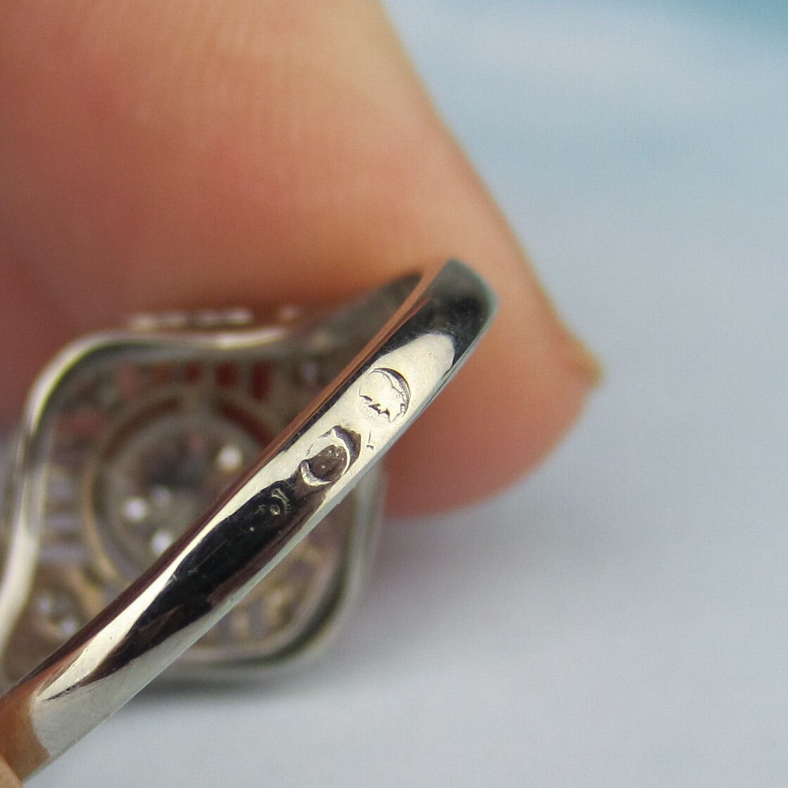 It is always so fascinating to see Deco pieces from other countries! While quite worn, this ring has Polish hallmarks on the outside of the shank. Though the term Art Deco primarily conjures images of the New York City jazz age, many other countries produced exquisite Deco works during this period. And as it turns out, the Polish pavilion was a huge hit at the Paris Exposition Internationale des Arts Decoratifs of 1925! You can see all of the pavilions here: