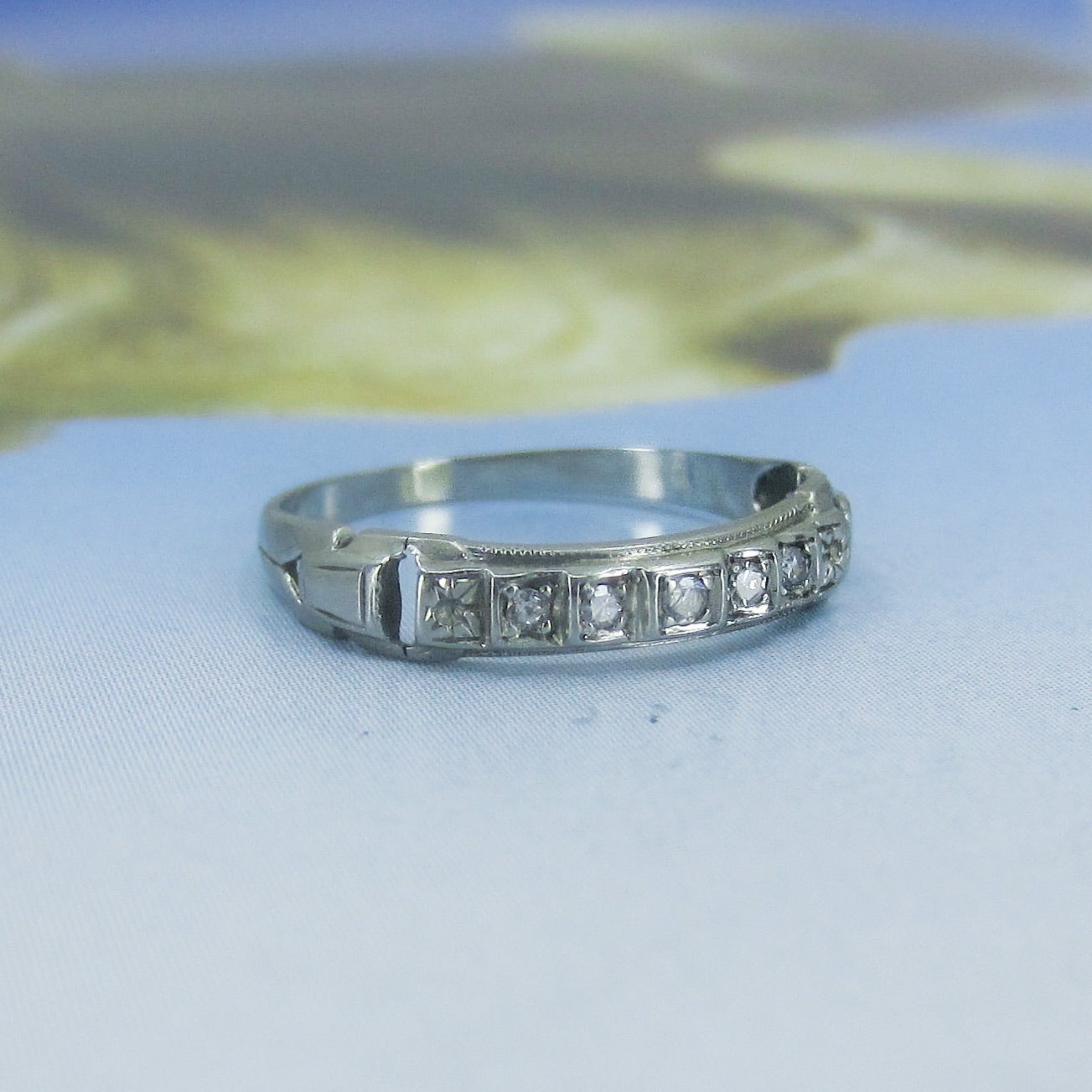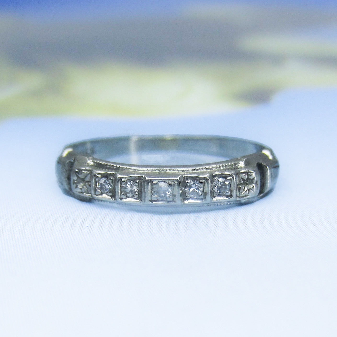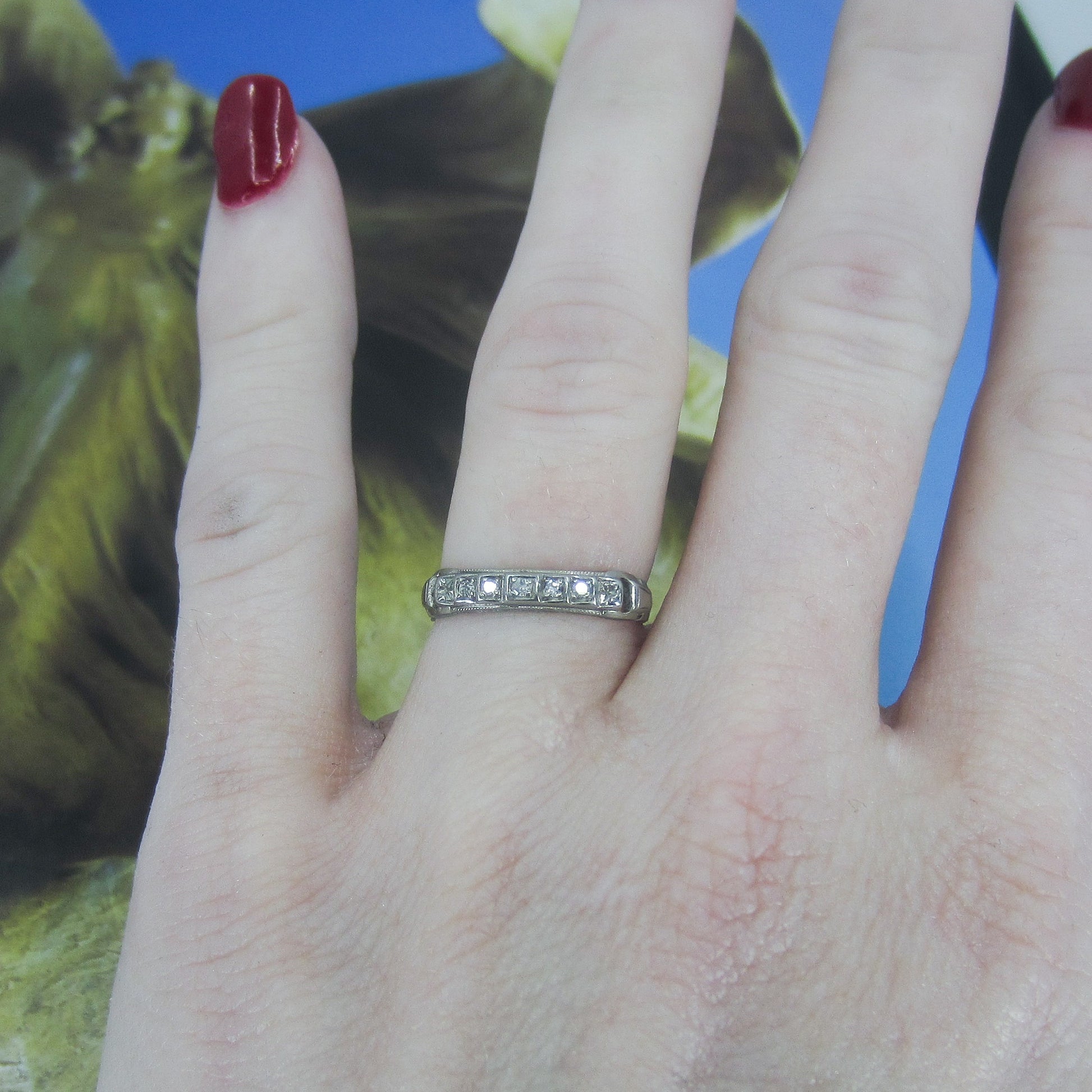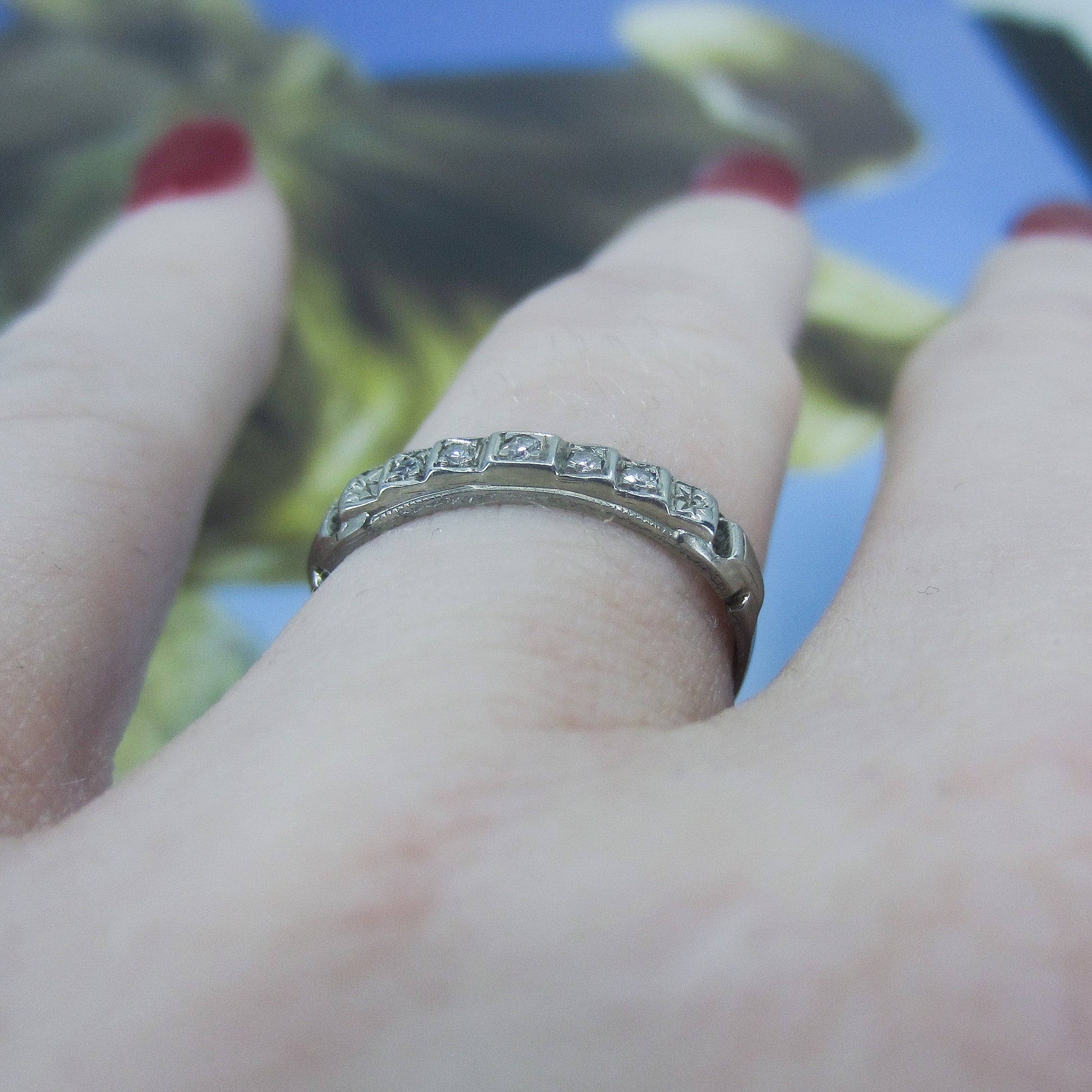 An Art Deco era diamond wedding band featuring five single cut diamonds, bead set in individual boxes that step down the sides which is so quintessentially Deco! There are tiny engraved flowers on either end and those great Deco open buckle-like shoulders. Made in 18k white gold circa 1930.