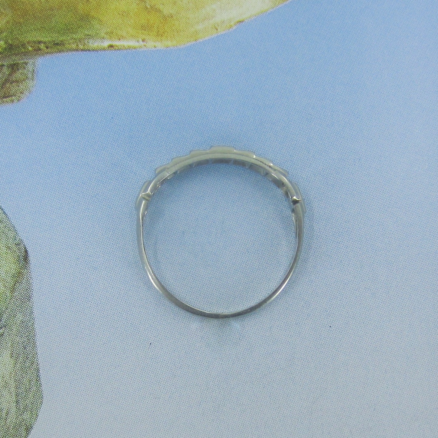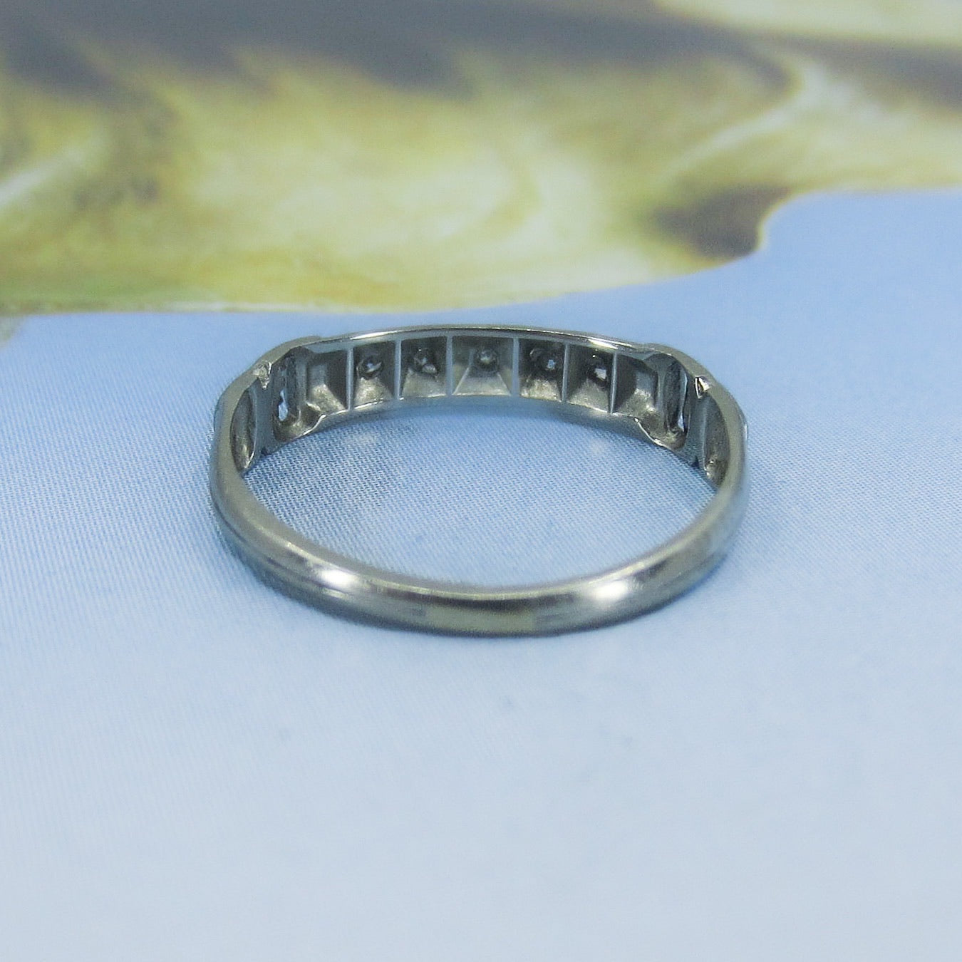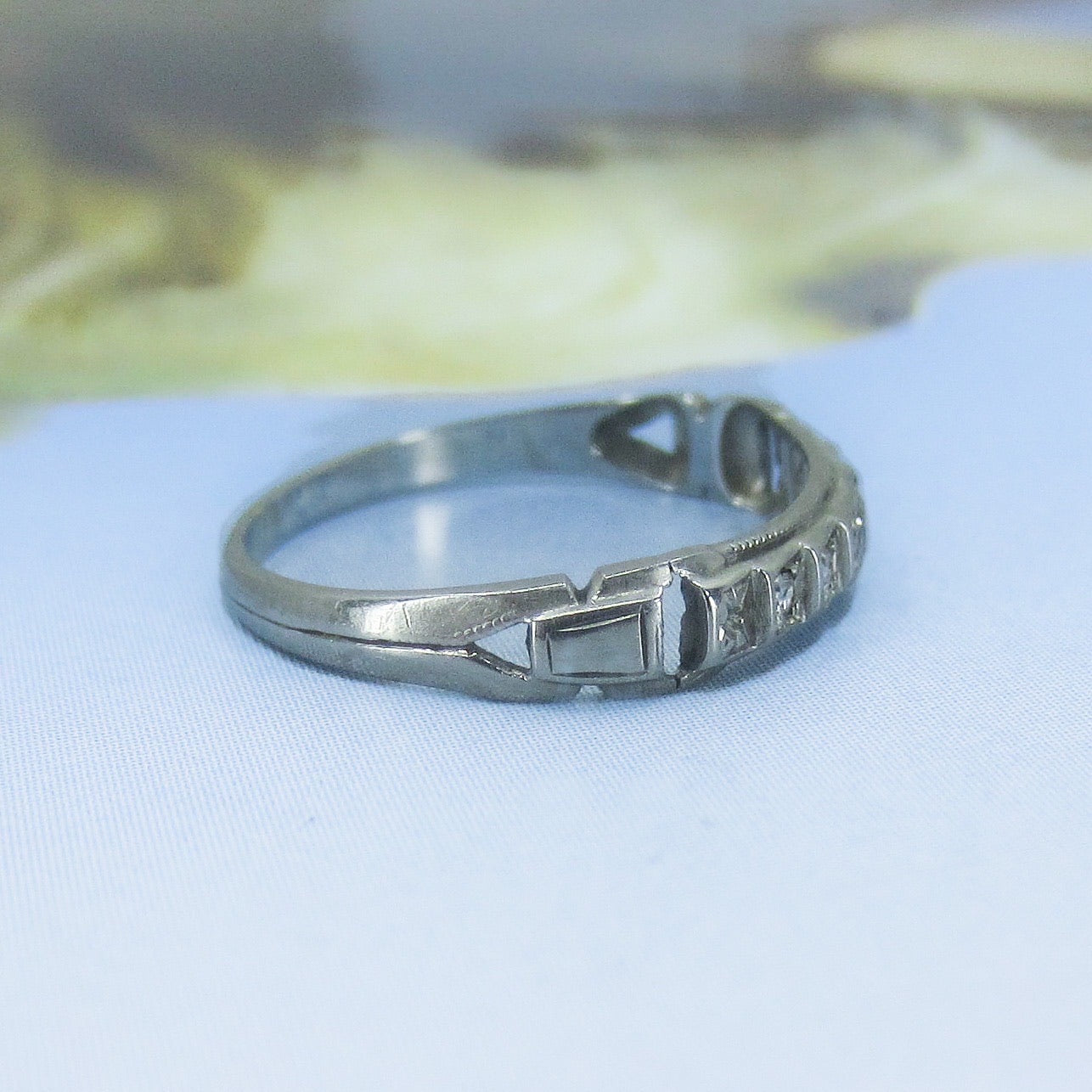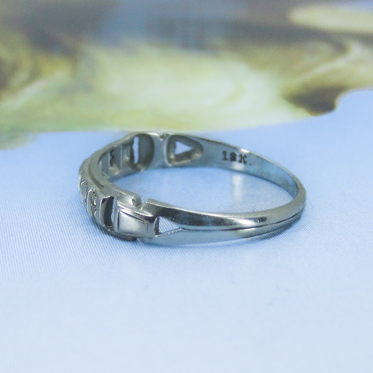 An Art Deco era diamond wedding band featuring five single cut diamonds, bead set in individual boxes that step down the sides which is so quintessentially Deco! There are tiny engraved flowers on either end and those great Deco open buckle-like shoulders. Made in 18k white gold circa 1930.