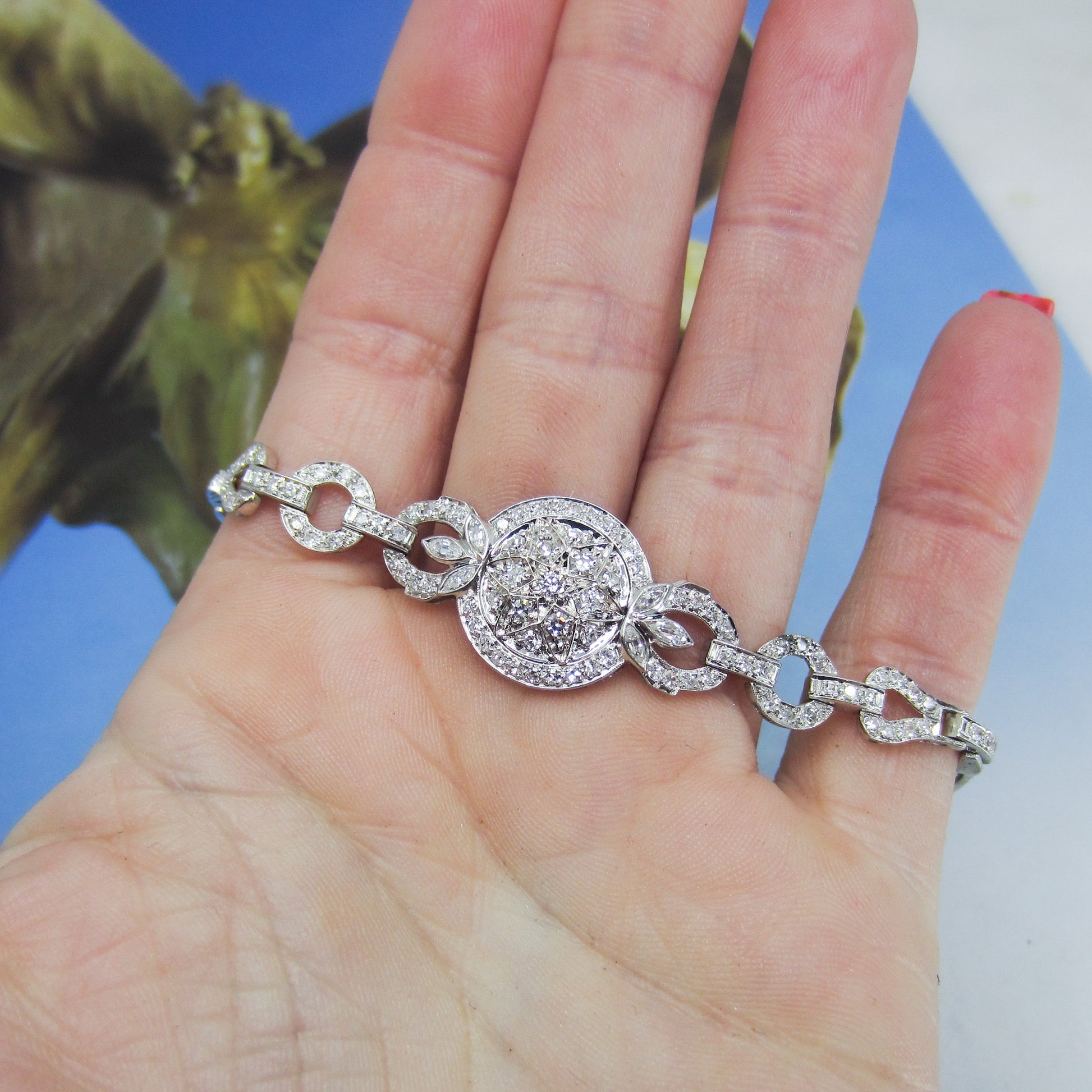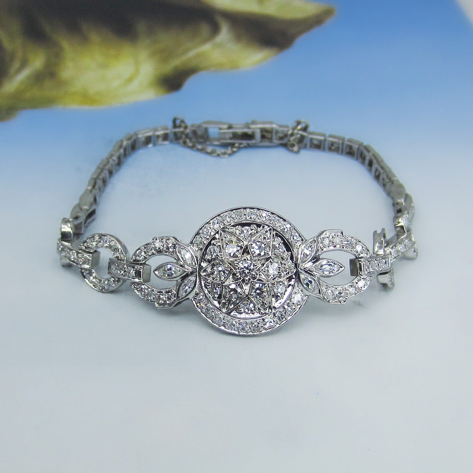 As sparkly as the night sky, this Art Deco era bracelet holds close to 6.20ctw of round and Marquise cut diamonds set in platinum and made circa 1930. It has a delicate, feminine look on and sits nice and flat. The diamonds are set in a star pattern in the center cluster and there are diamonds individually box set all the way around the band. Add some Deco gorgeousness to your day by putting this beauty on every morning!