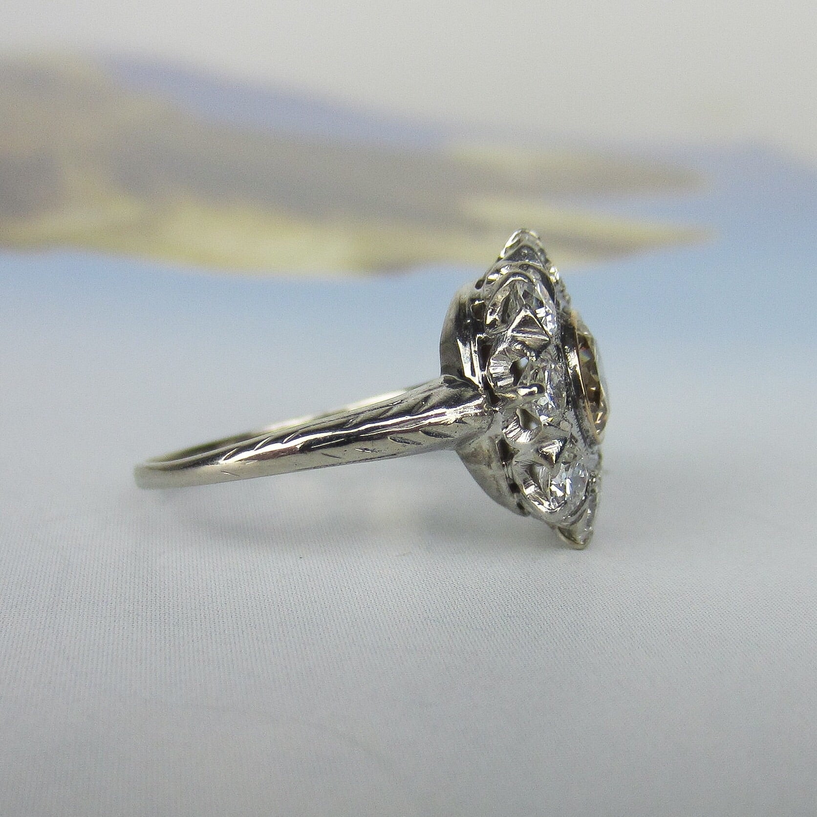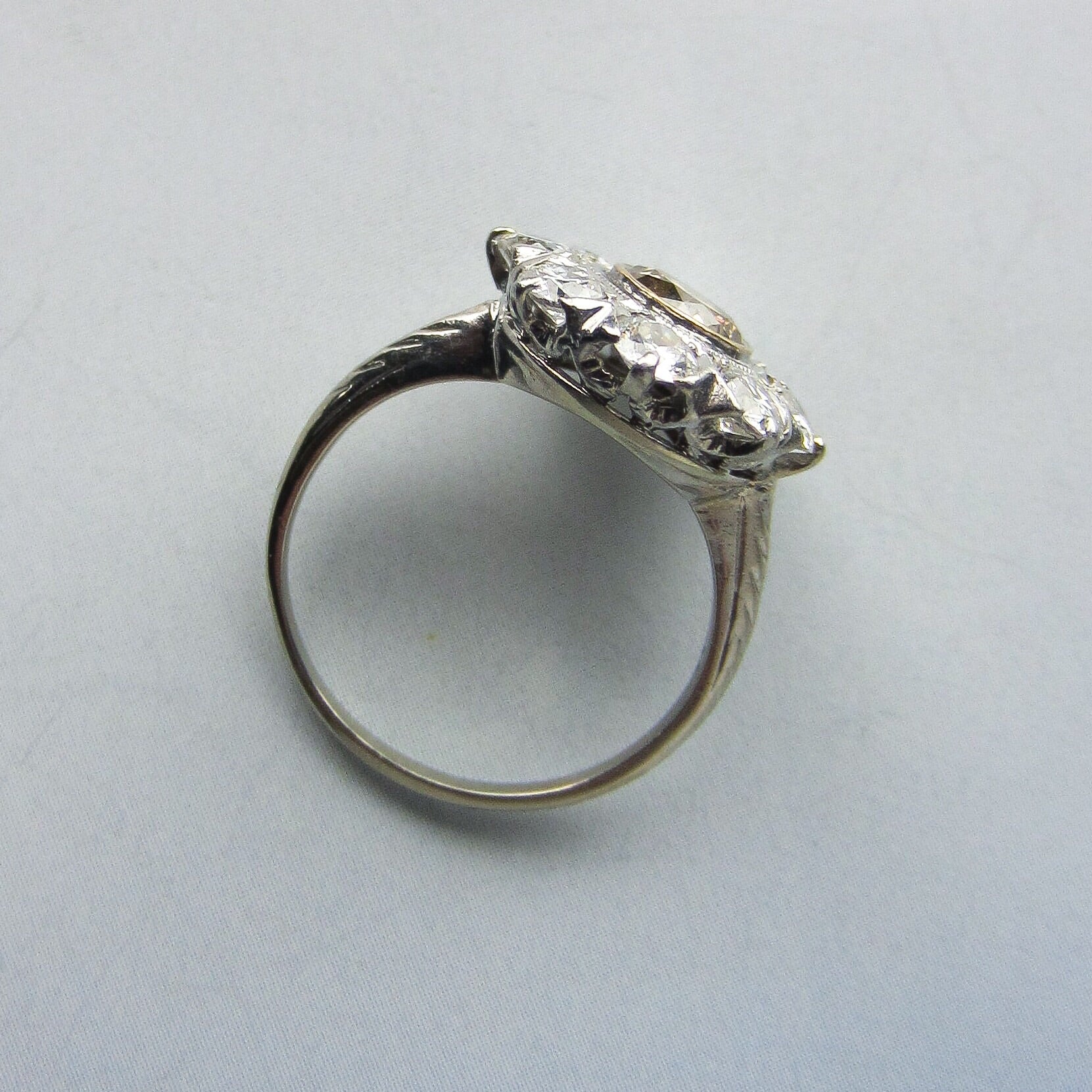 Condition note: It is possible that the center stone was either reset in yellow or changed. This was not done by us and this is how the ring came to the store. The central diamond cut is period to the rest of the ring, so it will remain a mystery!