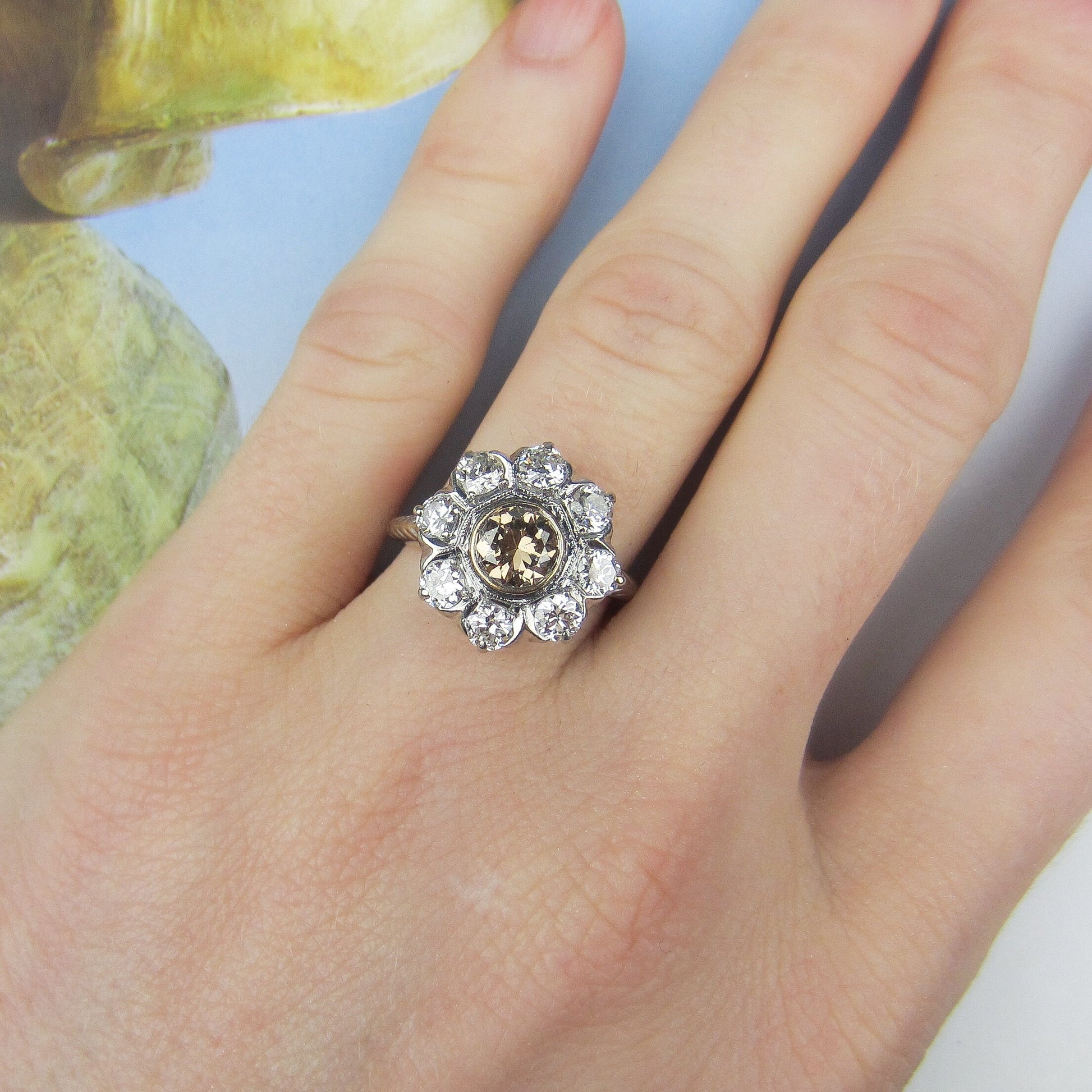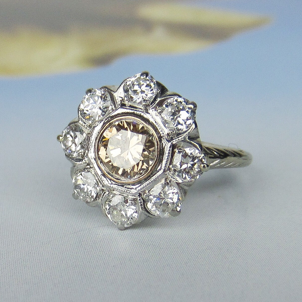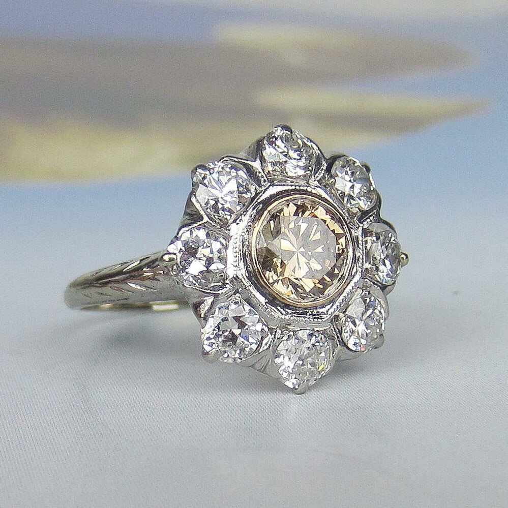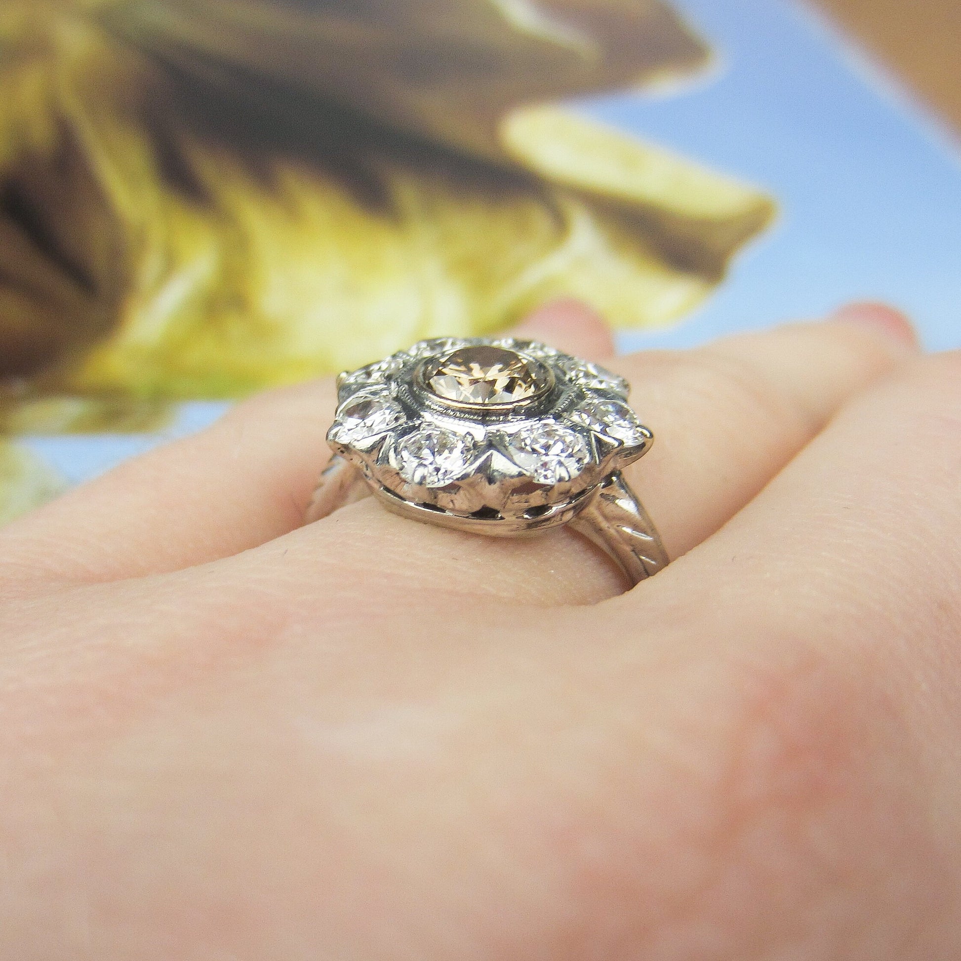 New favorite alert!! This insanely gorgeous diamond cluster ring hails from the 1930's to early 1940's and has it all--dazzling Old European cut rainbow sparkles AND a central diamond so lovely and complementary of color that it takes this ring to the next level! In this beautiful ring we find a .70ct Transitional Round Brilliant, set in a yellow gold bezel with eight Old European cut diamonds surrounding. The center diamond is most likely a fancy brown diamond but I'm going to grade it W-X in color due to that yellow bezel, with VS2 Clarity. The Old Europeans are G-H Color and SI2 Clarity. Put them together and you've got one amazing Deco ring! The setting is 14k white gold and sits very flat to the hand for those of you who want that cluster to sit LOW. And as you can see in the photo, it is so, so flattering on the hand. When this ring came in I put it on and test drove it for a bit--I'm going to tell you, it was pretty fun. And I already have a great cluster ring, but this one made me think twice! Whoever gets this beauty will LOVE looking down at their hand, looking in the mirror, catching a glimpse in a window--you can see this one from across the room guys!