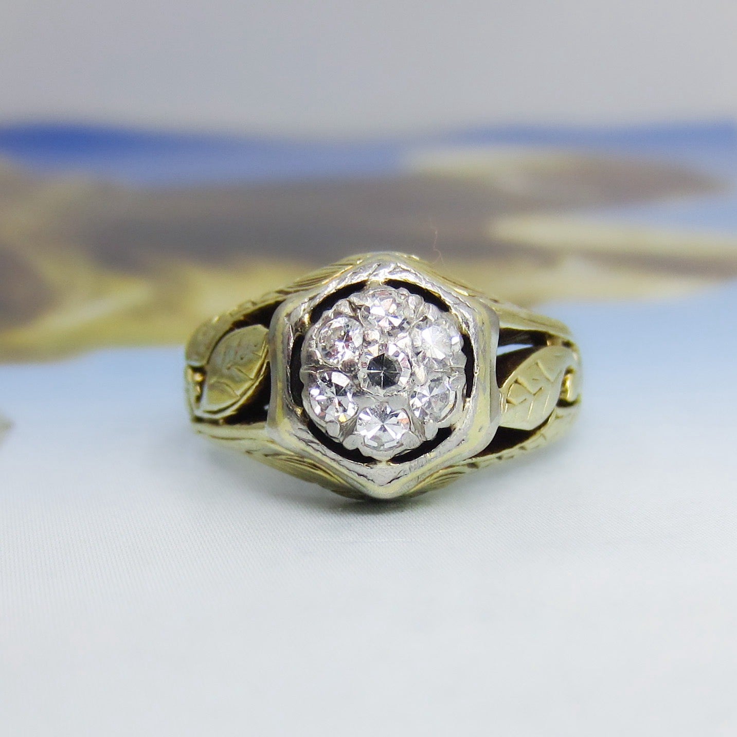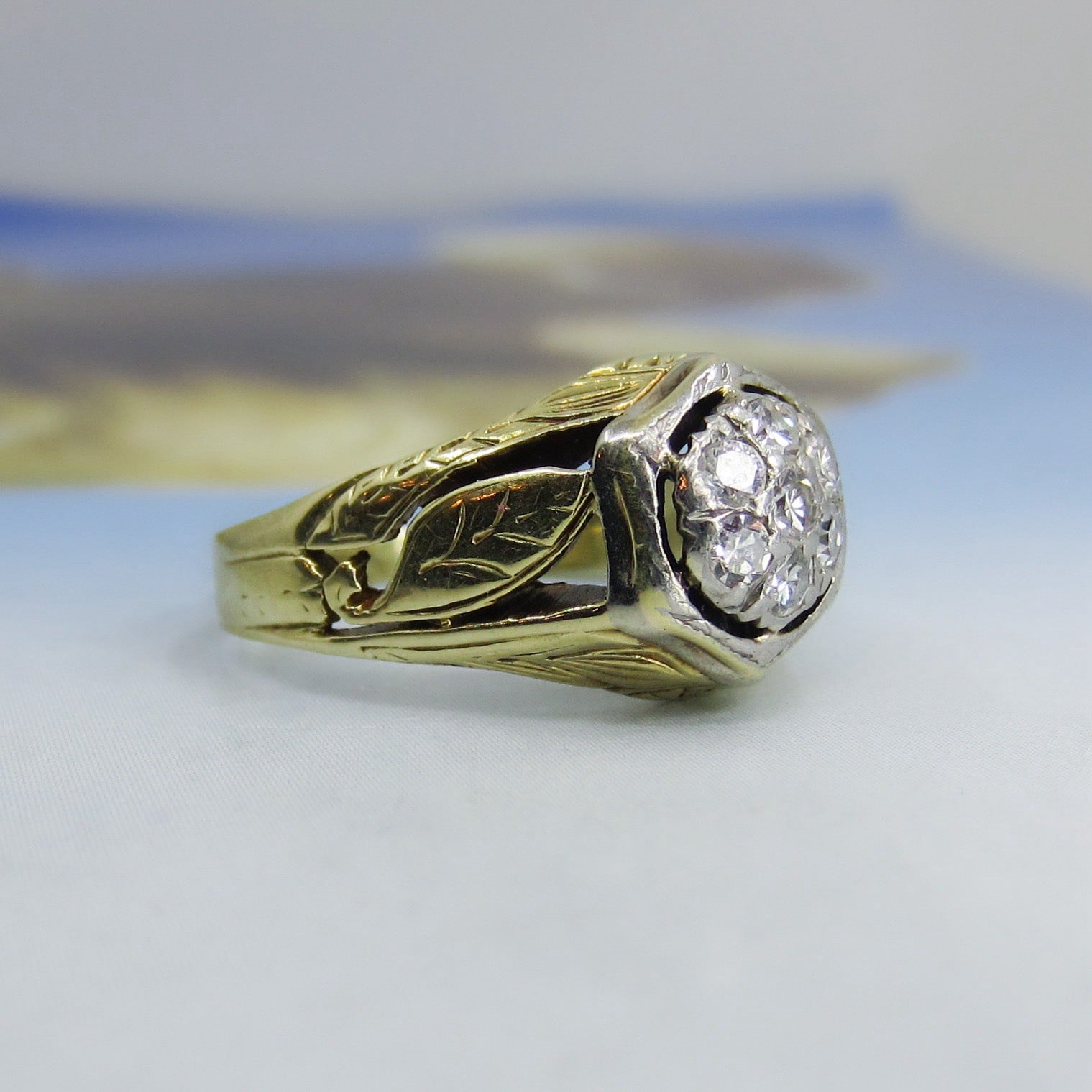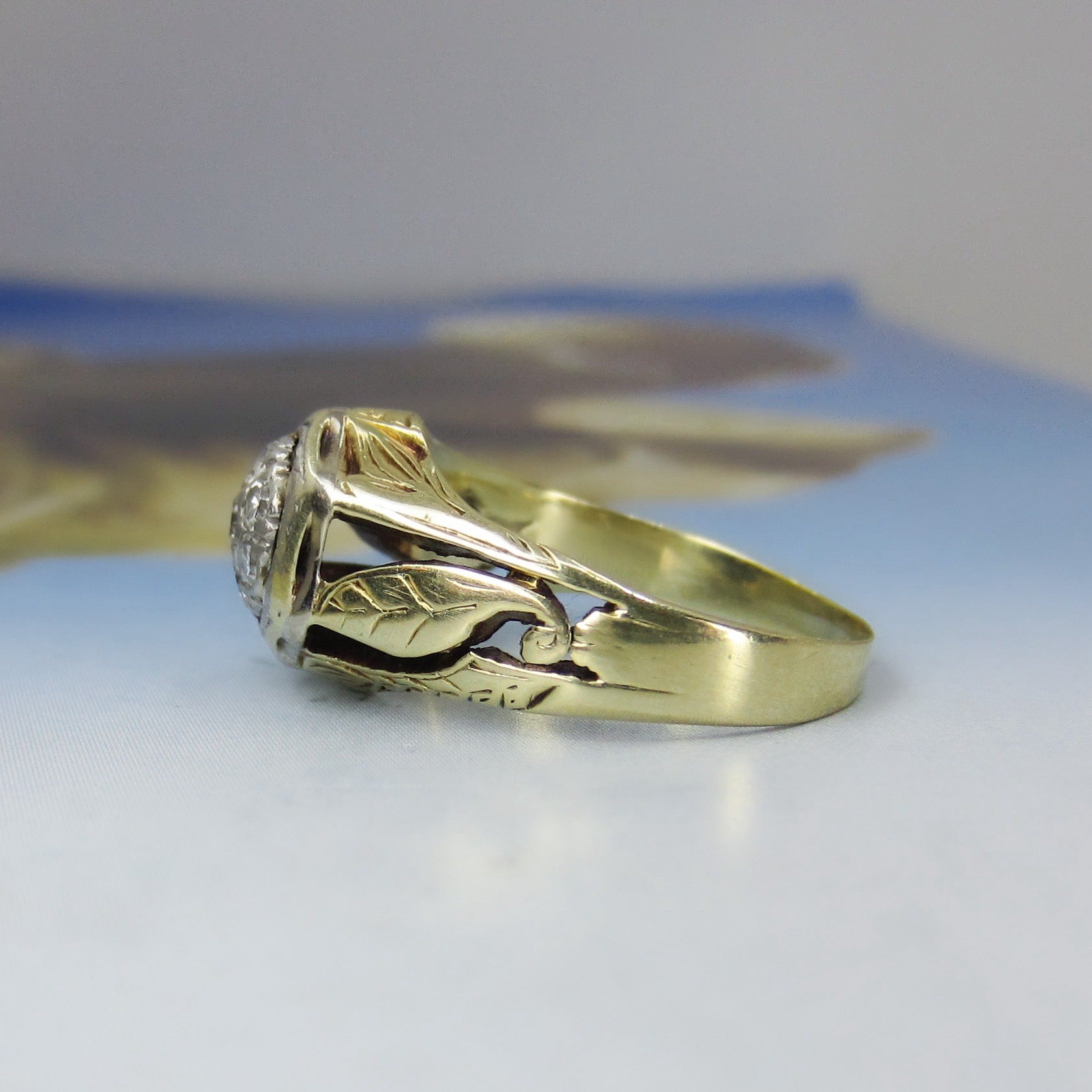 A strikingly designed Art Deco ring with a central diamond cluster set in platinum and a 14k yellow gold leaf motif mounting. Circa 1930's.