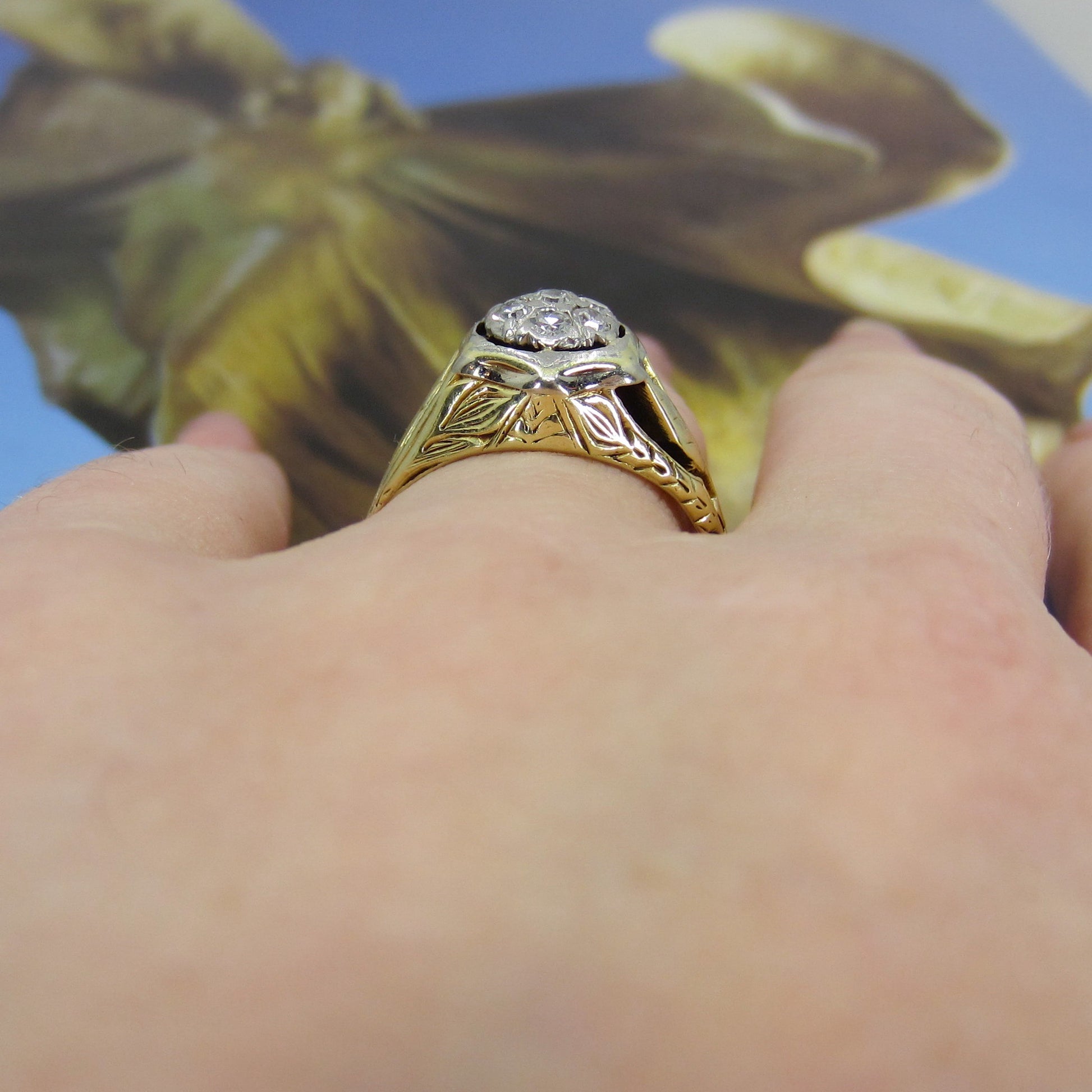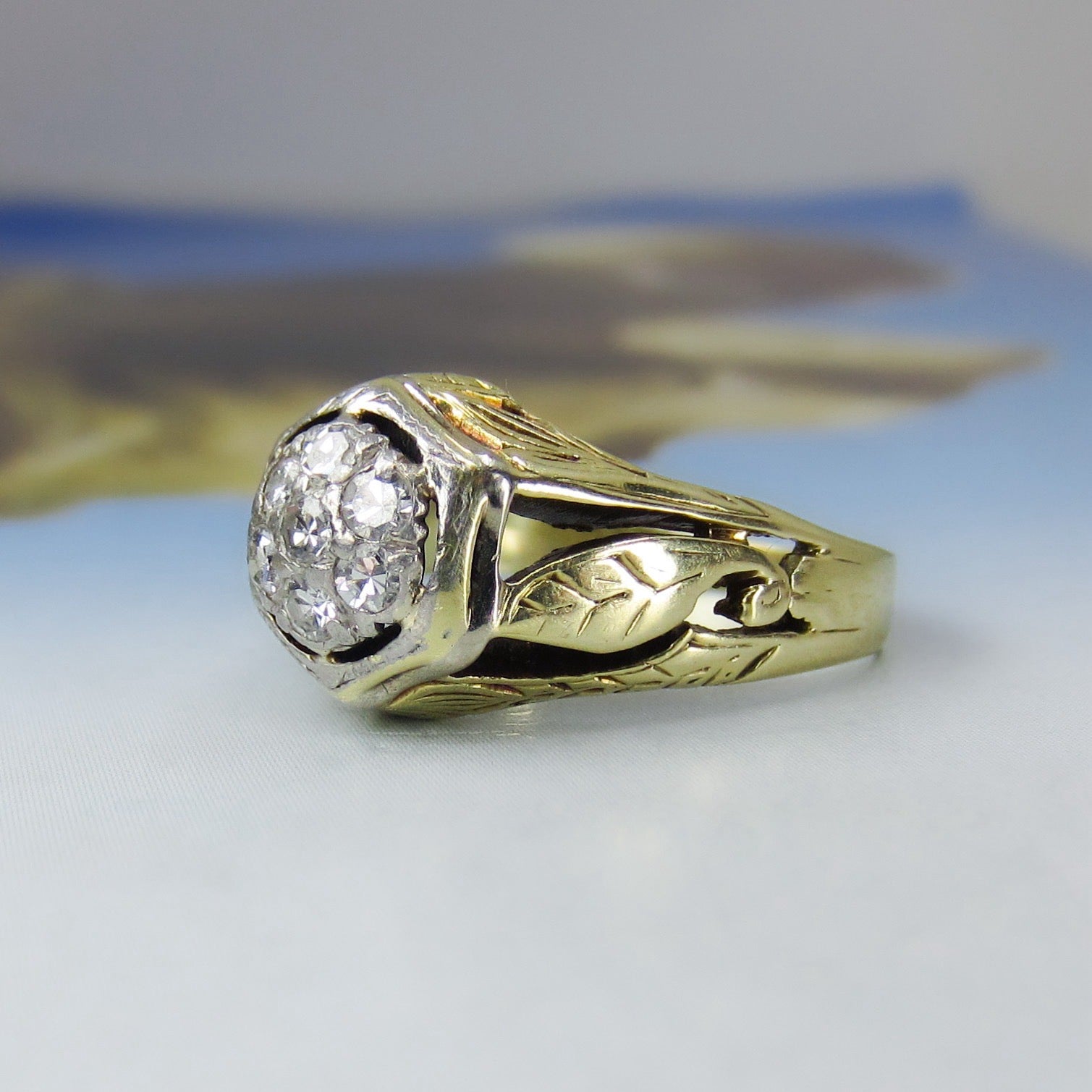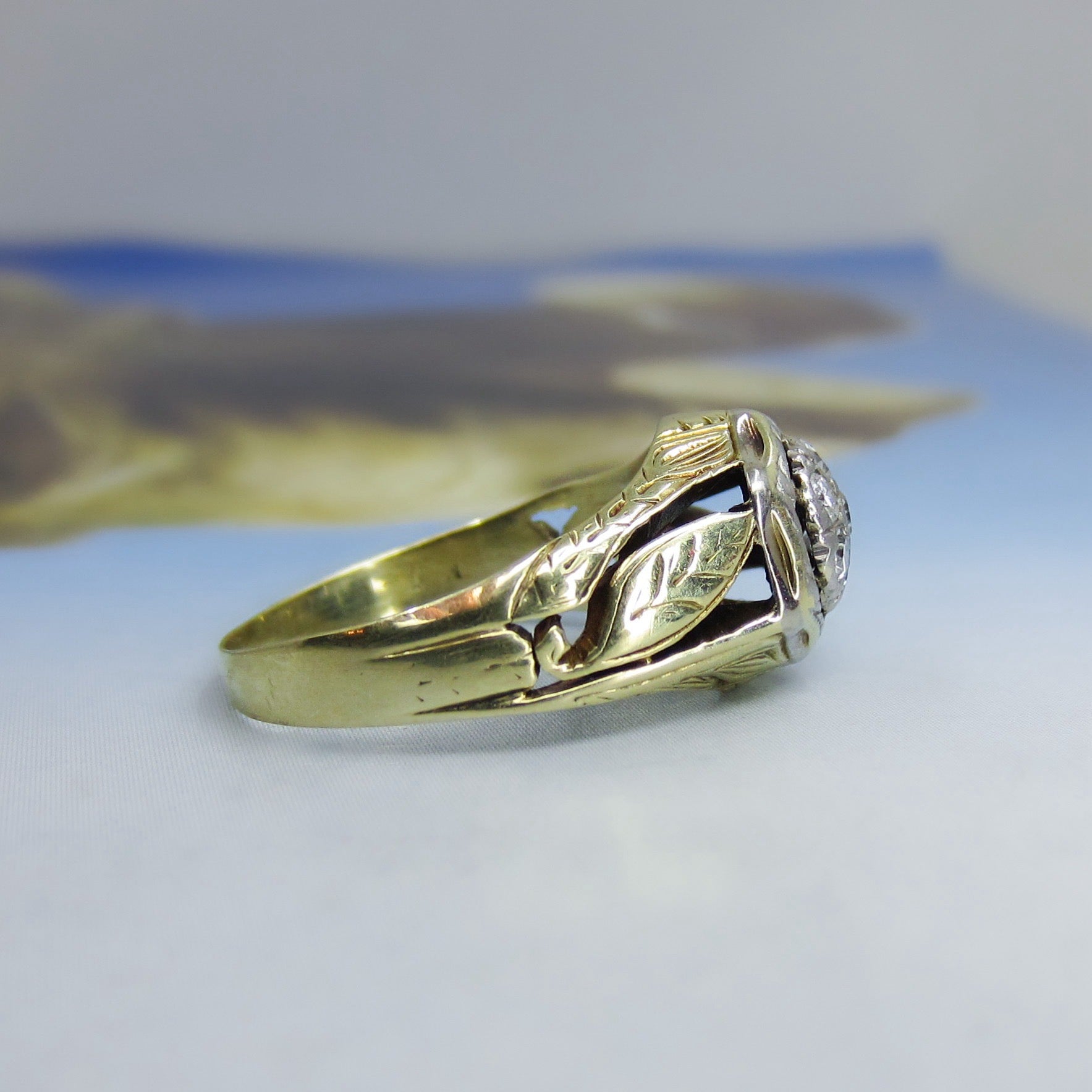 A strikingly designed Art Deco ring with a central diamond cluster set in platinum and a 14k yellow gold leaf motif mounting. Circa 1930's.