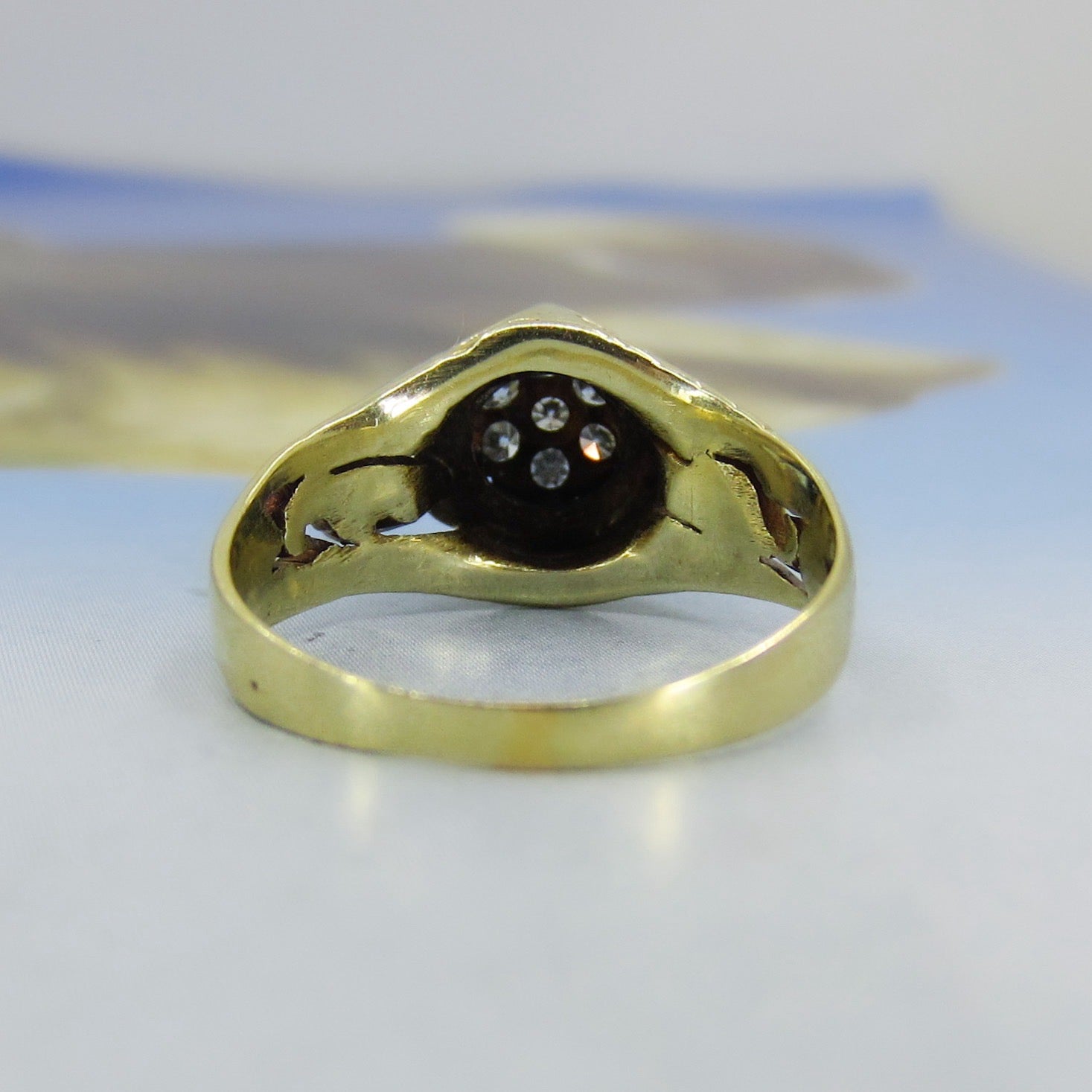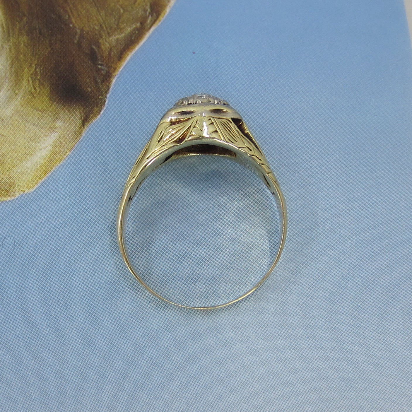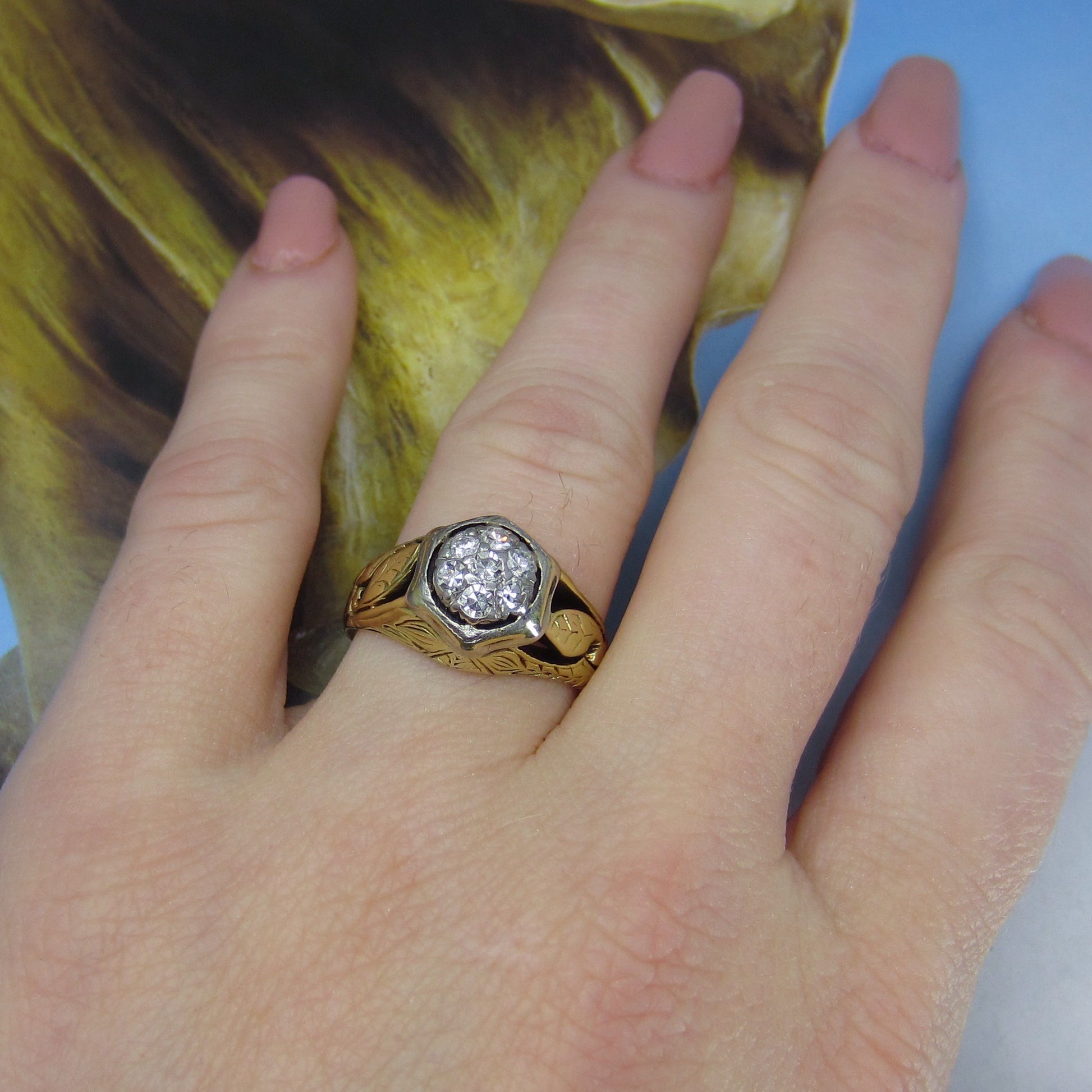 Contains seven old single cut diamonds weighing approximately .35ctw with F-G Color and VS2-SI1 Clarity.