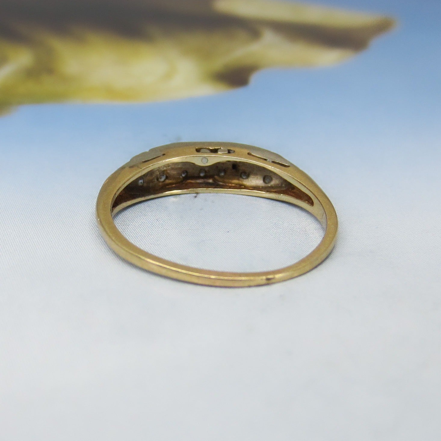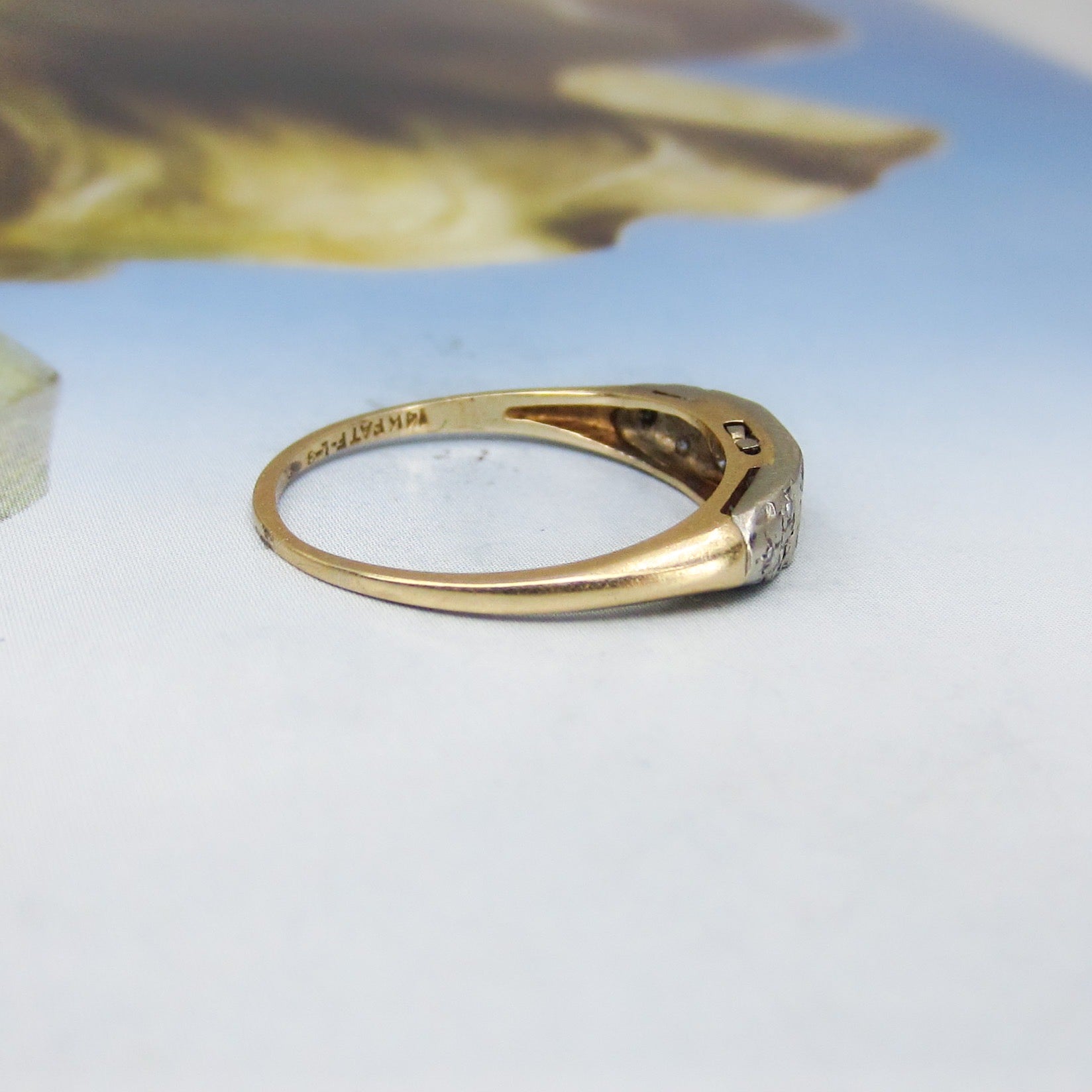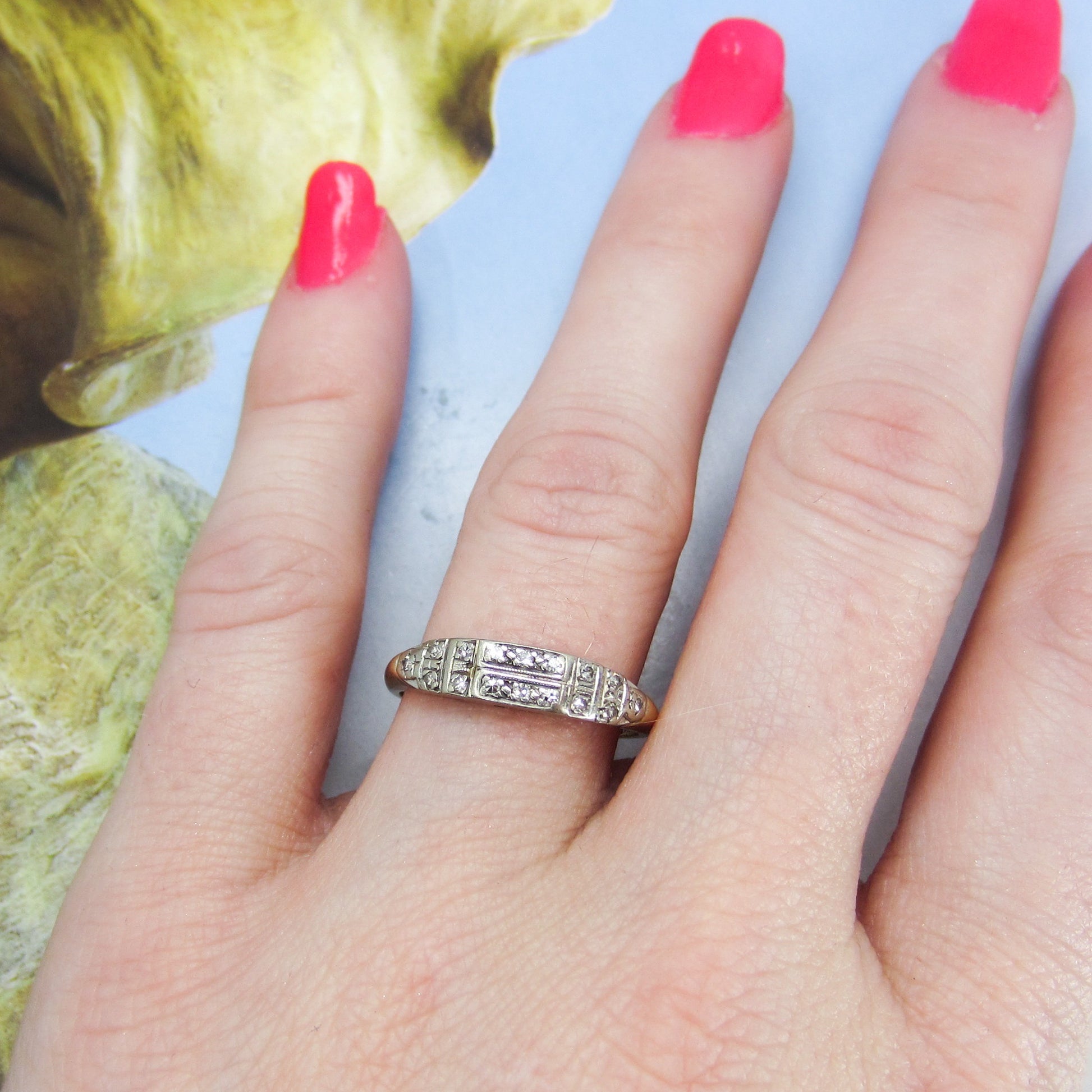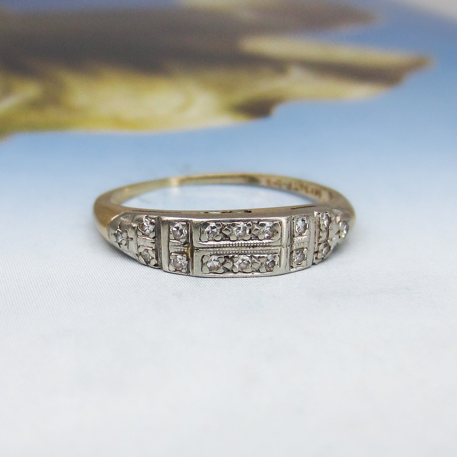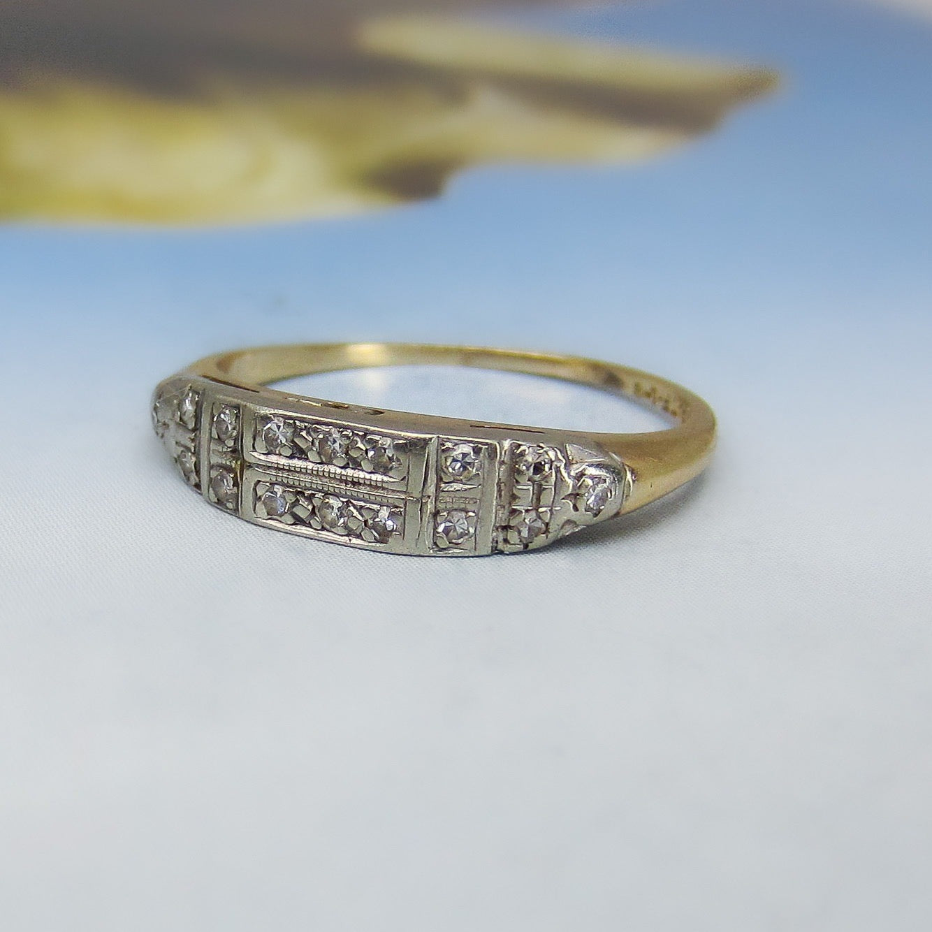 This late Art Deco band has such great detail, with a double row of bead set diamonds in hand millegrained boxes with angled geometric sides. Made in 14k white and yellow gold circa 1940.