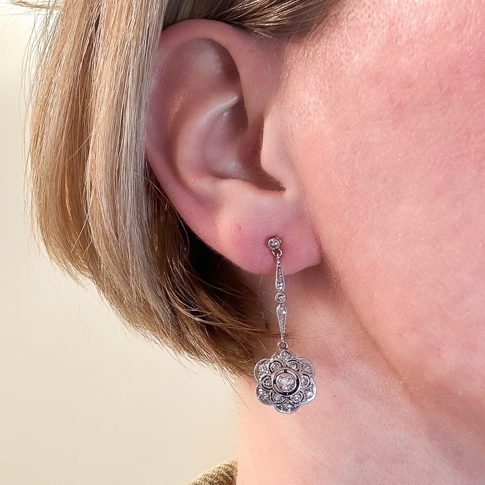 How incredible would it be to be wearing these beauties on New Year's Eve?!! Made circa 1920, these lovely earrings are set with sparkling old cut diamonds set in platinum topped 18k yellow gold. Every single bit of these earrings have been designed and detailed with care, from the hand-worked millegrain on every edge to the openwork of the floral cluster and they even look beautiful from the back! These would make an amazing and special gift, either for the holidays or for a bride-to-be - but don't hesitate to treat yourself too!