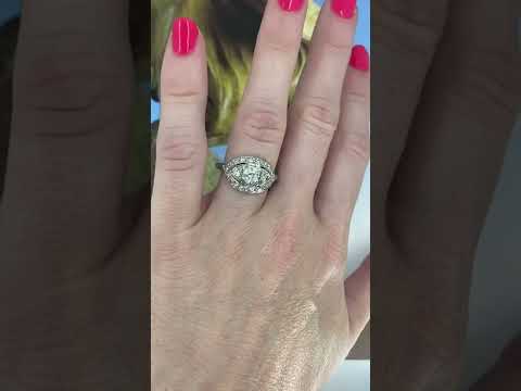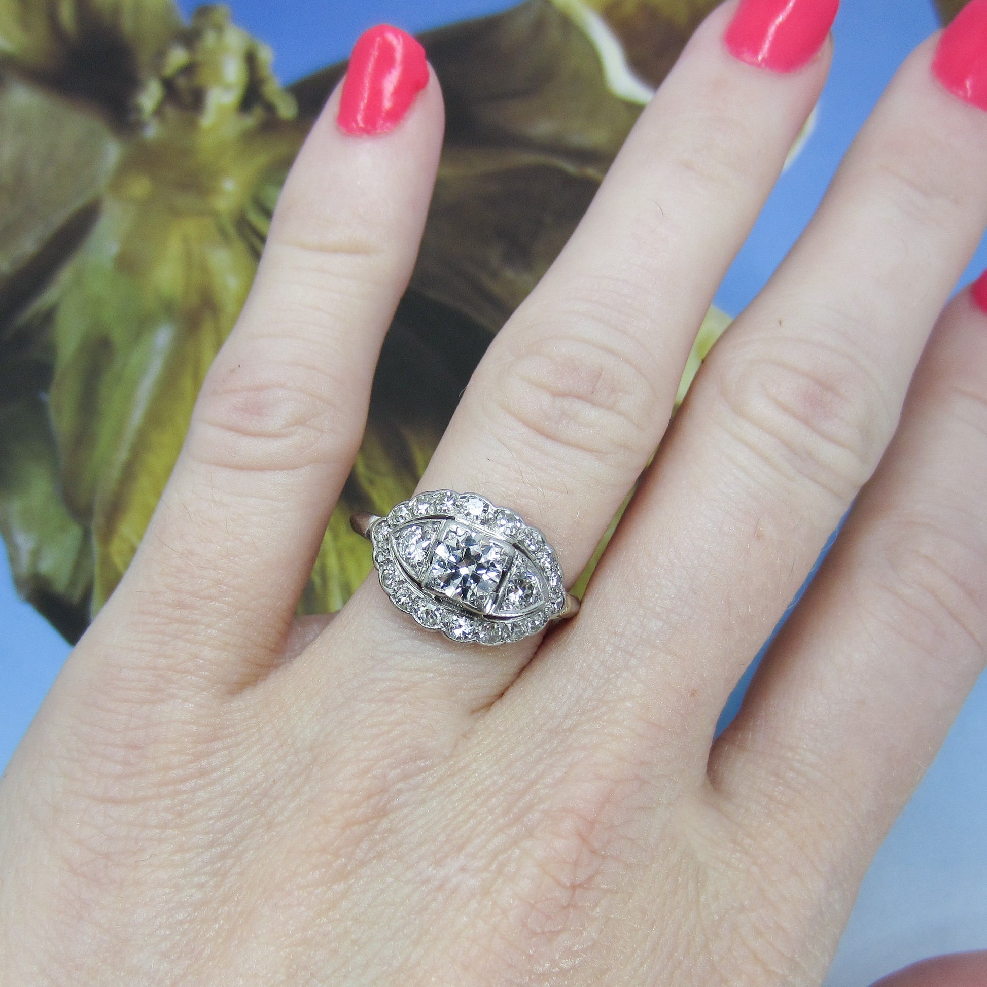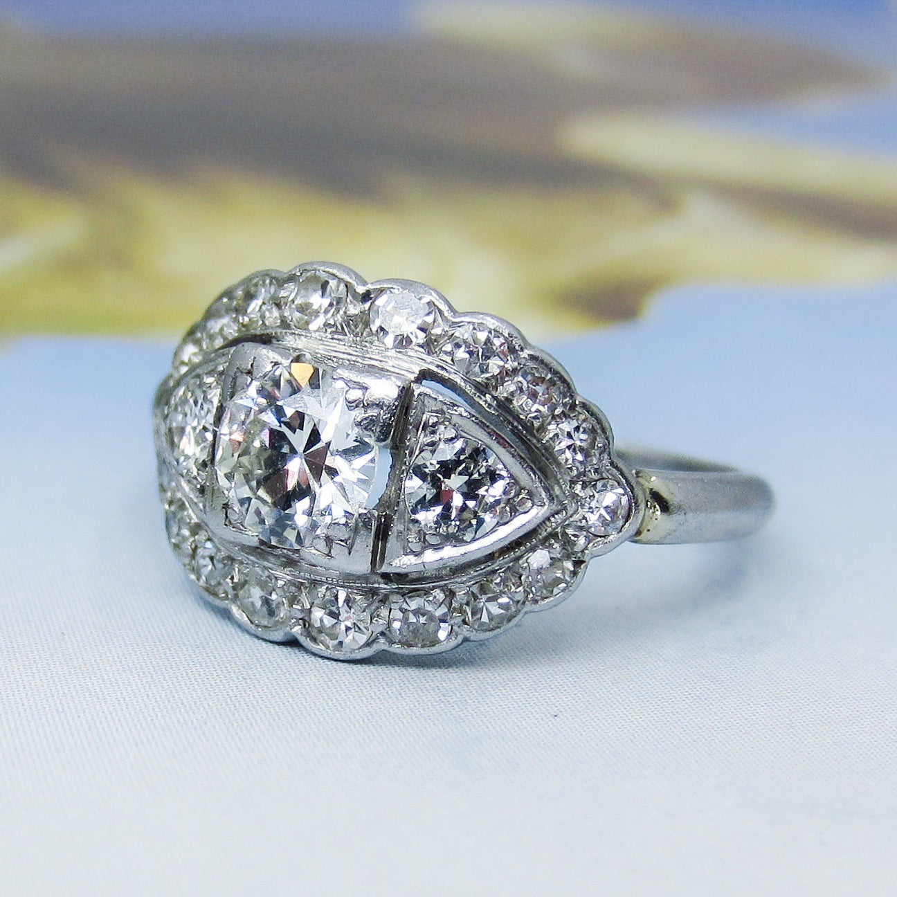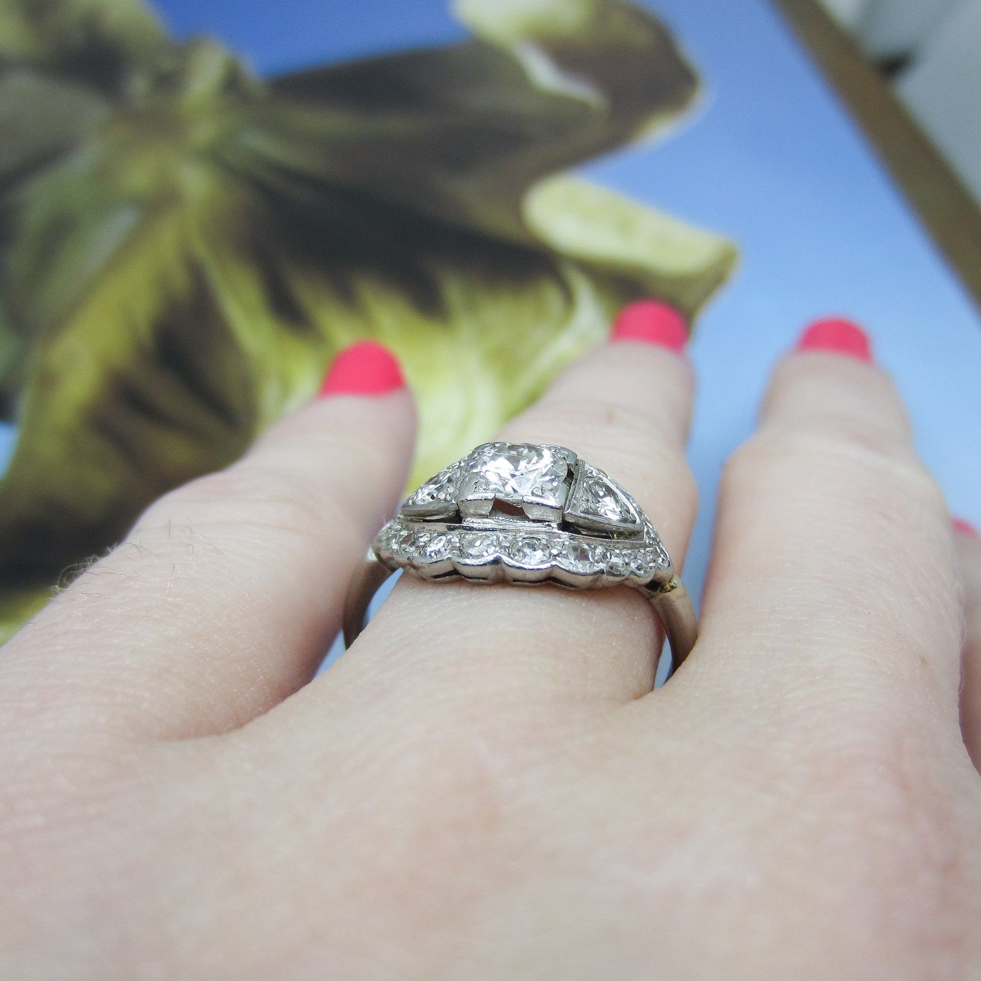 A stunner of an Art Deco engagement ring! This beauty holds a .55ct Old European Cut central diamond flanked by two Old Euros and surrounded by a frame of old single cut diamonds. Set in platinum and made circa 1930, this ring sits flat against the hand and is great for every day wear!