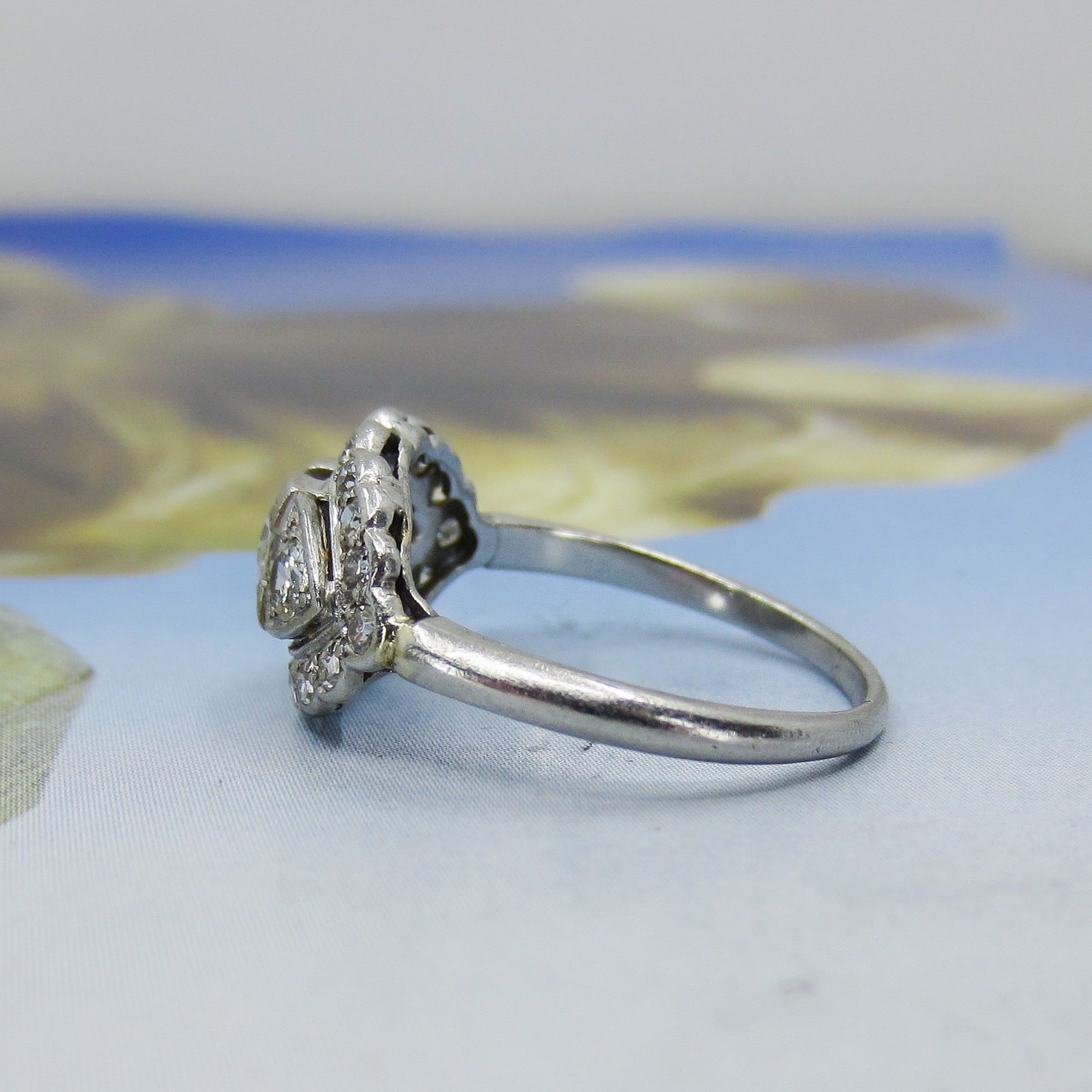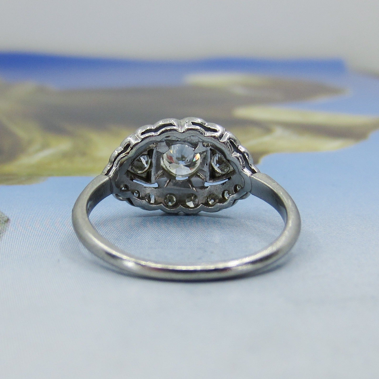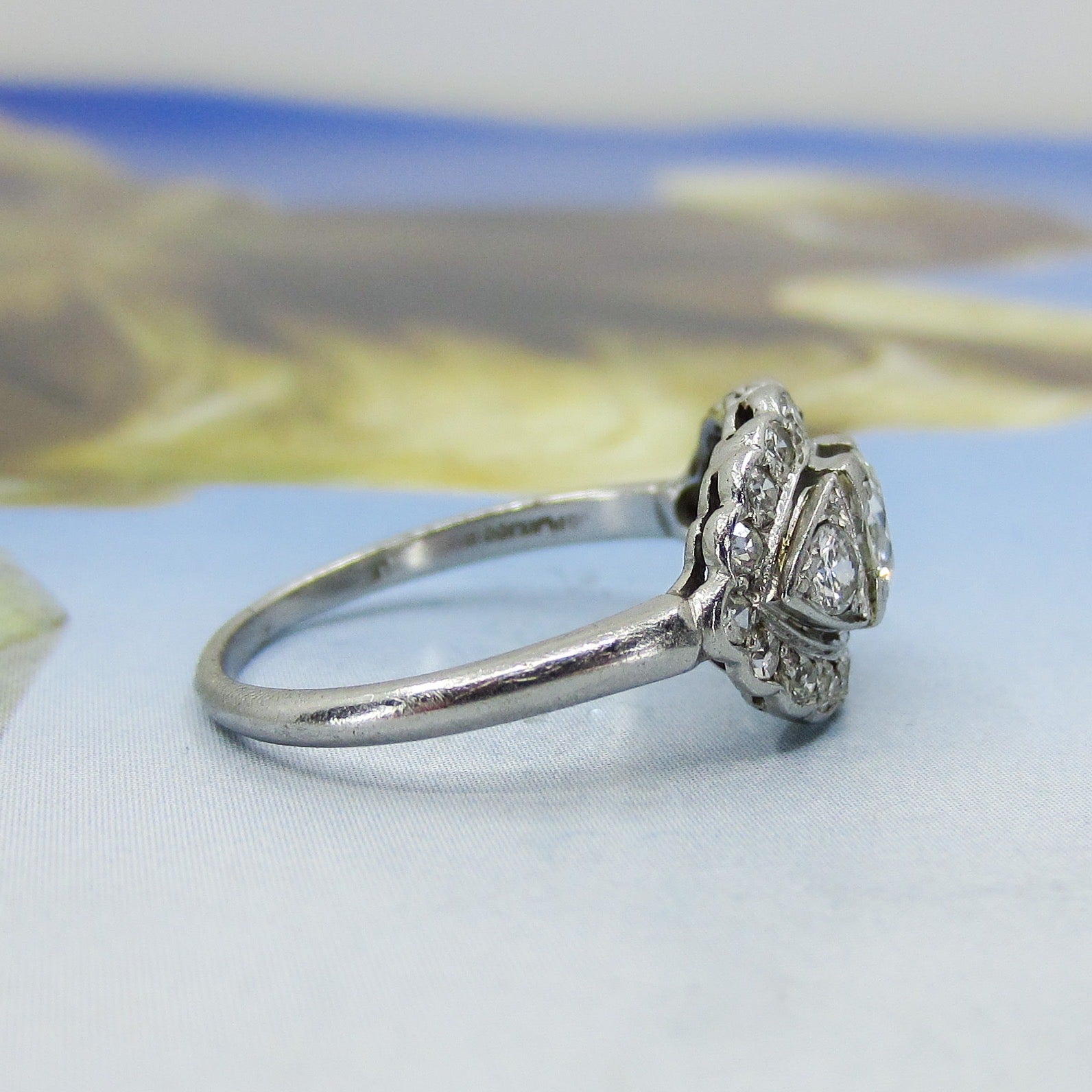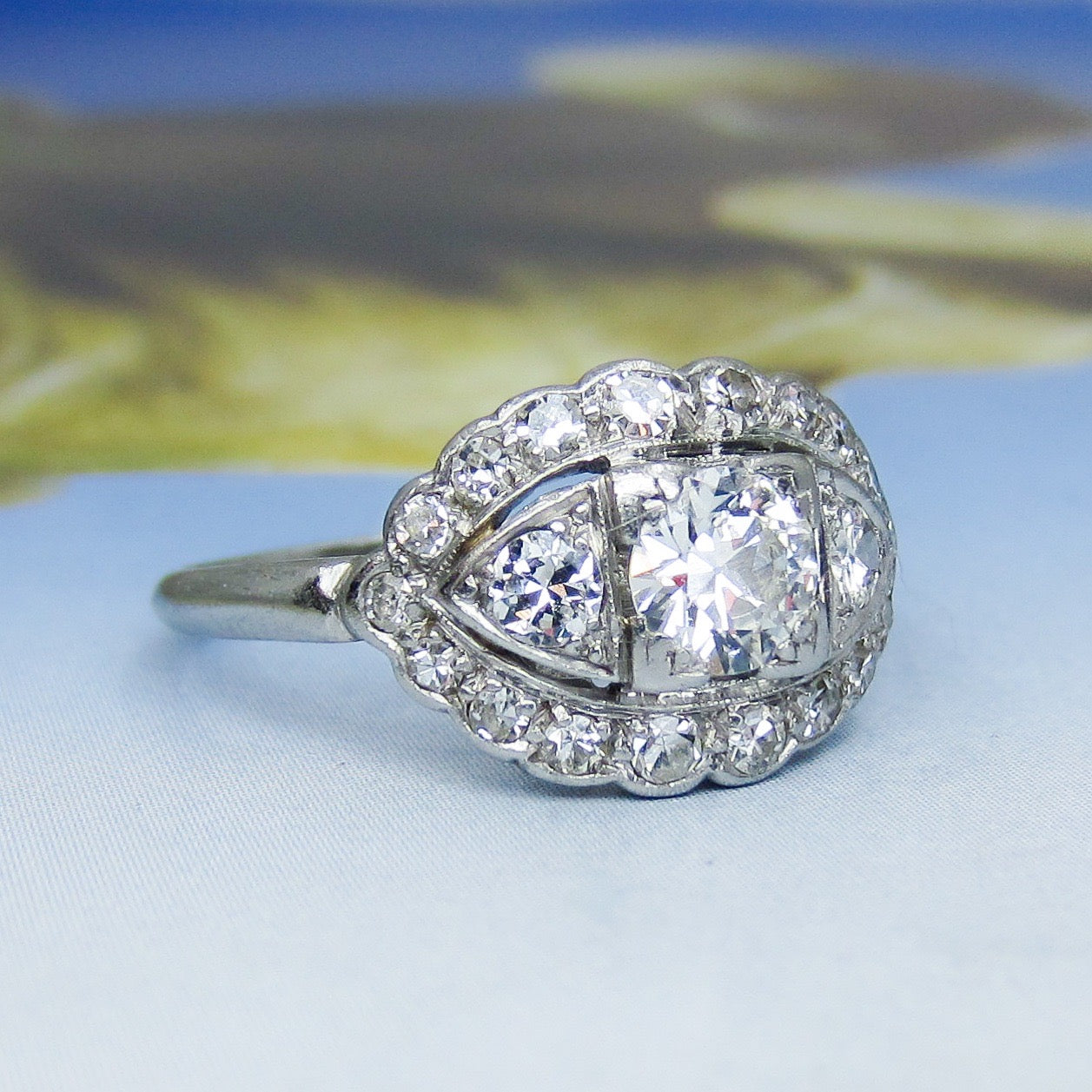 A stunner of an Art Deco engagement ring! This beauty holds a .55ct Old European Cut central diamond flanked by two Old Euros and surrounded by a frame of old single cut diamonds. Set in platinum and made circa 1930, this ring sits flat against the hand and is great for every day wear!