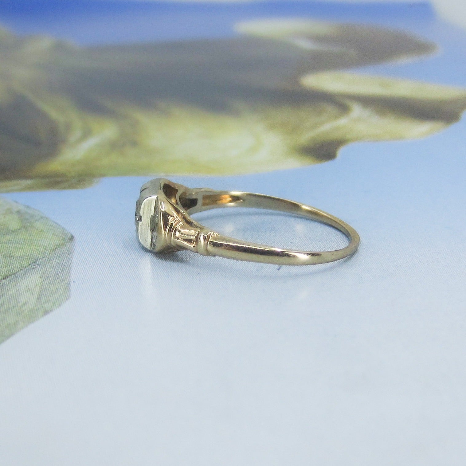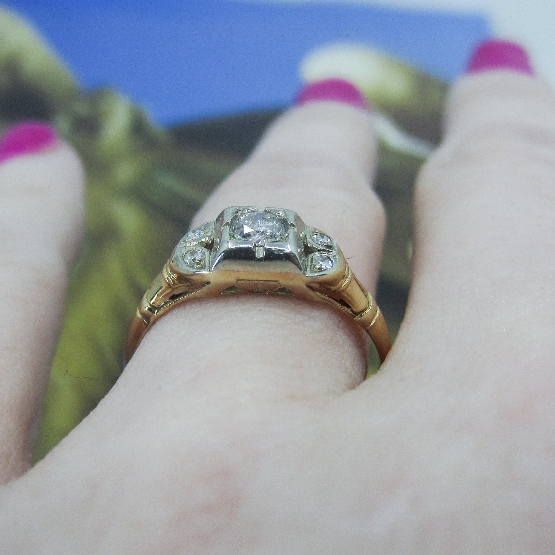 A lovely and dainty late Art Deco ring from the 1930's to early 40's with a square set Transitional Round Brilliant Cut diamond flanked by two diamond set leaves on either side, in 14k white gold with a yellow gold gallery and shank. This ring is super pretty and is perfect for someone who loves Art Deco but is looking for something simple and classic. Stacks perfectly with a wedding band!