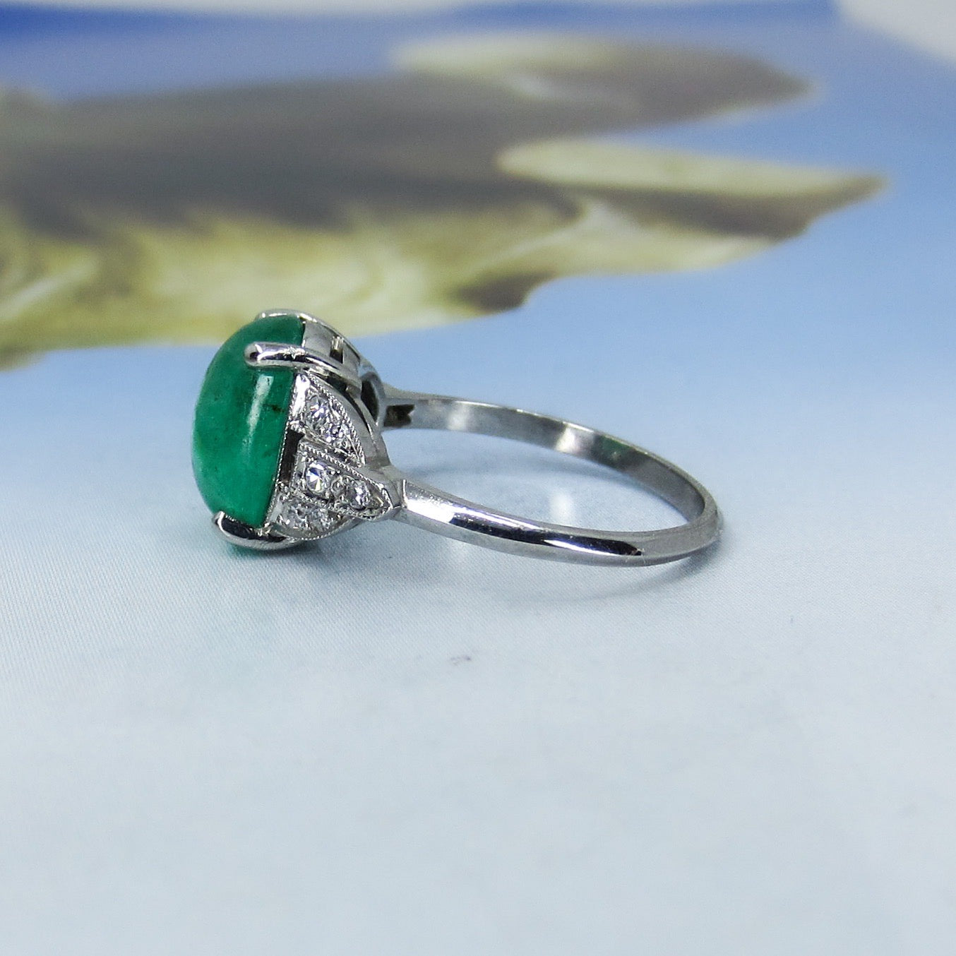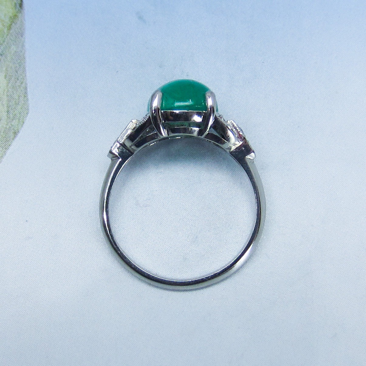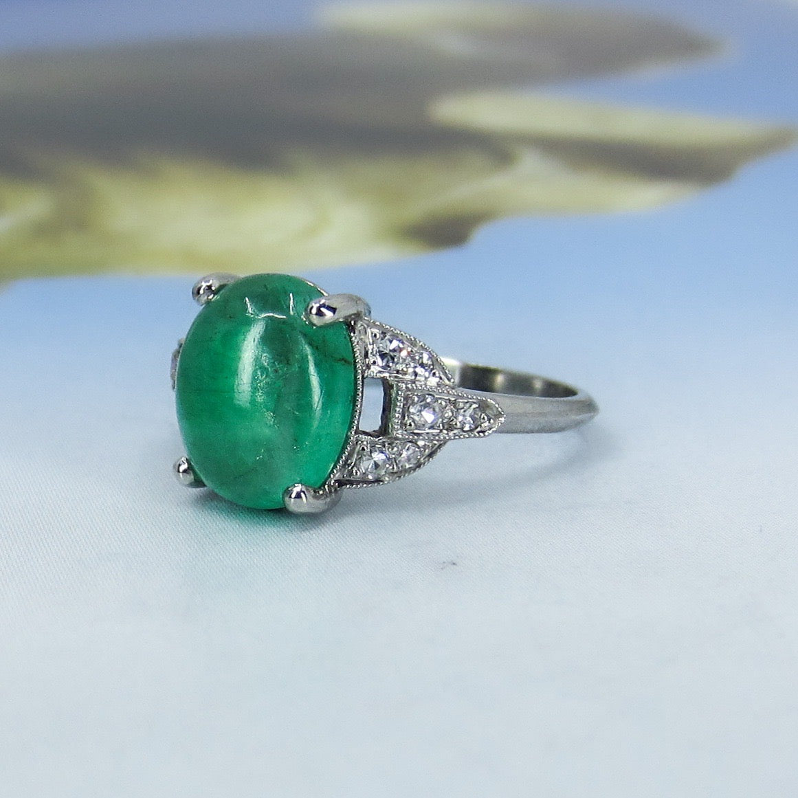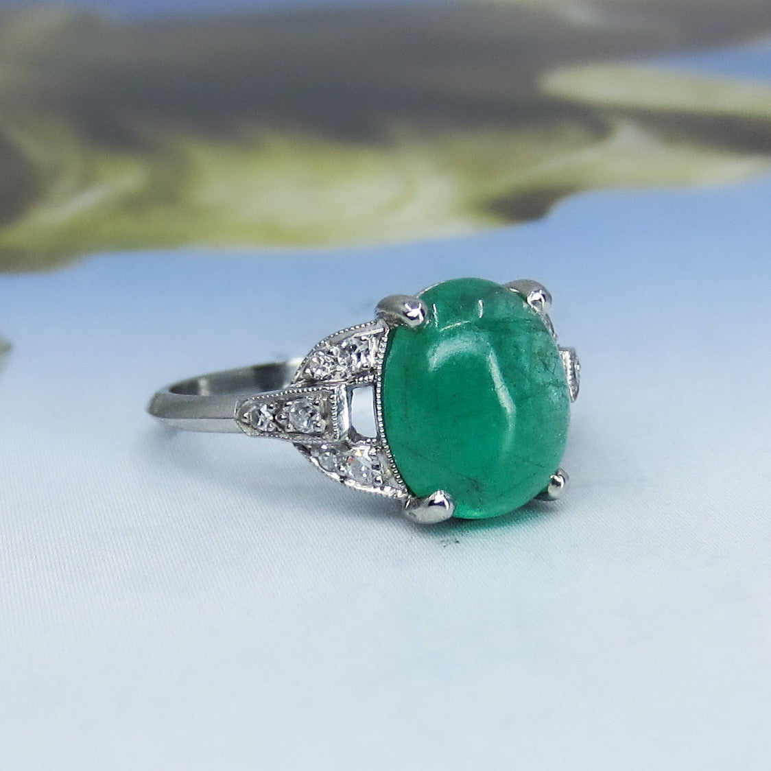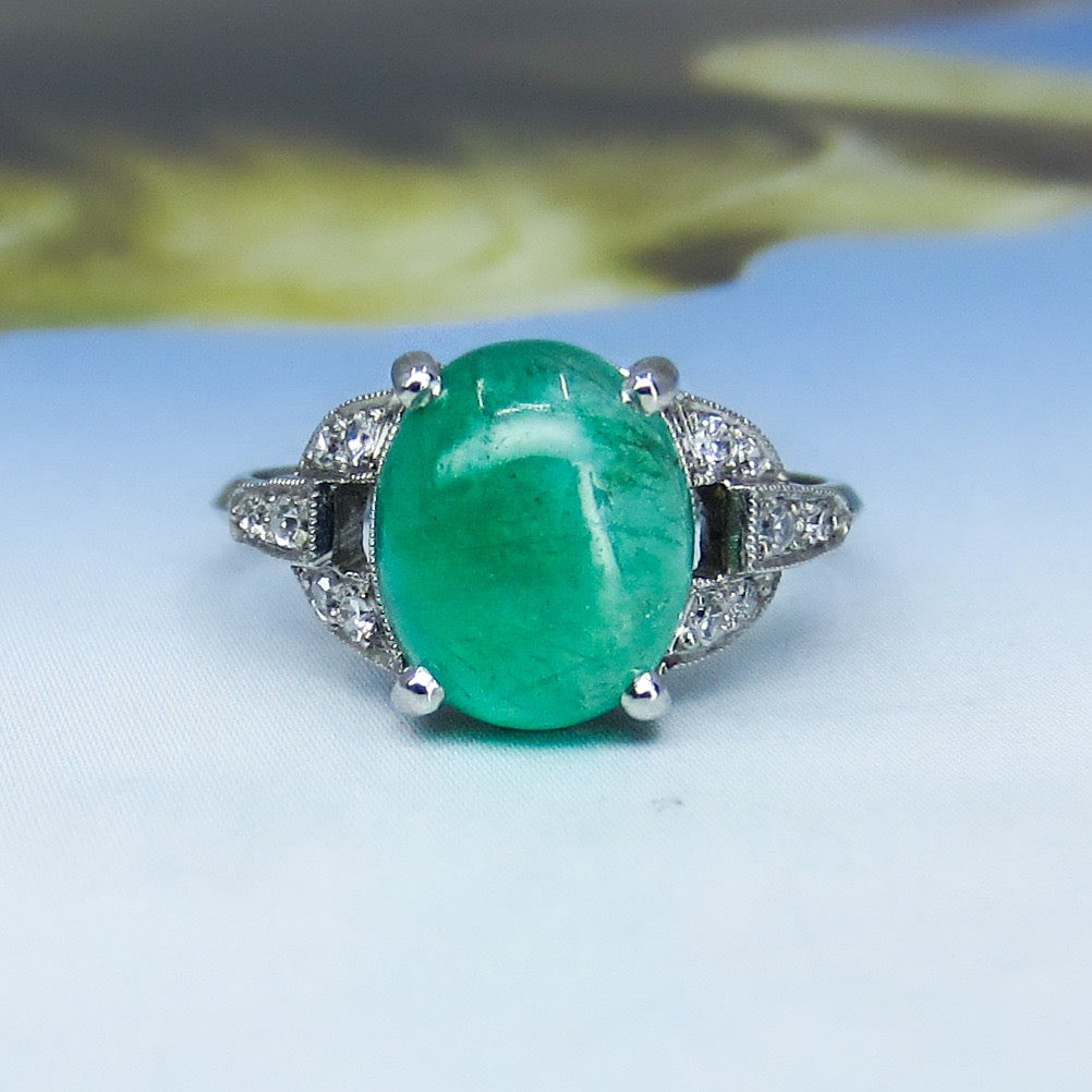 SOLD-Art Deco Emerald Cabochon and Diamond Ring Platinum c. 1930