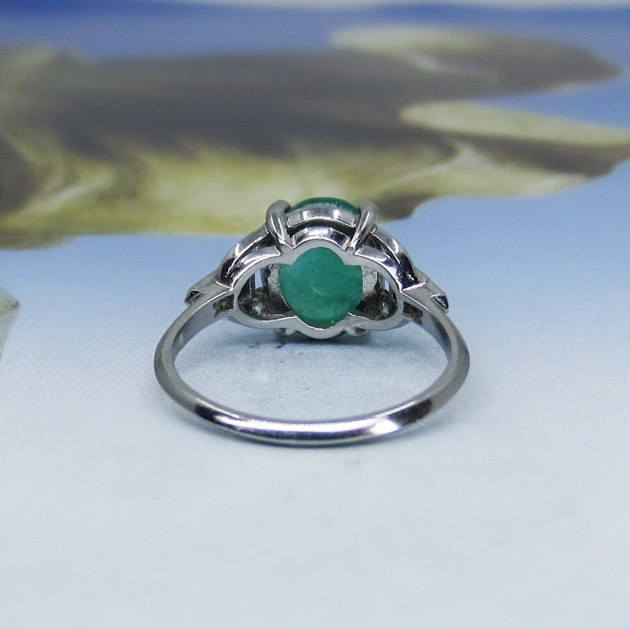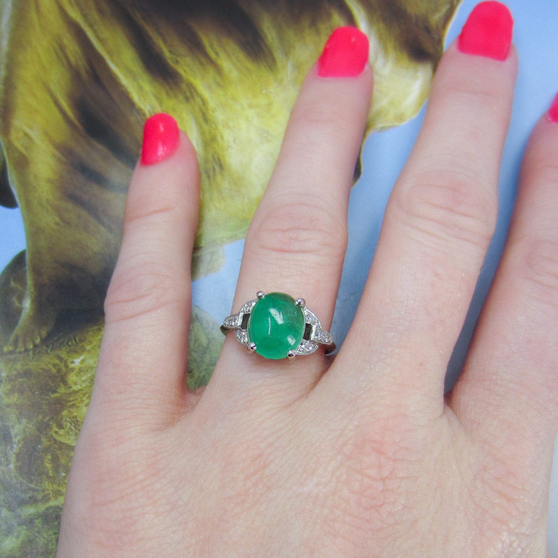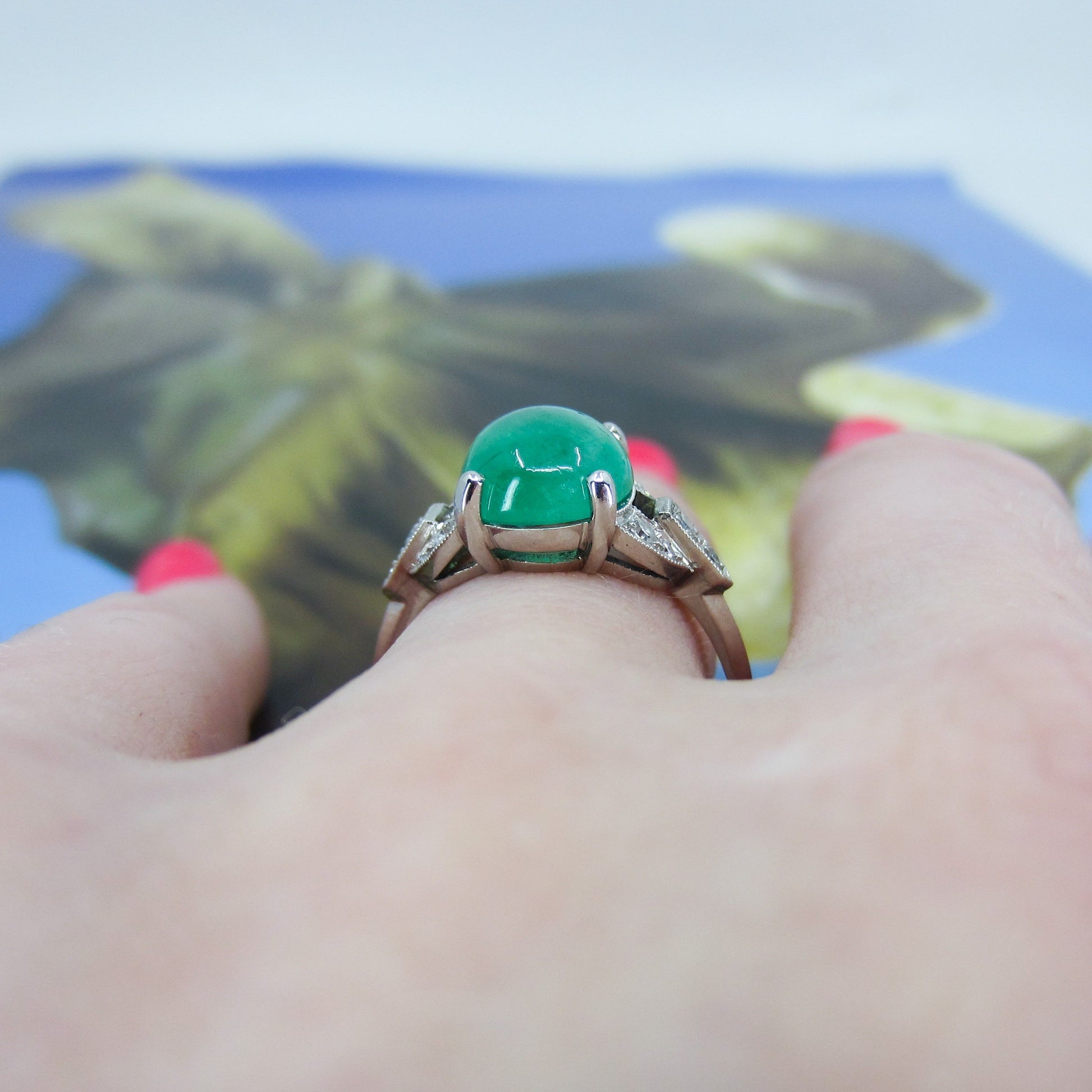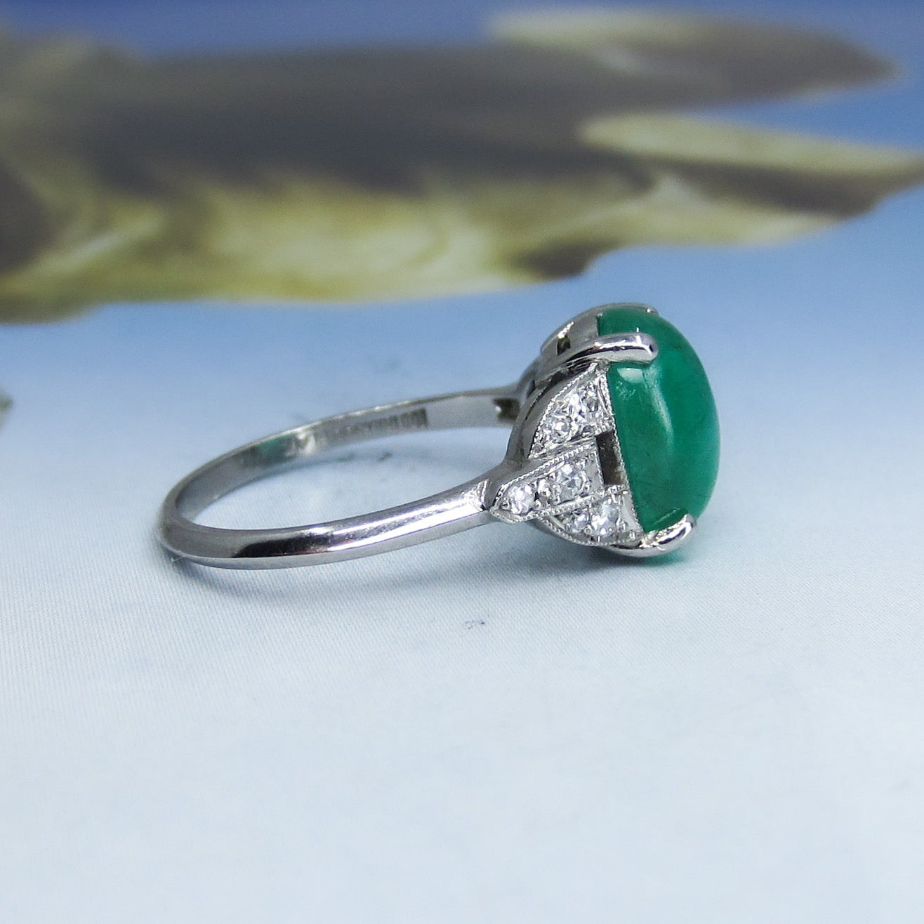 SOLD-Art Deco Emerald Cabochon and Diamond Ring Platinum c. 1930